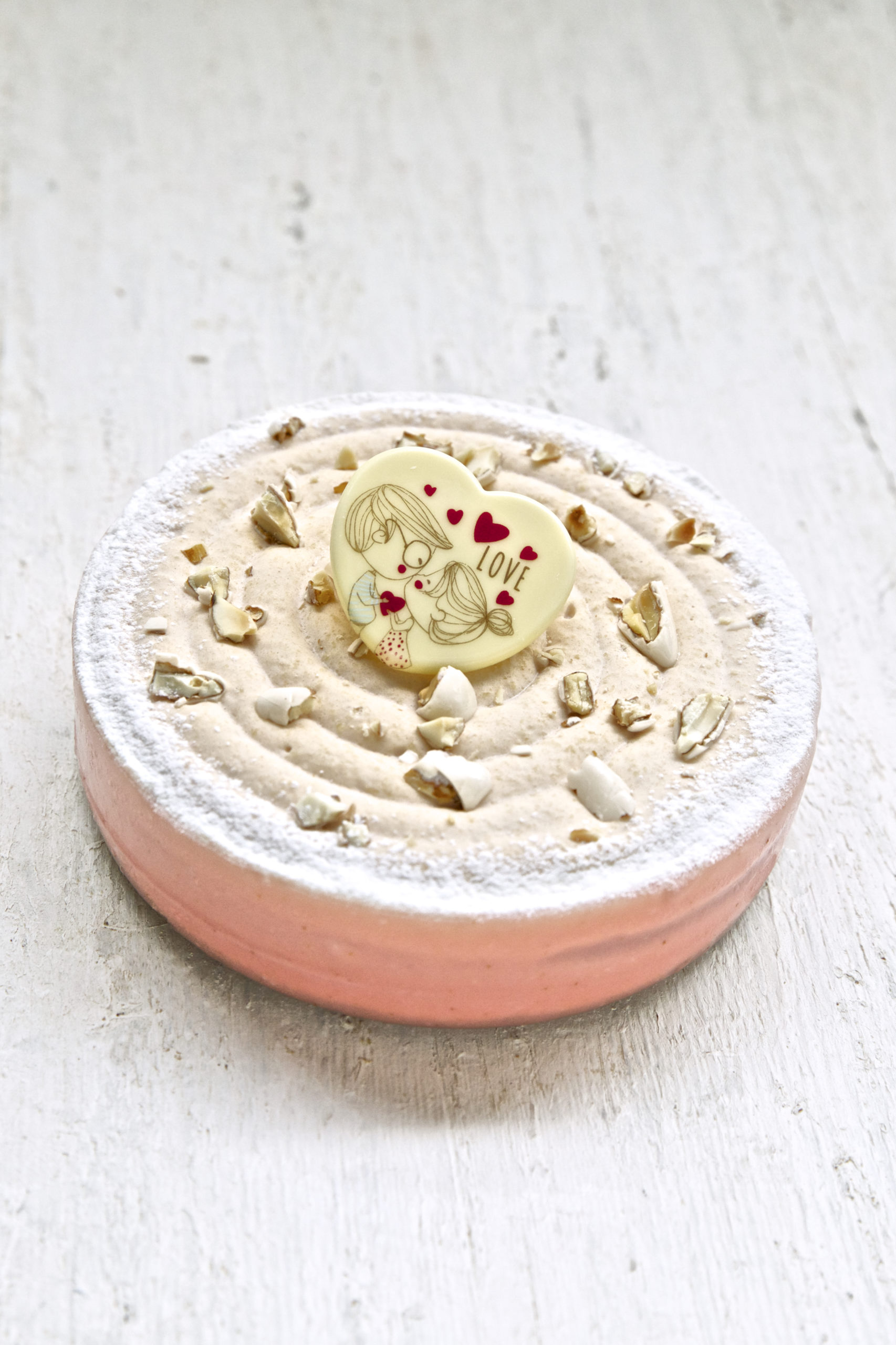 Le petit cœur est en chocolat blanc avec un colorant rouge naturel.