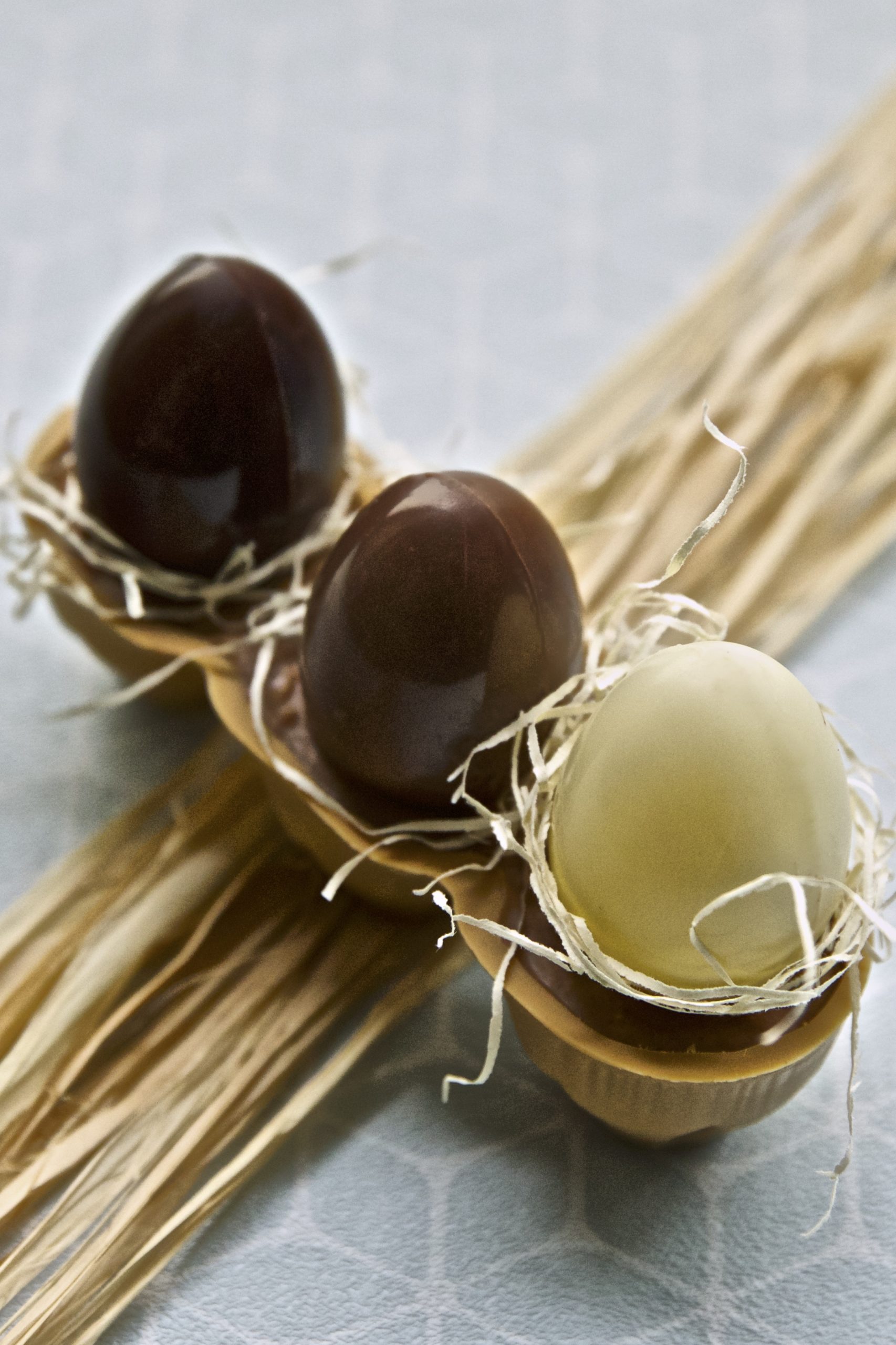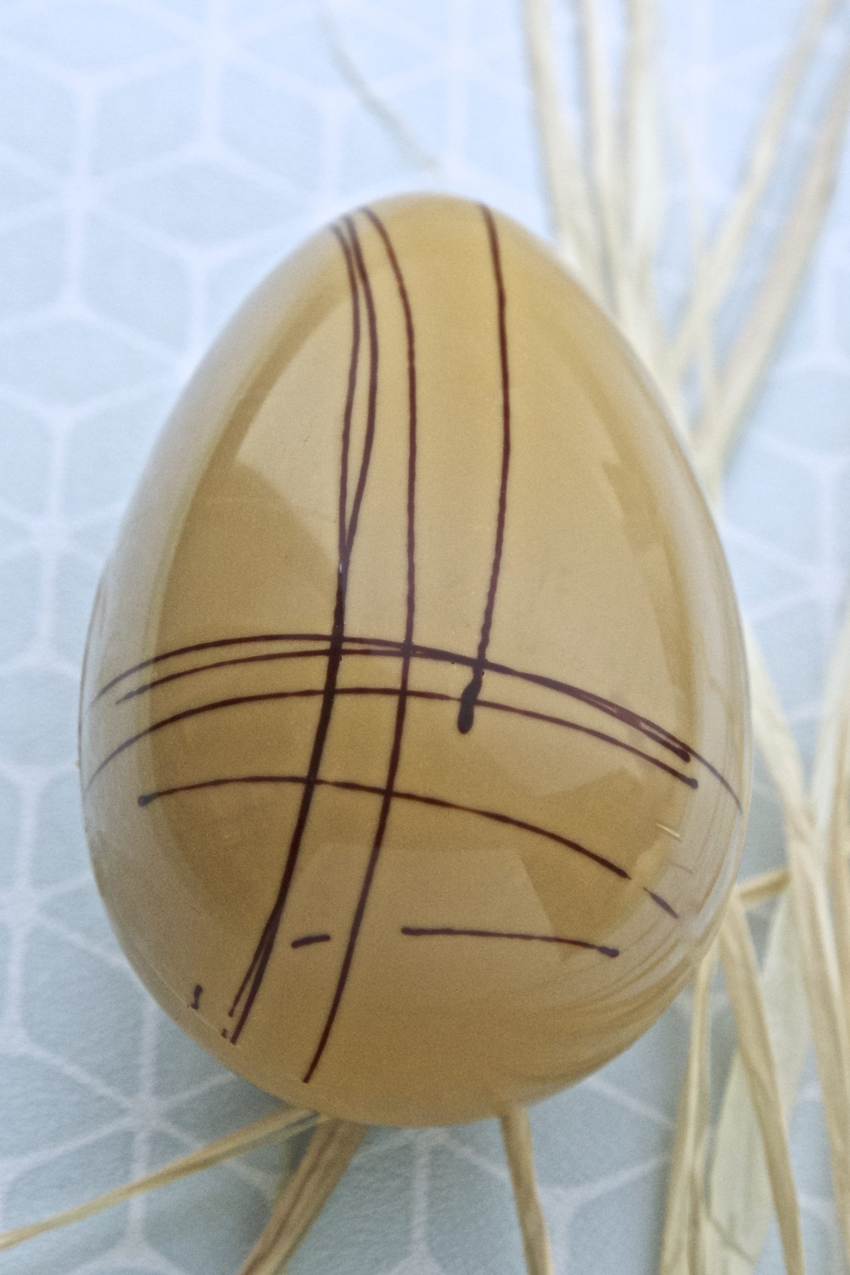 Un petit coquetier aux trois saveurs chocolat noir, chocolat lait et chocolat blanc qui cache un cœur ultra gourmand fourré au Gianduja caramel!