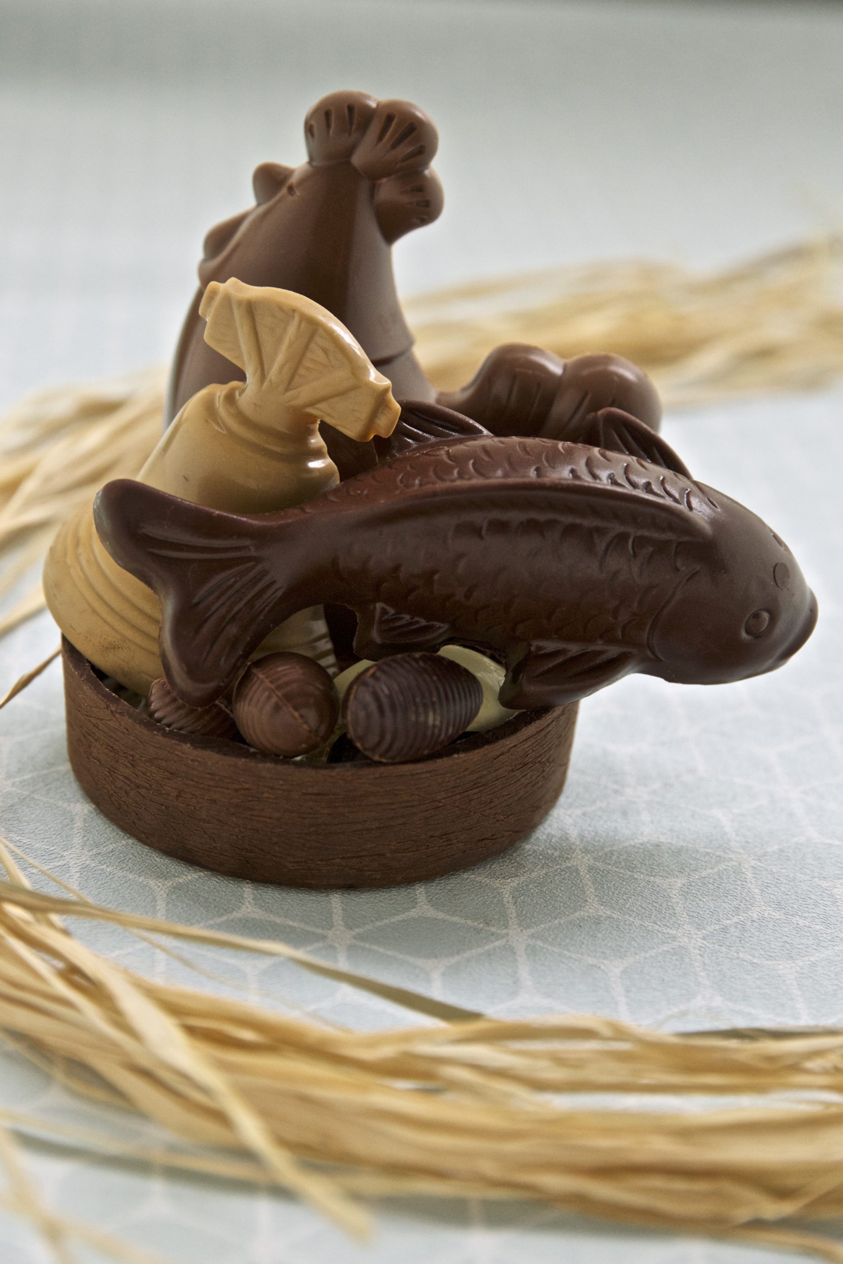 Pour les plus gourmands et ceux qui n’aiment pas choisir, le panier garni de Pâques se compose de plusieurs douceurs : un poisson au chocolat noir, une cloche au chocolat dulcey, une poule au chocolat au lait et de délicieuses fritures maison.