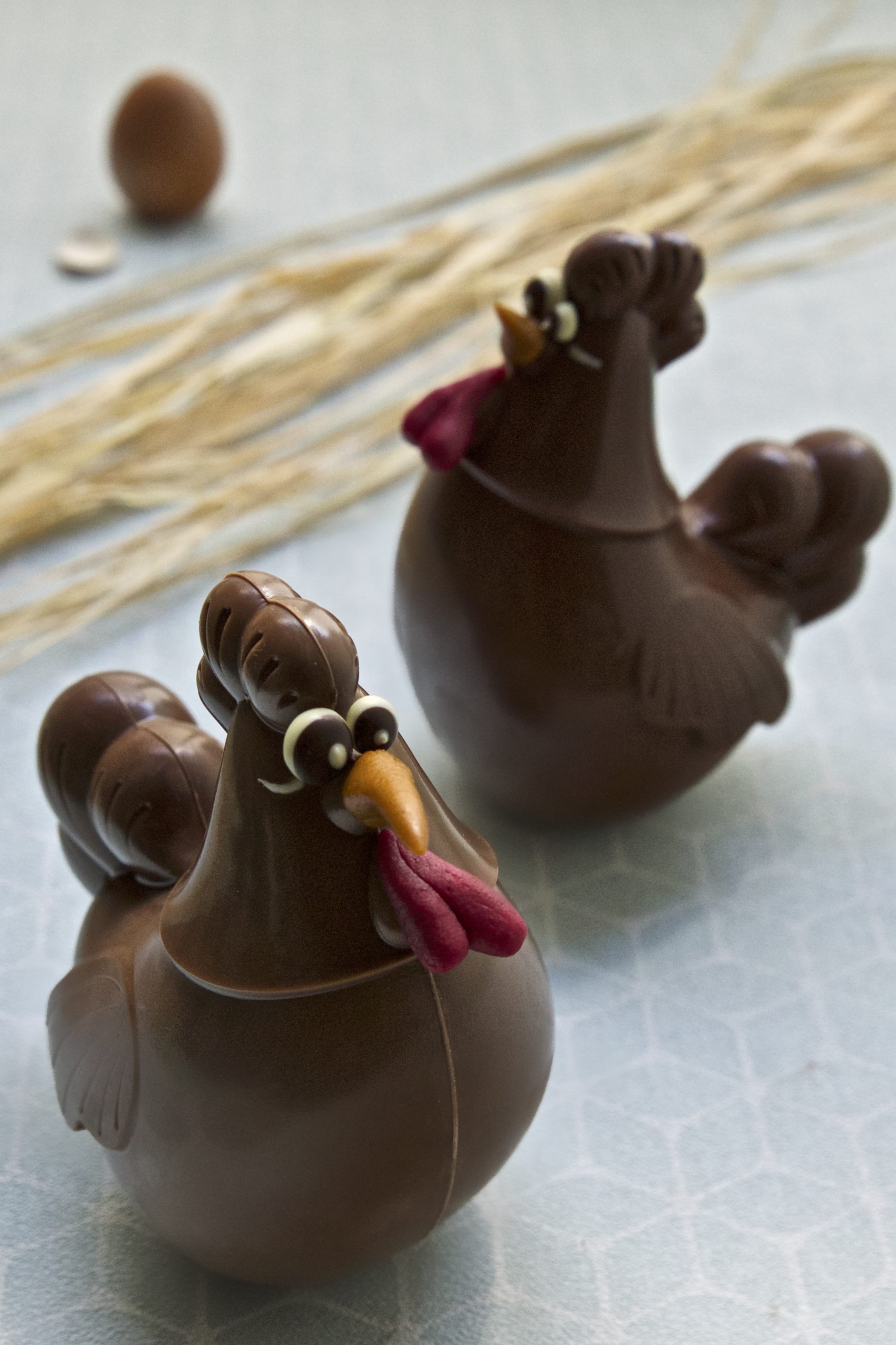 Les Cocottes, Berthe et Louise, se déclinent en deux versions: Chocolat noir ou Chocolat au lait, accompagnées chacune par son œuf Gianduja.