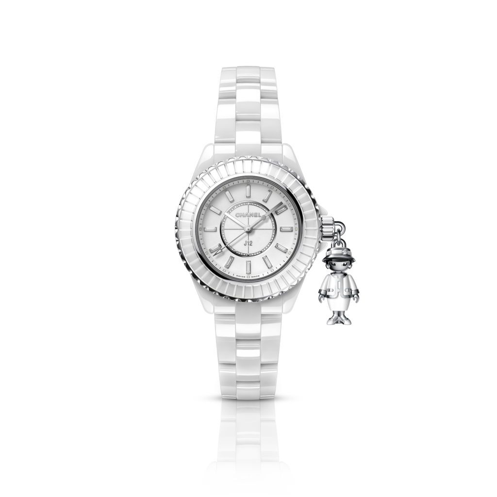 Rivée à la couronne de la J12, une pampille à l’effigie stylisée de Mademoiselle joue les équilibristes. Serti de 12 index diamants baguettes et de 2 diamants brillants, ce modèle en 33 mm, en céramique noire ou blanche, paré d’une lunette facettée en or blanc 18 carats est limité à 555 exemplaires.