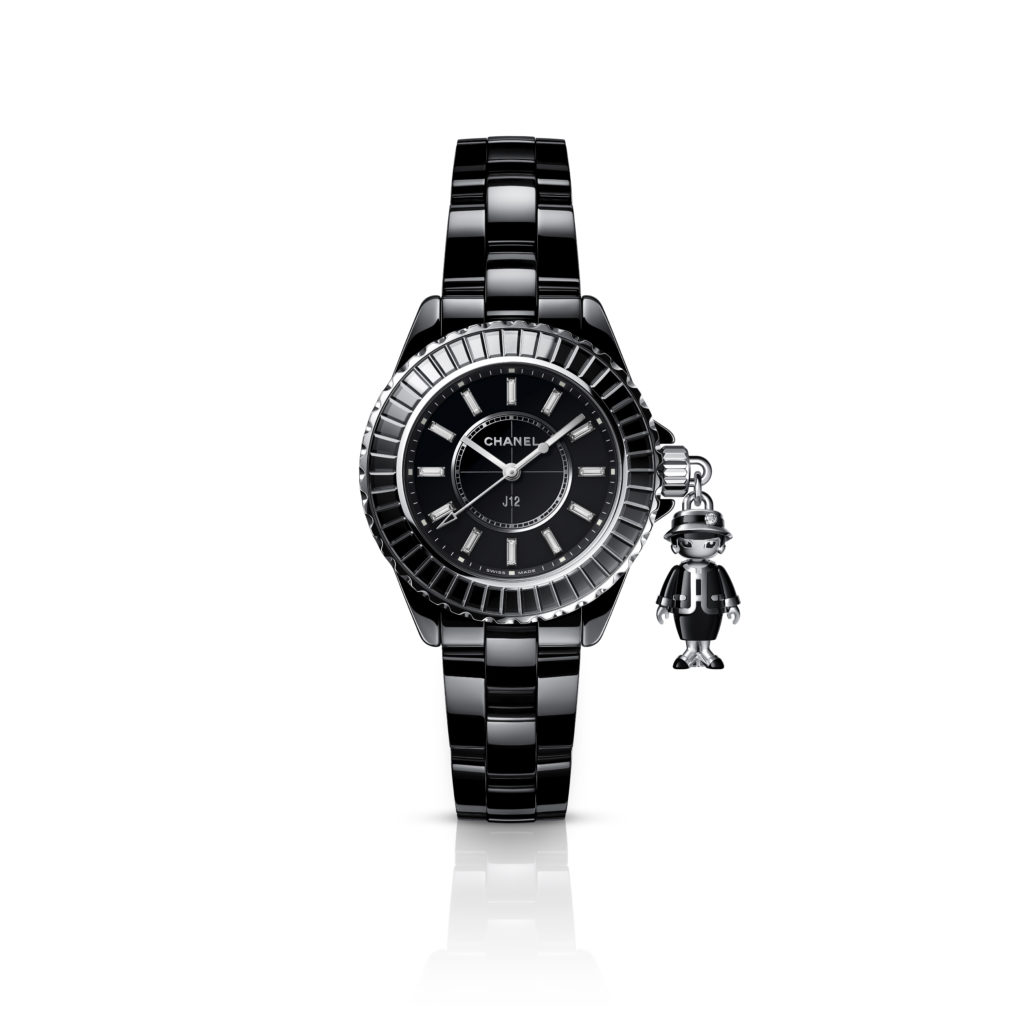 Rivée à la couronne de la J12, une pampille à l’effigie stylisée de Mademoiselle joue les équilibristes. Serti de 12 index diamants baguettes et de 2 diamants brillants, ce modèle en 33 mm, en céramique noire ou blanche, paré d’une lunette facettée en or blanc 18 carats est limité à 555 exemplaires.