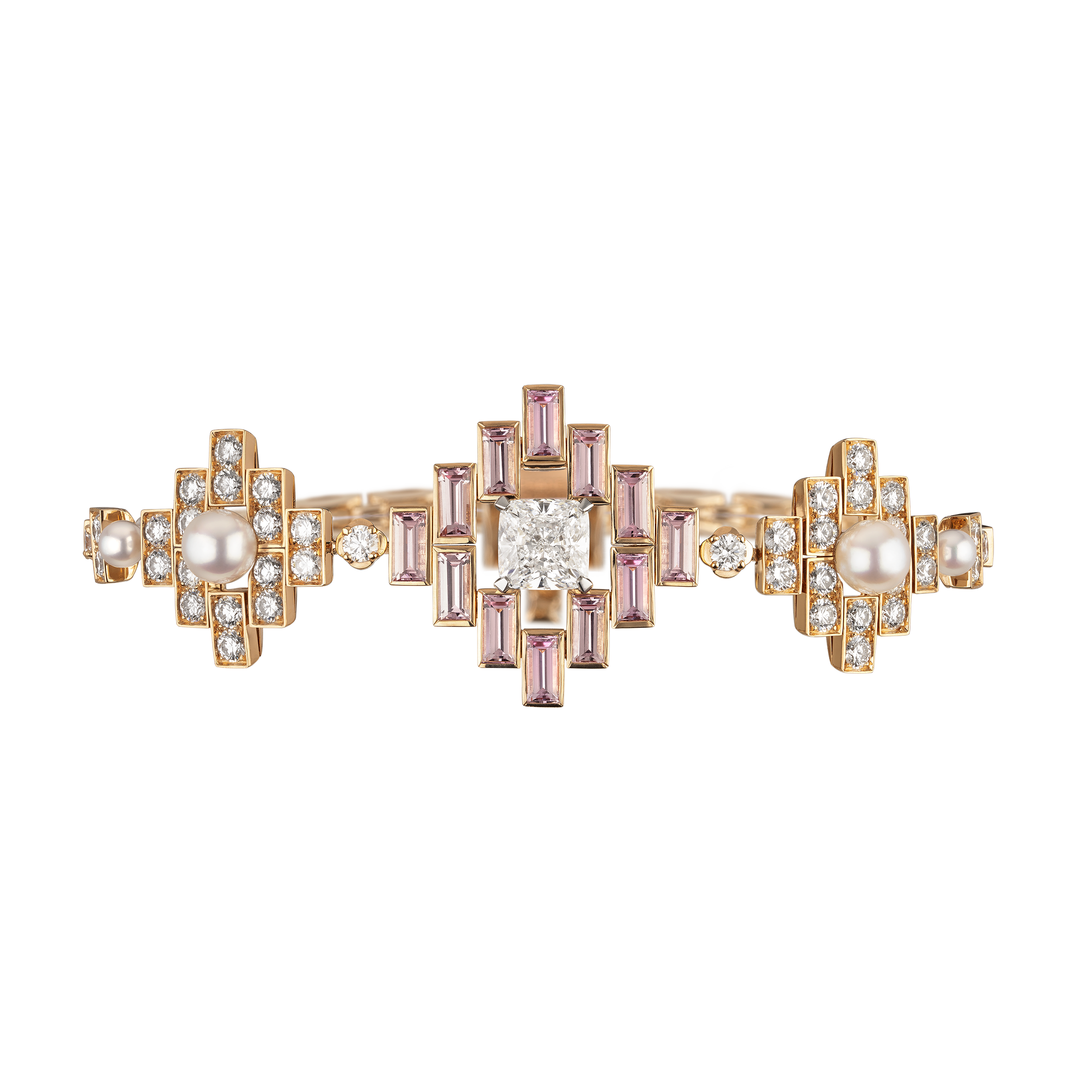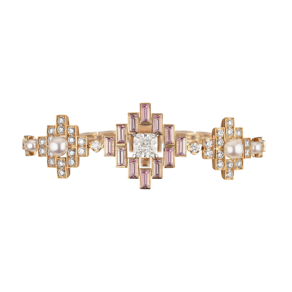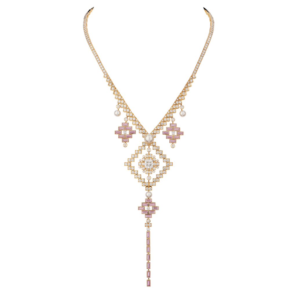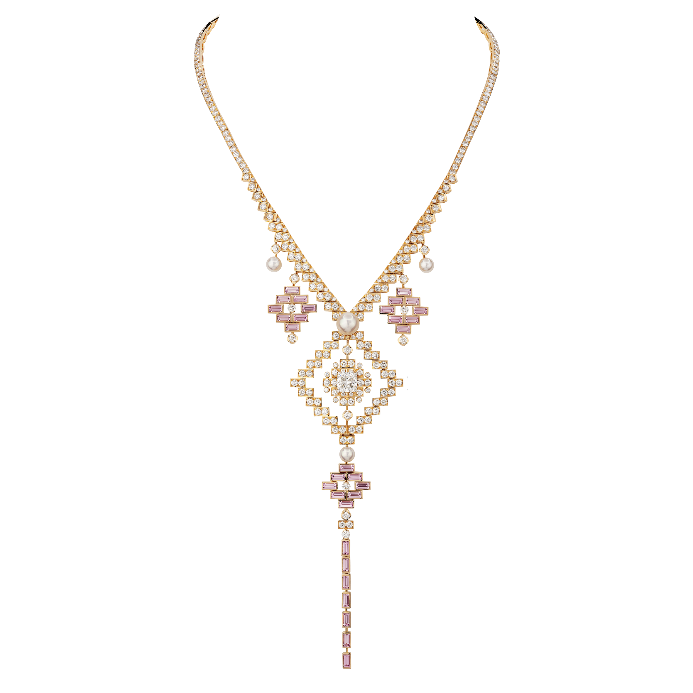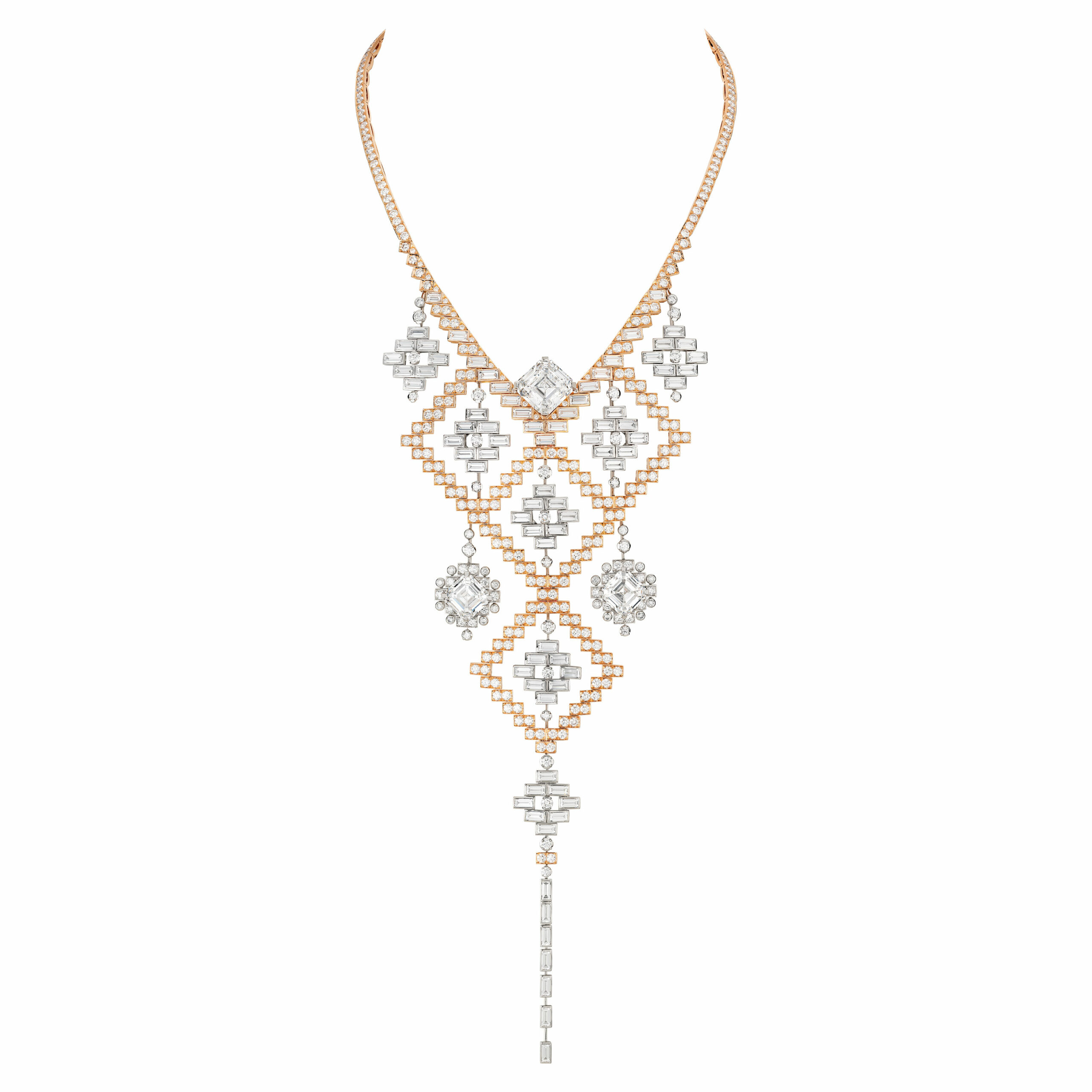 Célébration de la richesse architecturale de Venise, la parure Eblouissante se compose de dessins géométriques blancs et roses, interprétation unique des façades des palais et des sols en marbre polychrome des églises. Sur une structure en or rose et platine, le collier, au tomber parfait, déploie des motifs en quinconce sertis de diamants baguette qui rappellent le matelassé cher à Gabrielle Chanel.
