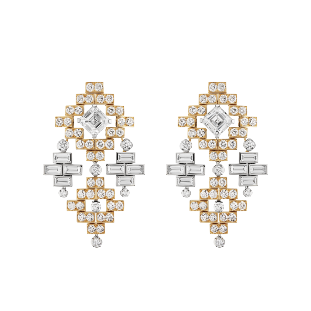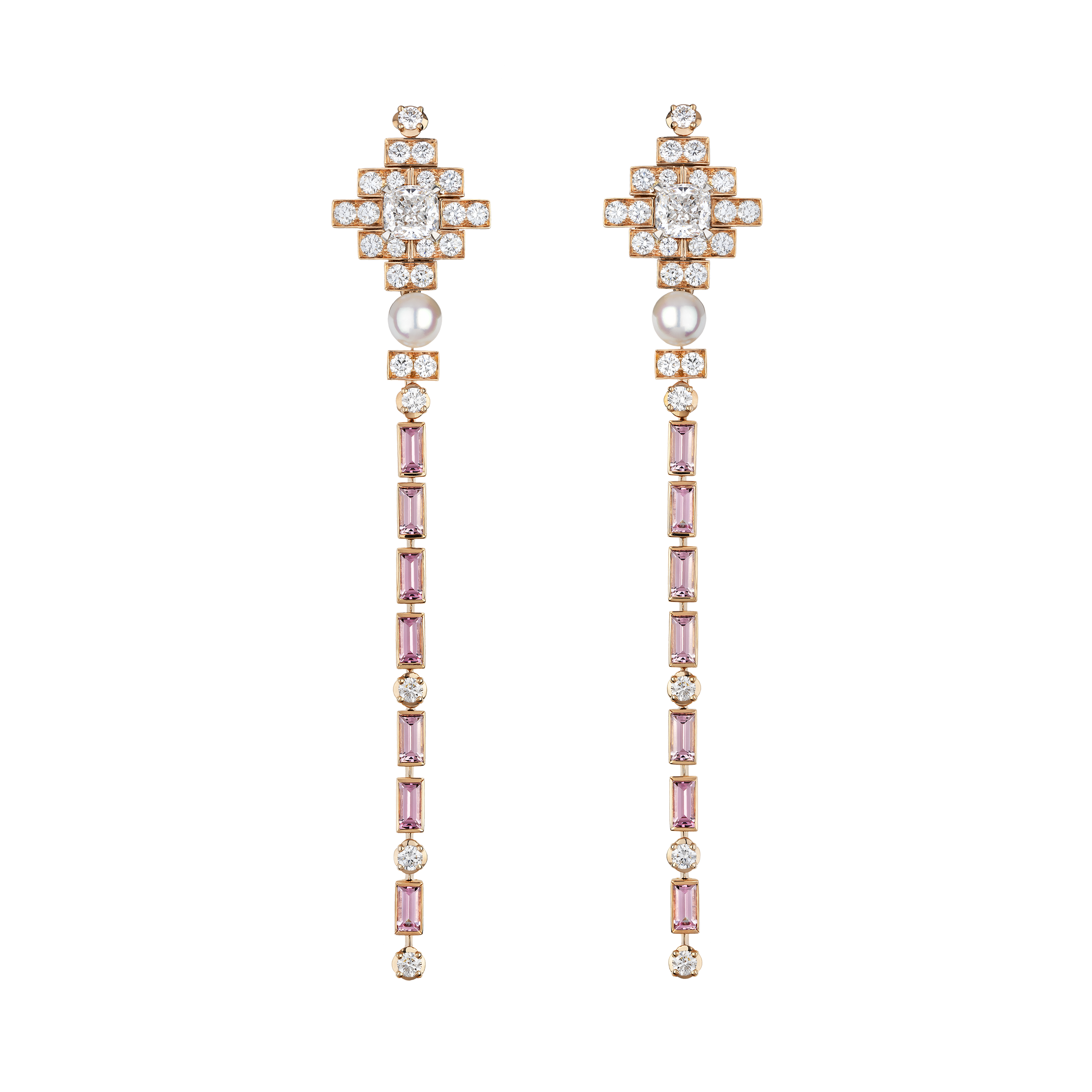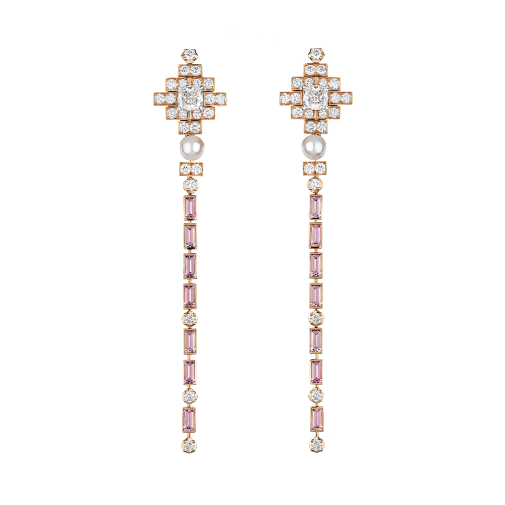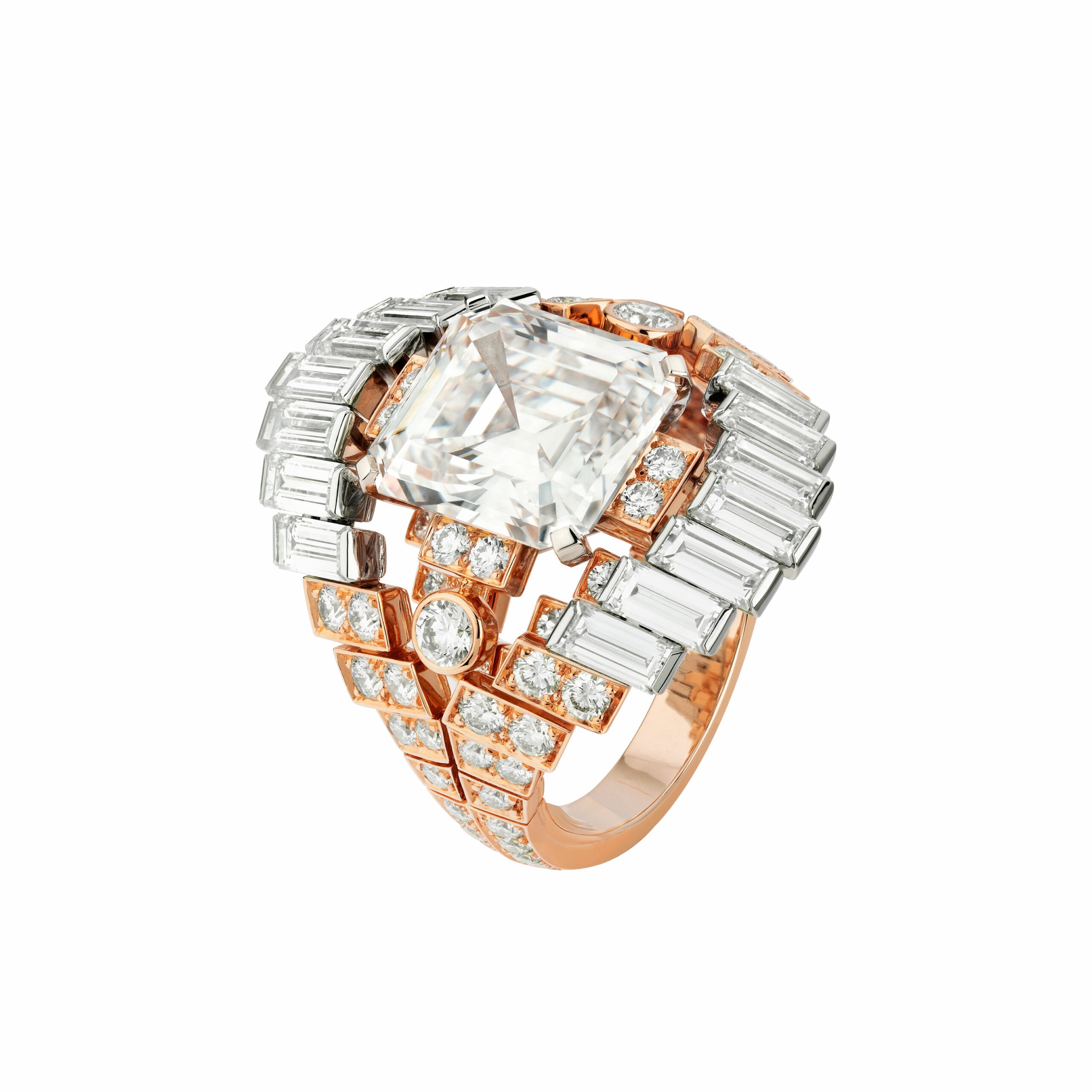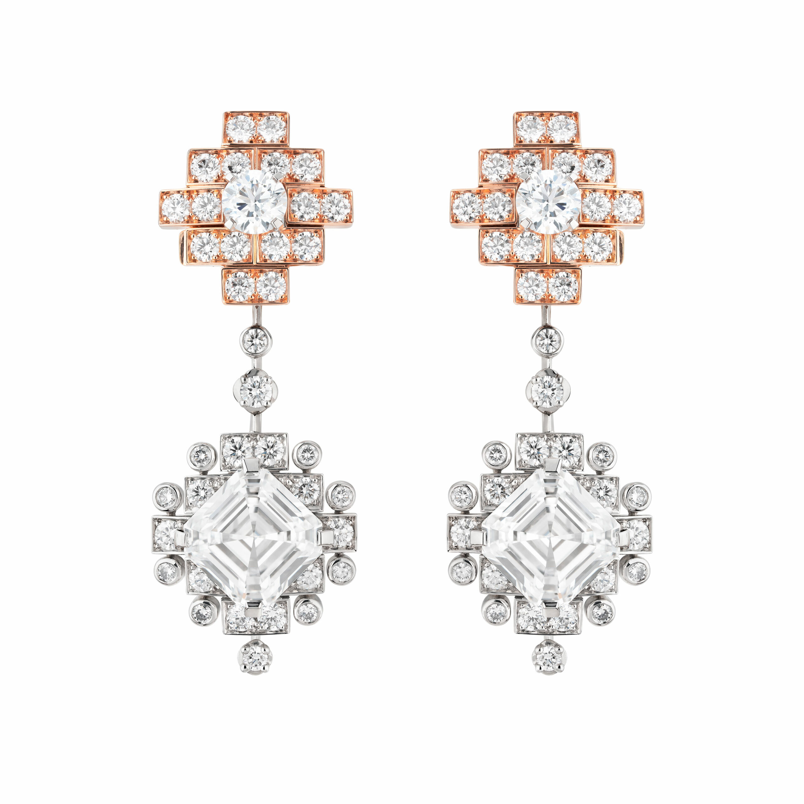 Célébration de la richesse architecturale de Venise, la parure Eblouissante se compose de dessins géométriques blancs et roses, interprétation unique des façades des palais et des sols en marbre polychrome des églises. Sur une structure en or rose et platine, le collier, au tomber parfait, déploie des motifs en quinconce sertis de diamants baguette qui rappellent le matelassé cher à Gabrielle Chanel.