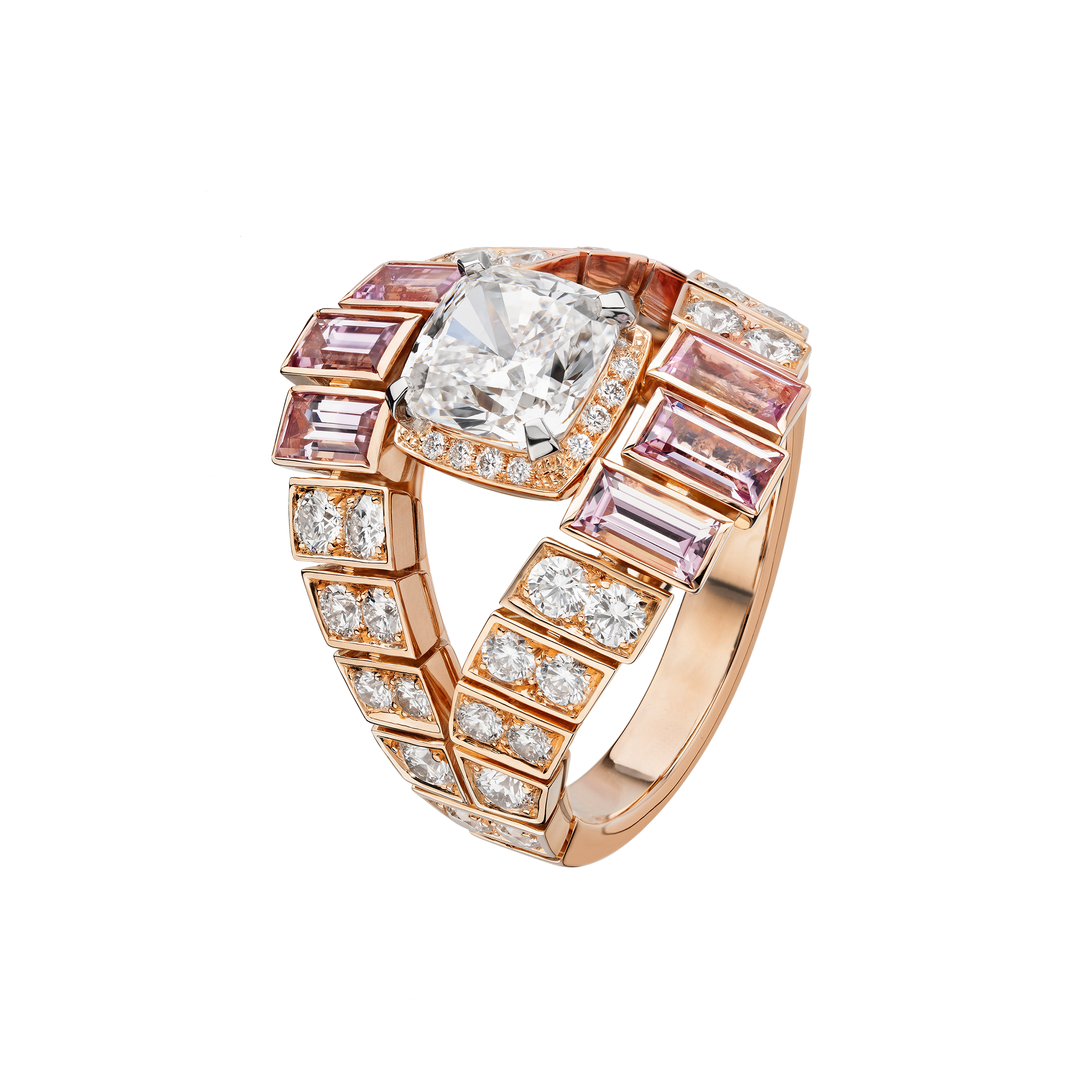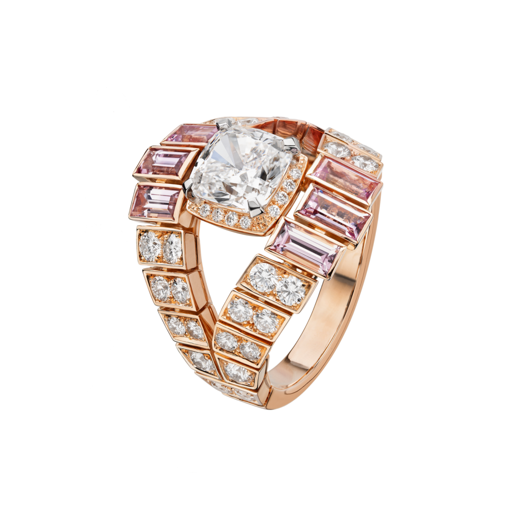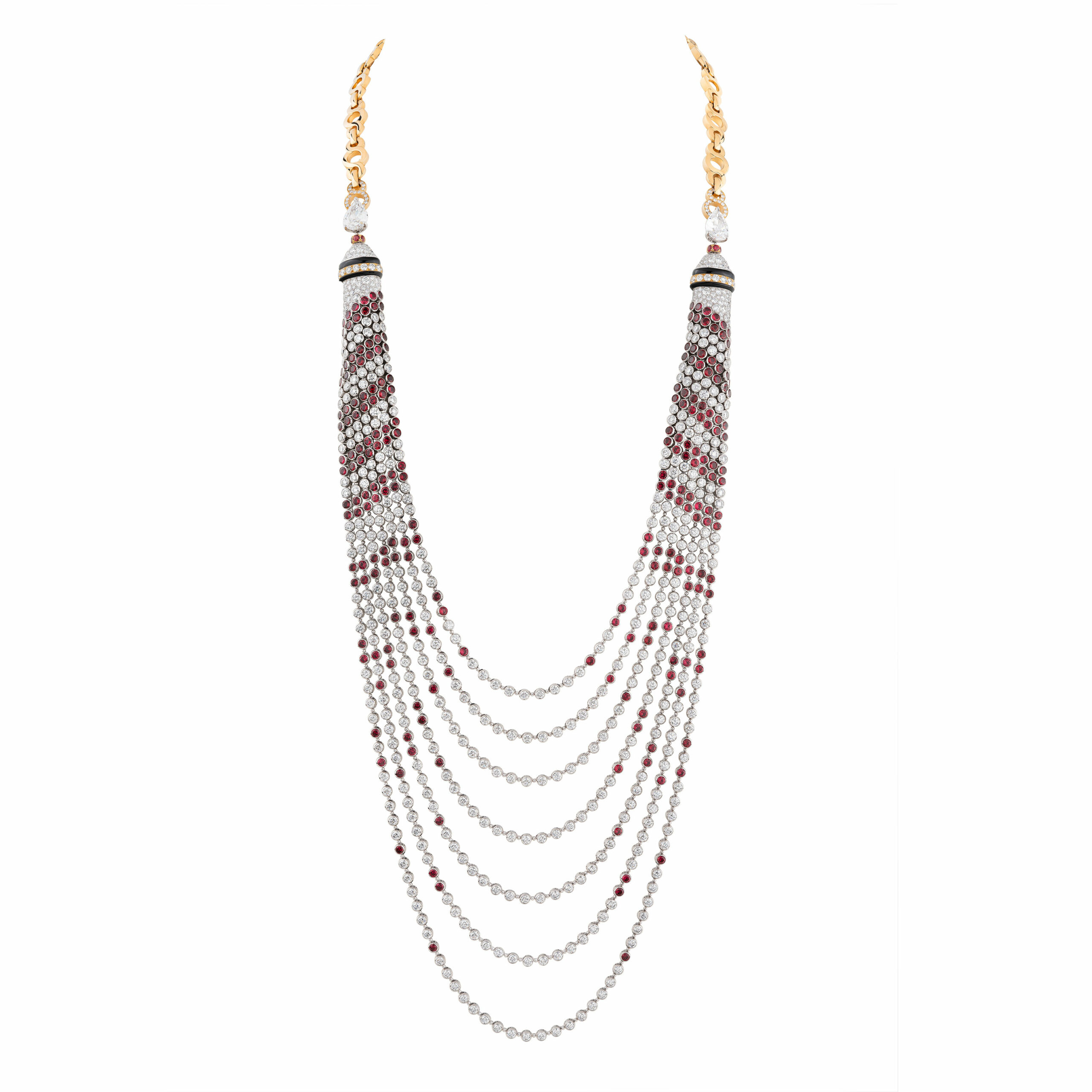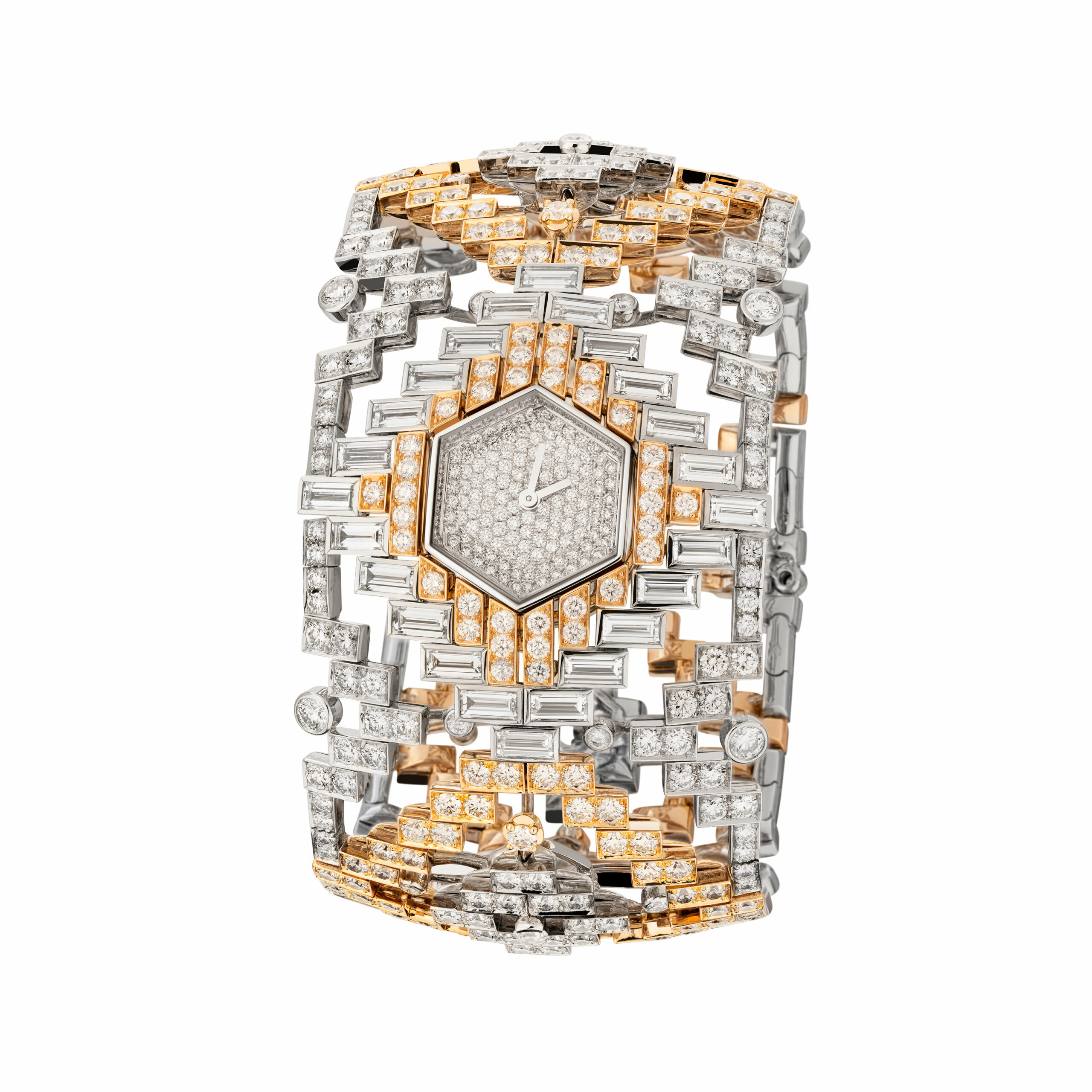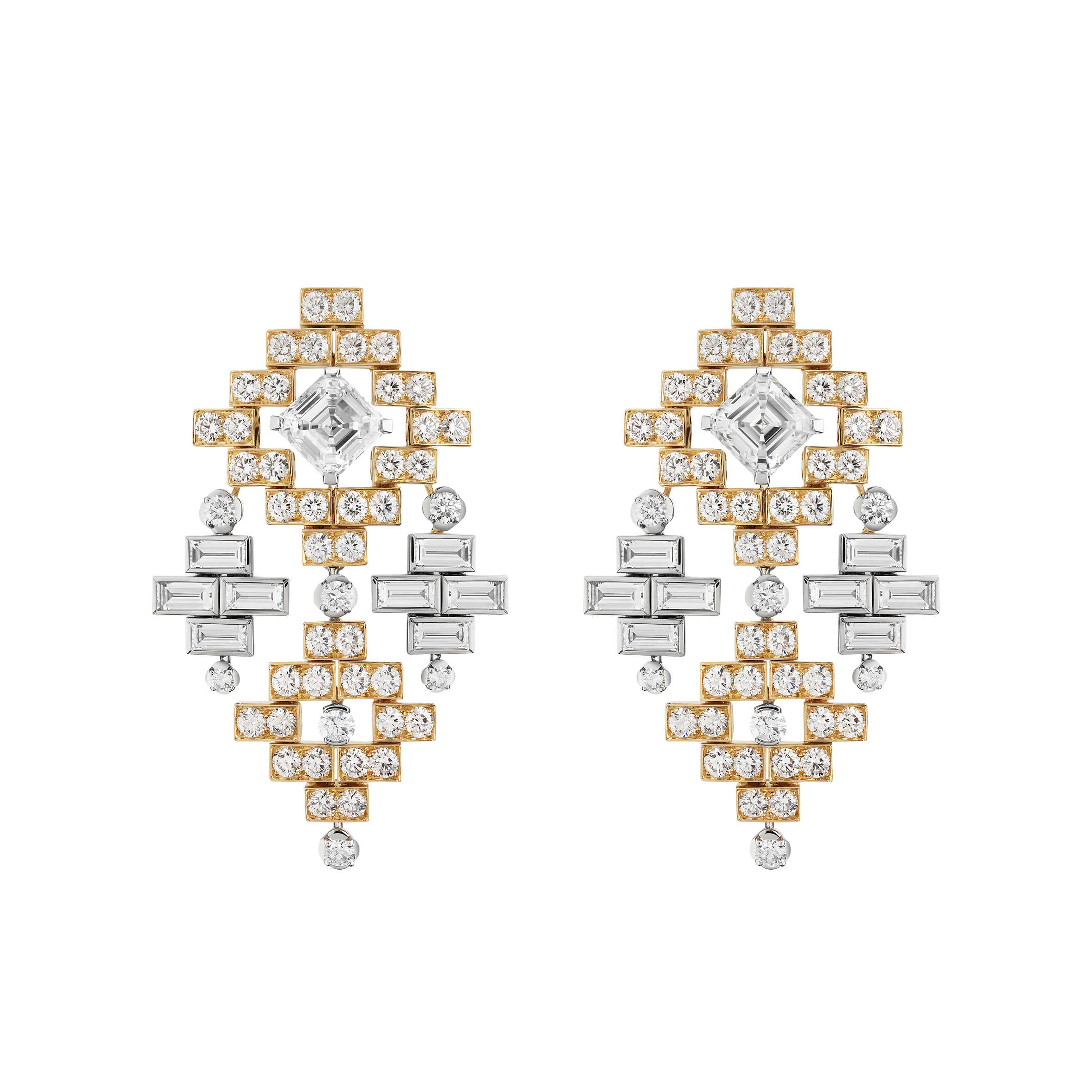 Célébration de la richesse architecturale de Venise, la parure Eblouissante se compose de dessins géométriques blancs et roses, interprétation unique des façades des palais et des sols en marbre polychrome des églises. Sur une structure en or rose et platine, le collier, au tomber parfait, déploie des motifs en quinconce sertis de diamants baguette qui rappellent le matelassé cher à Gabrielle Chanel.