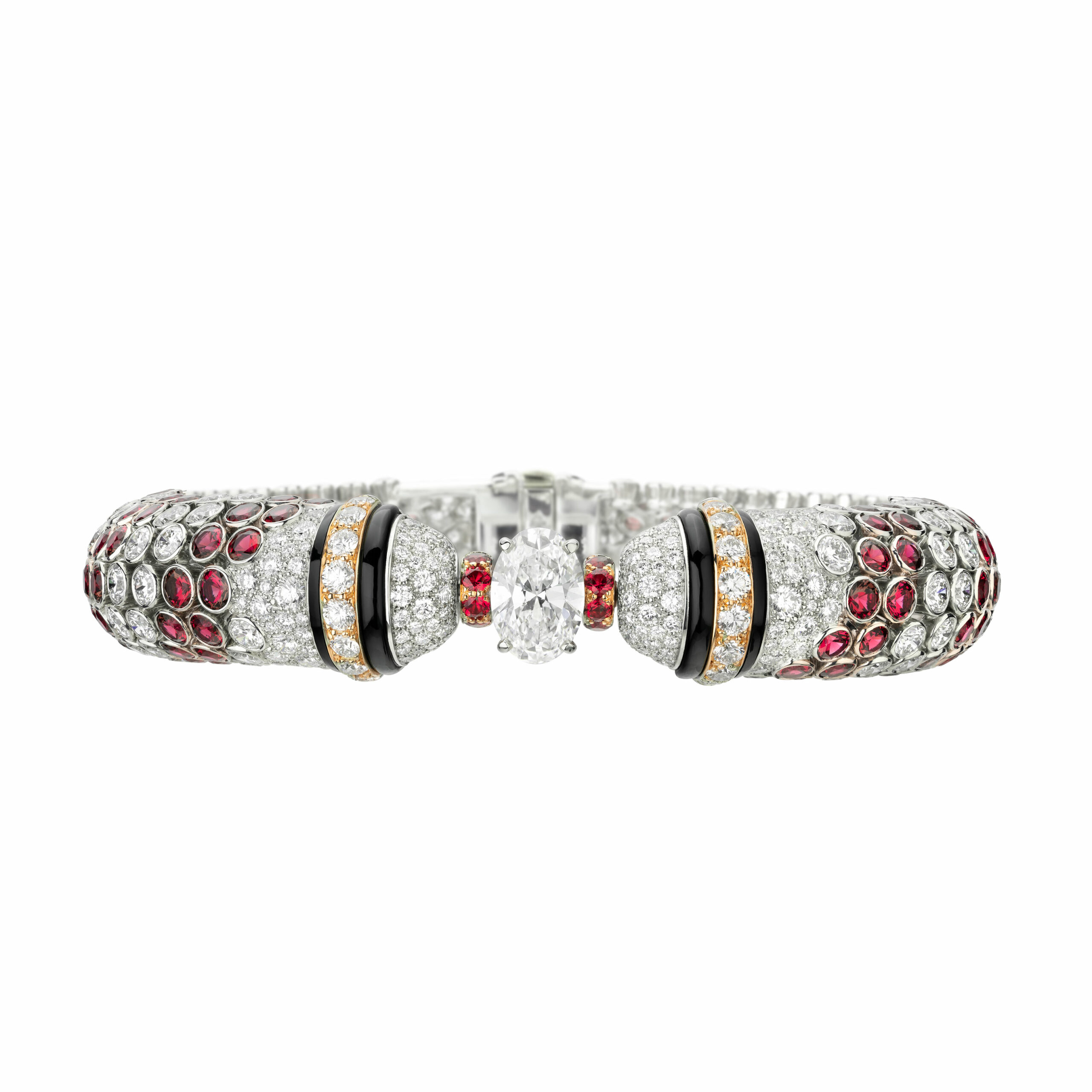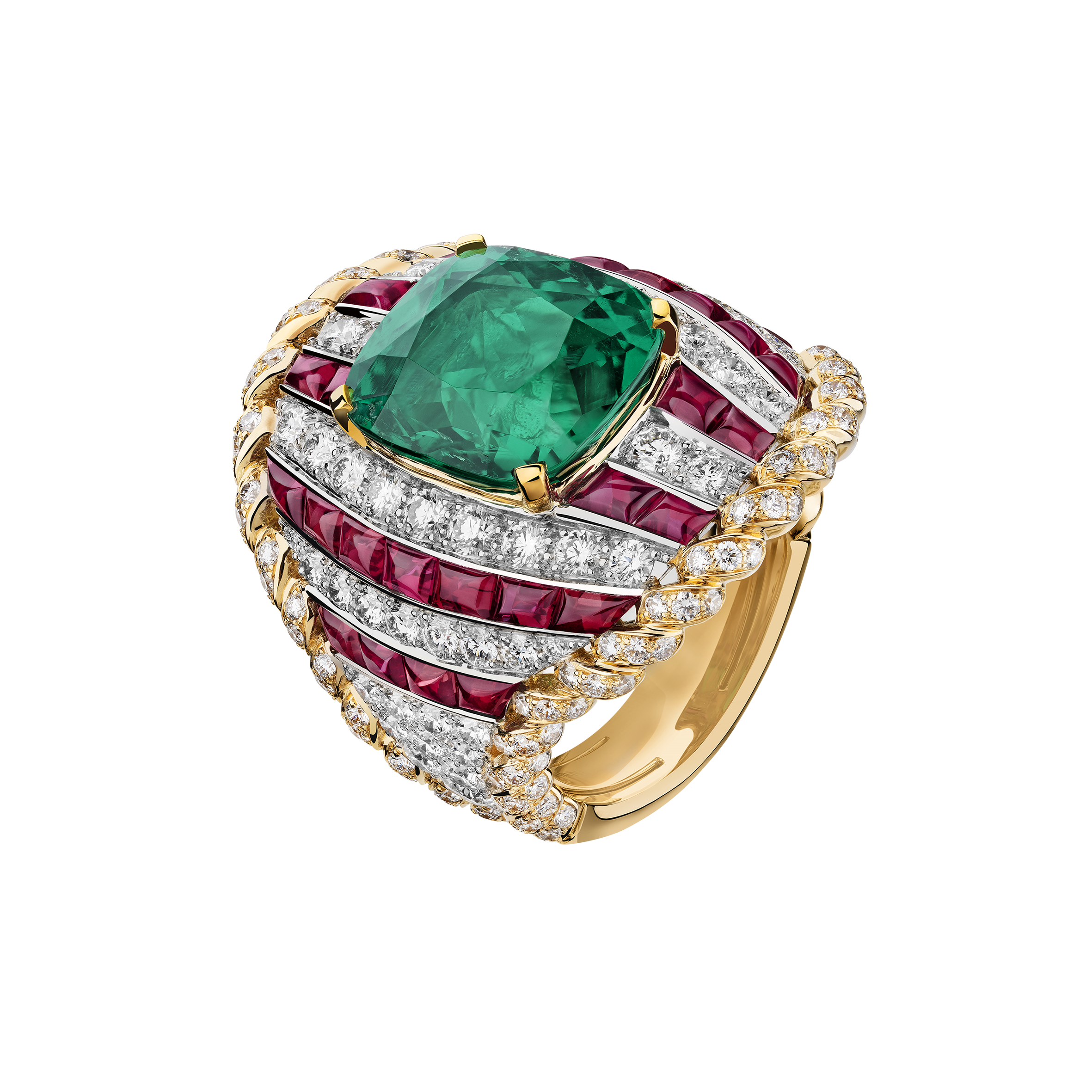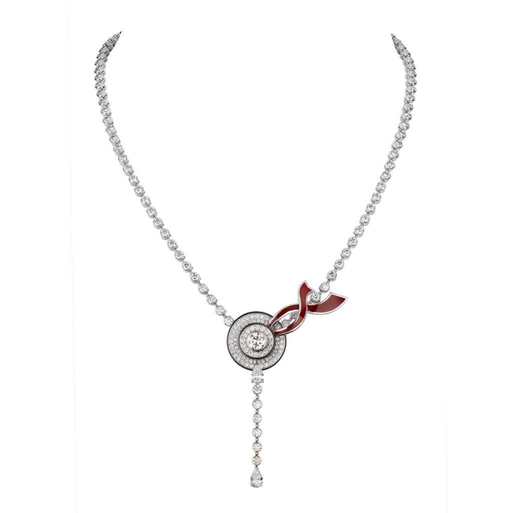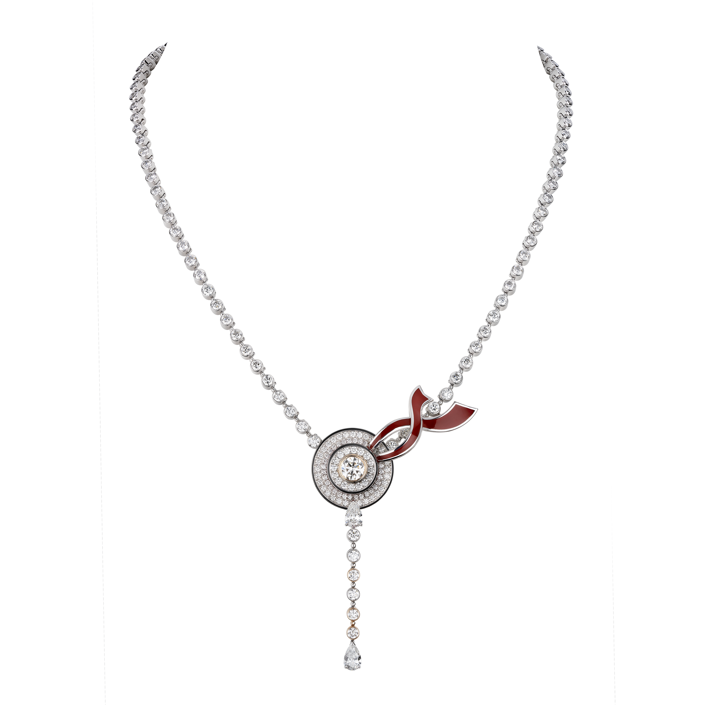 En rouge et blanc, les palines prêtent leurs rayures transversales à Volute Croisière. Sur un sautoir spectaculaire, spinelles rouges et diamants sont montés de façon à procurer un effet torsadé, à l’image des cordages. Un jonc retient en ses filets une étoile et un diamant ovale de 2,13 carats.