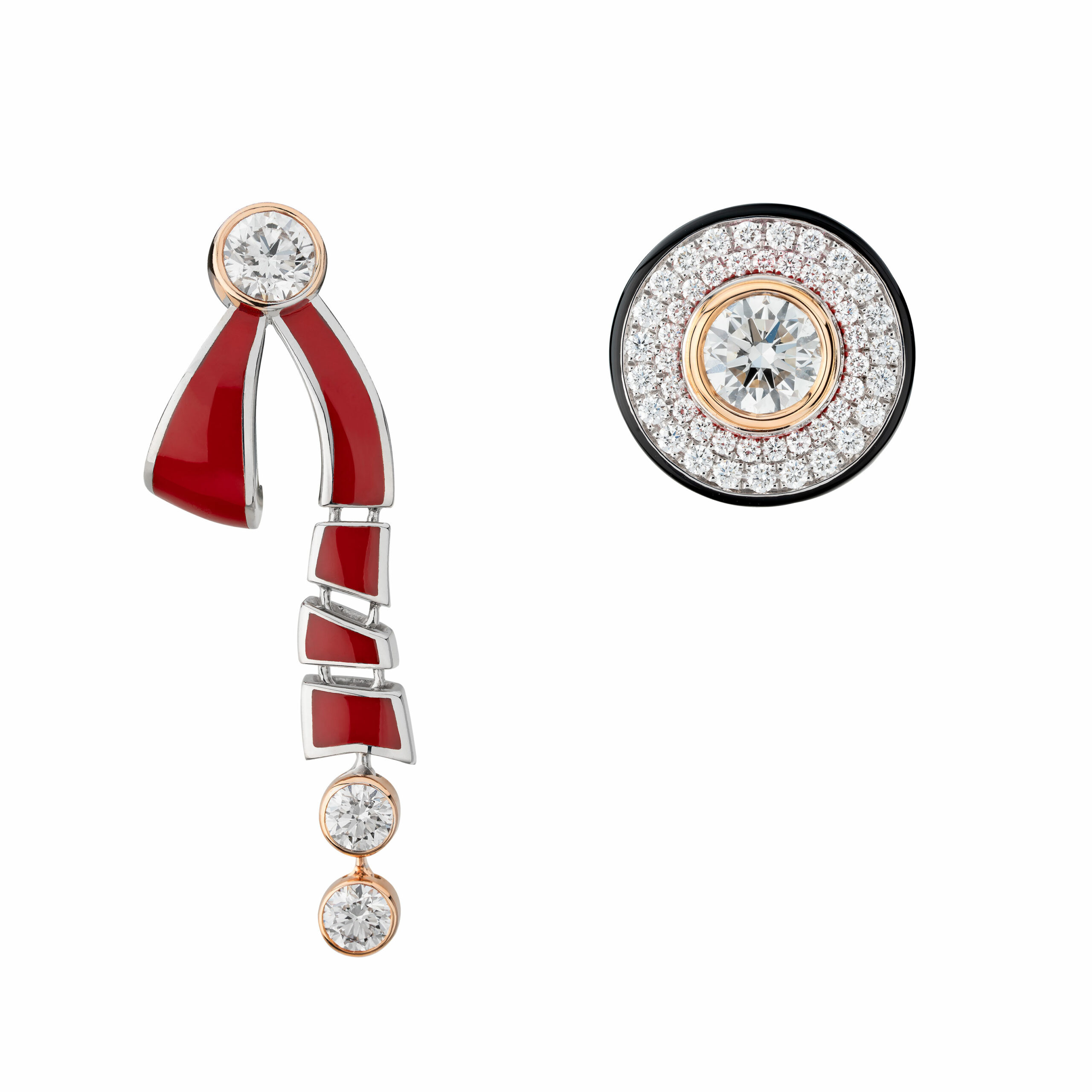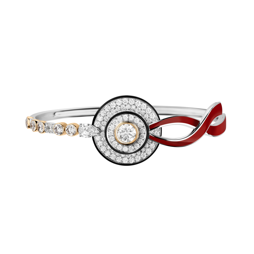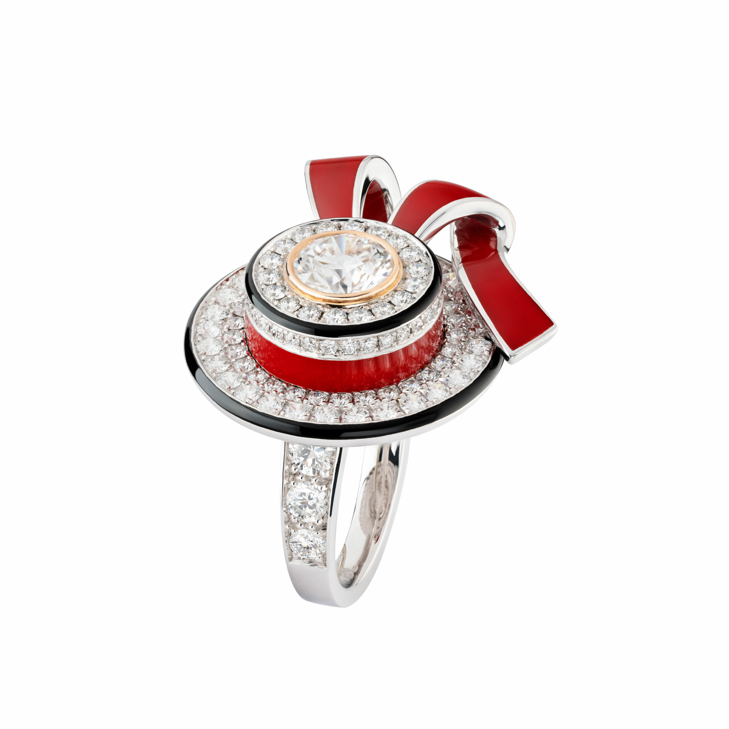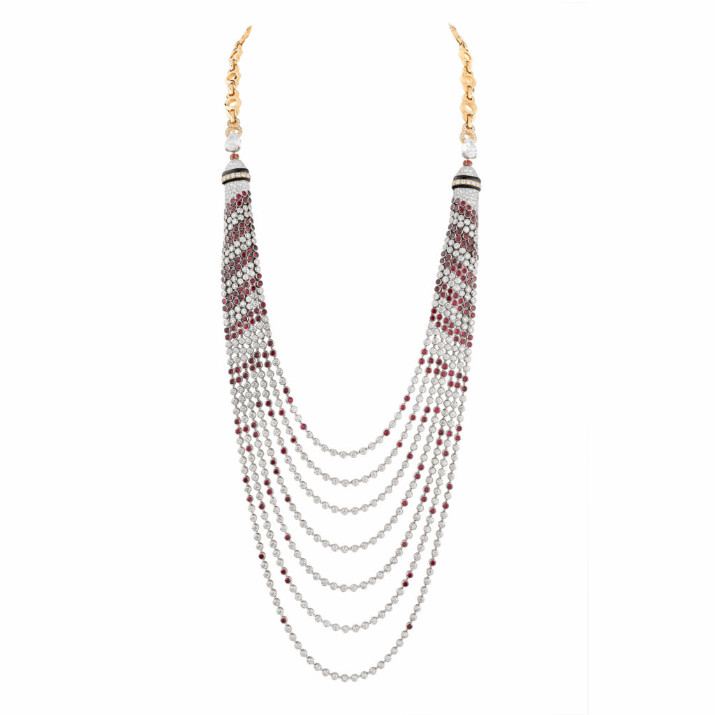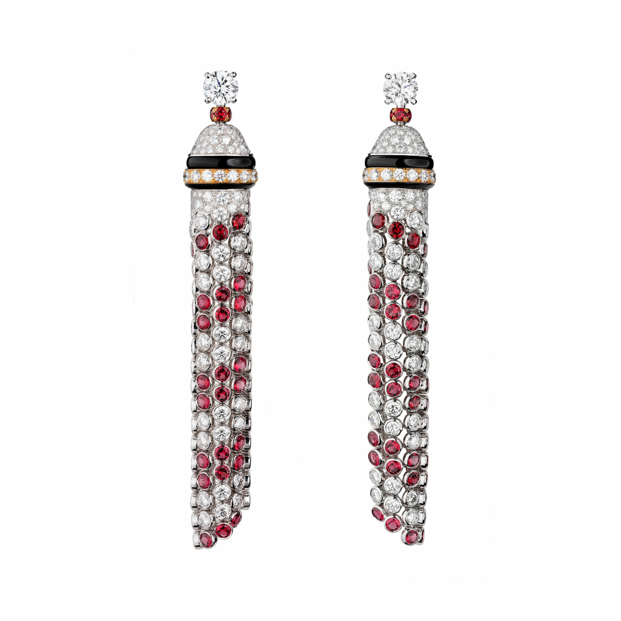 En rouge et blanc, les palines prêtent leurs rayures transversales à Volute Croisière. Sur un sautoir spectaculaire, spinelles rouges et diamants sont montés de façon à procurer un effet torsadé, à l’image des cordages. Un jonc retient en ses filets une étoile et un diamant ovale de 2,13 carats.