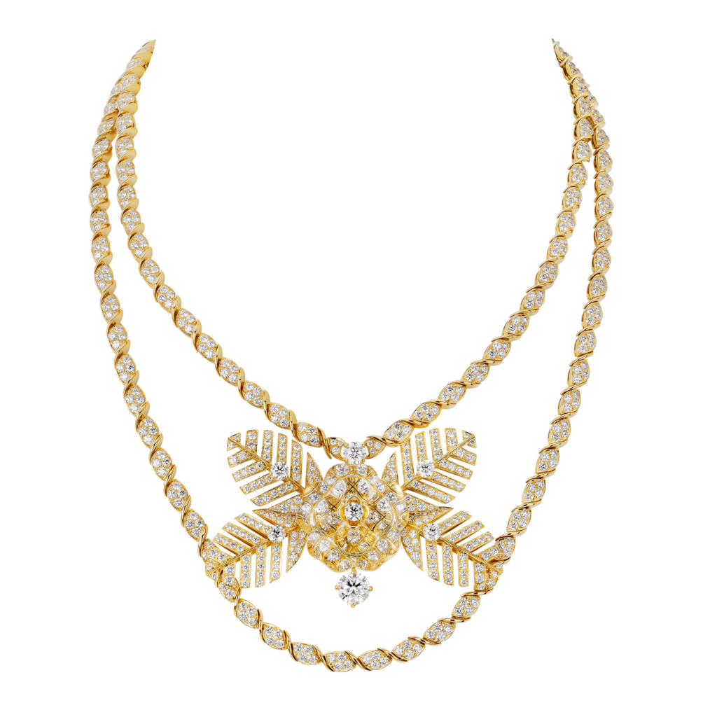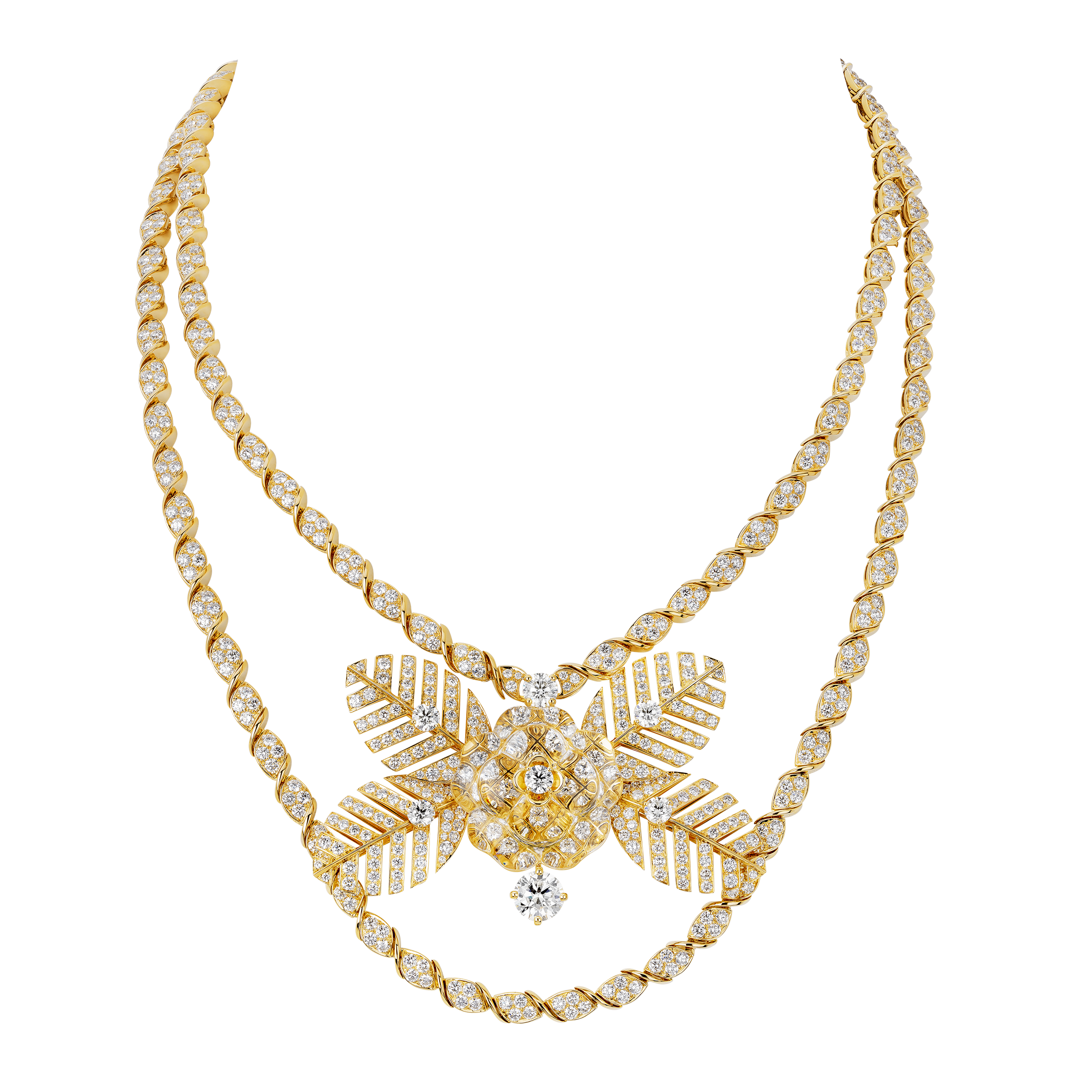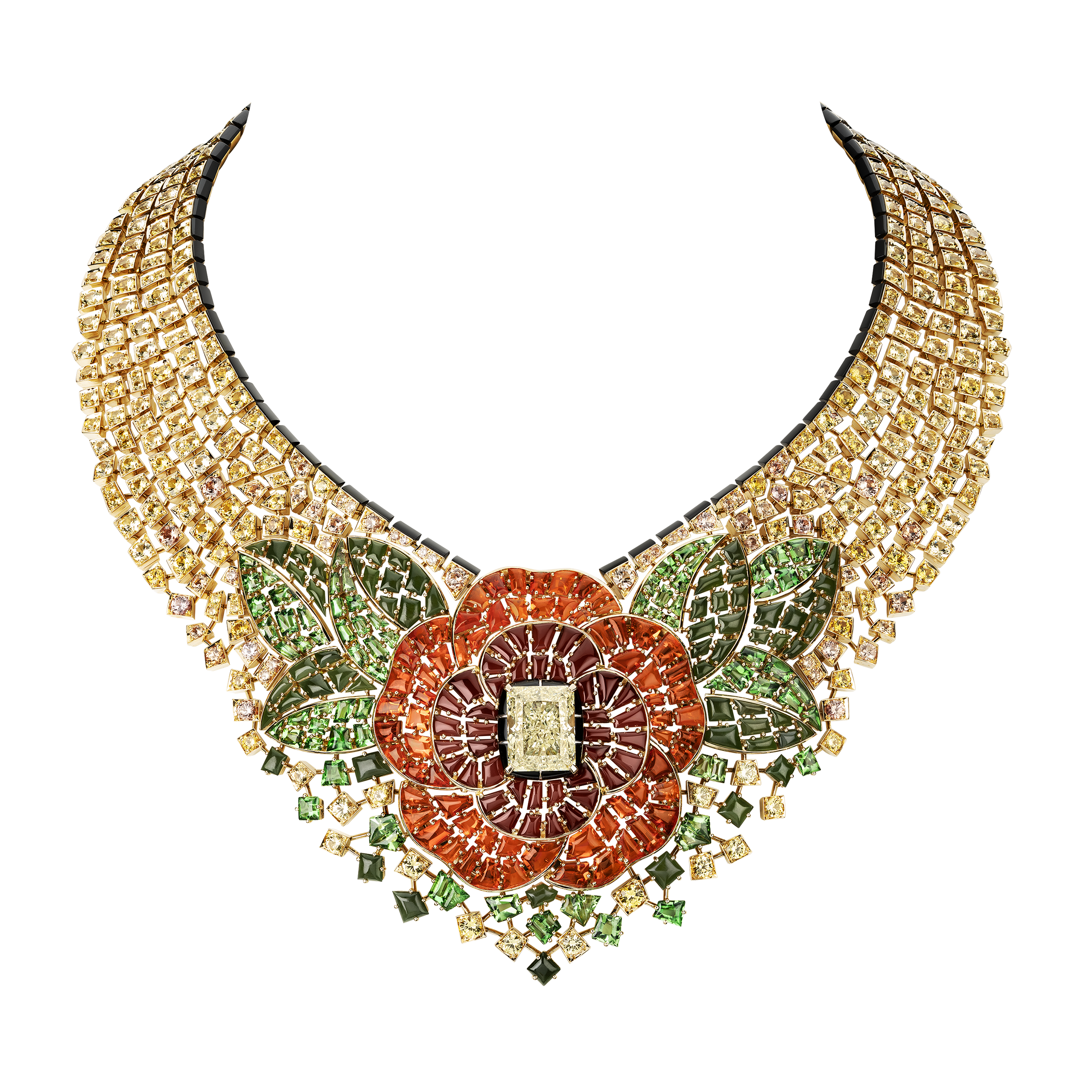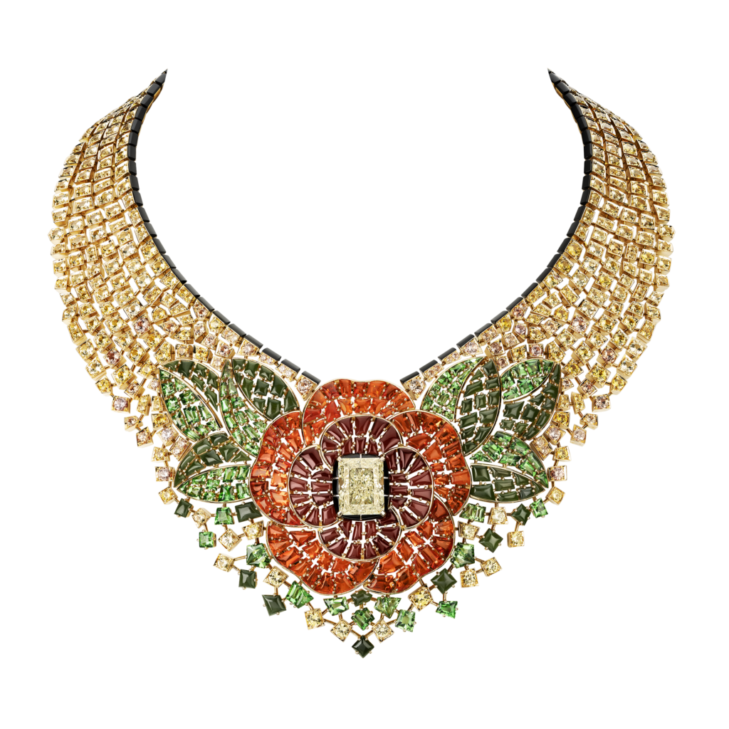 Ode aux Métiers d’art, les îles de lagune regroupent trois parures consacrant la fleur préférée de Gabrielle Chanel, le camélia. Camélia Byzantin célèbre les mosaïques anciennes présentes sur l’île de Torcello au travers d’un collier virtuose en pierres dures. Leur tracé irrégulier exalte la beauté d’un camélia rouge en tesselles de cornalines et opales de feu. Son pistil est composé d’un diamant jaune de 10,07 carats.