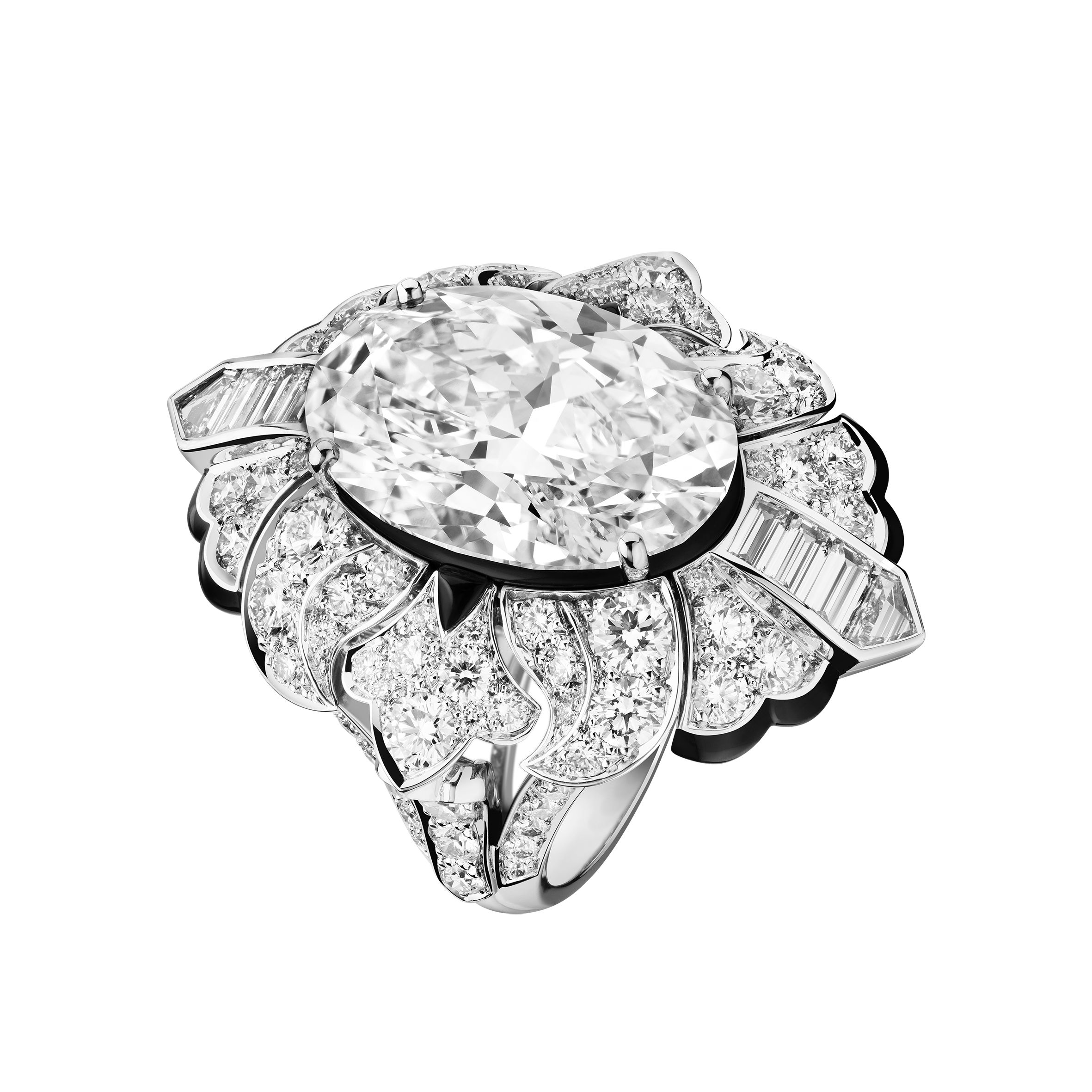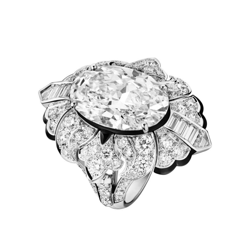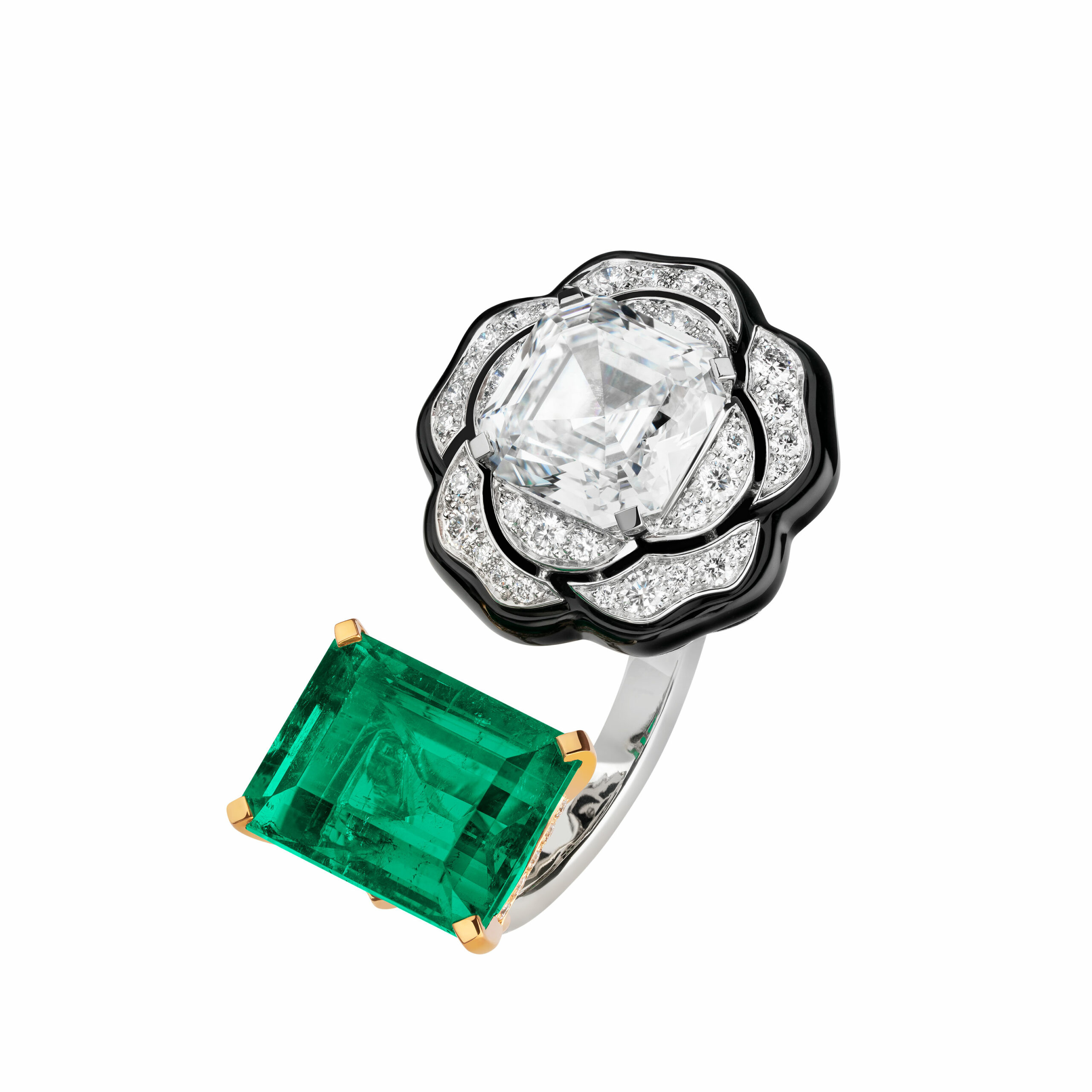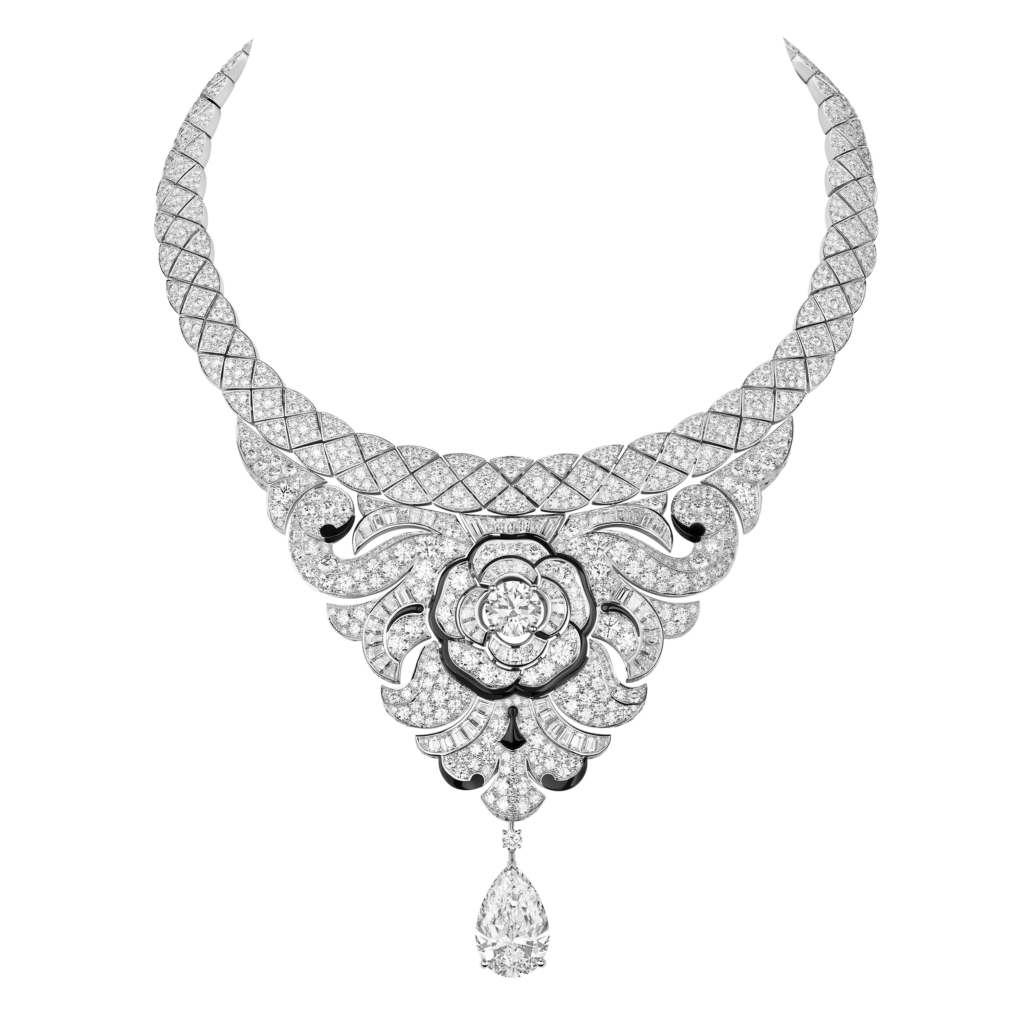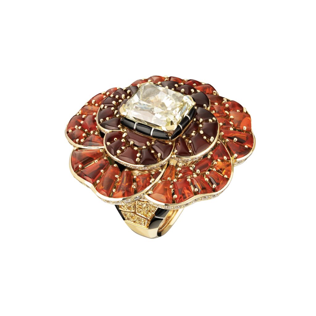 Ode aux Métiers d’art, les îles de lagune regroupent trois parures consacrant la fleur préférée de Gabrielle Chanel, le camélia. Camélia Byzantin célèbre les mosaïques anciennes présentes sur l’île de Torcello au travers d’un collier virtuose en pierres dures. Leur tracé irrégulier exalte la beauté d’un camélia rouge en tesselles de cornalines et opales de feu. Son pistil est composé d’un diamant jaune de 10,07 carats.