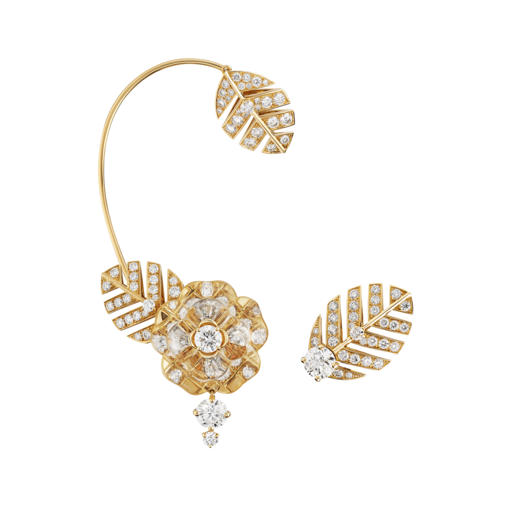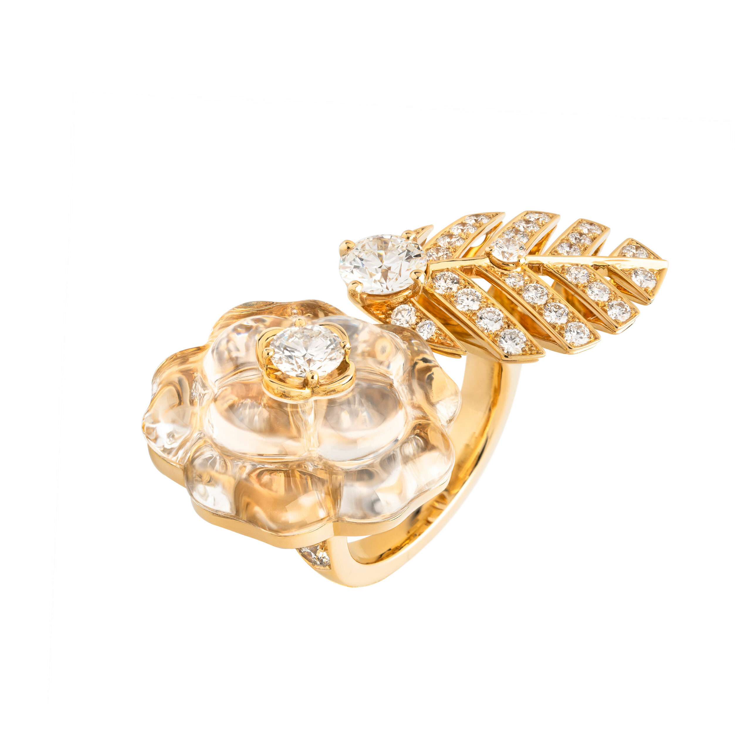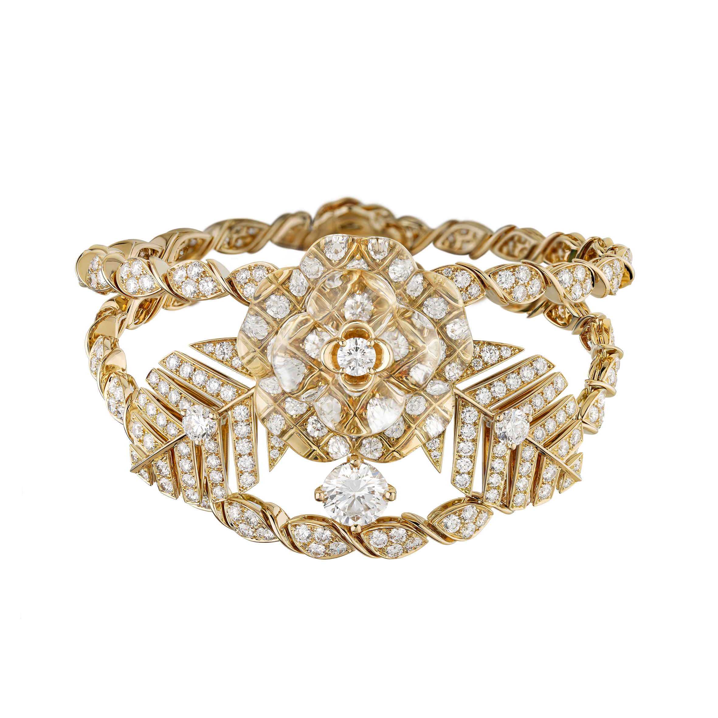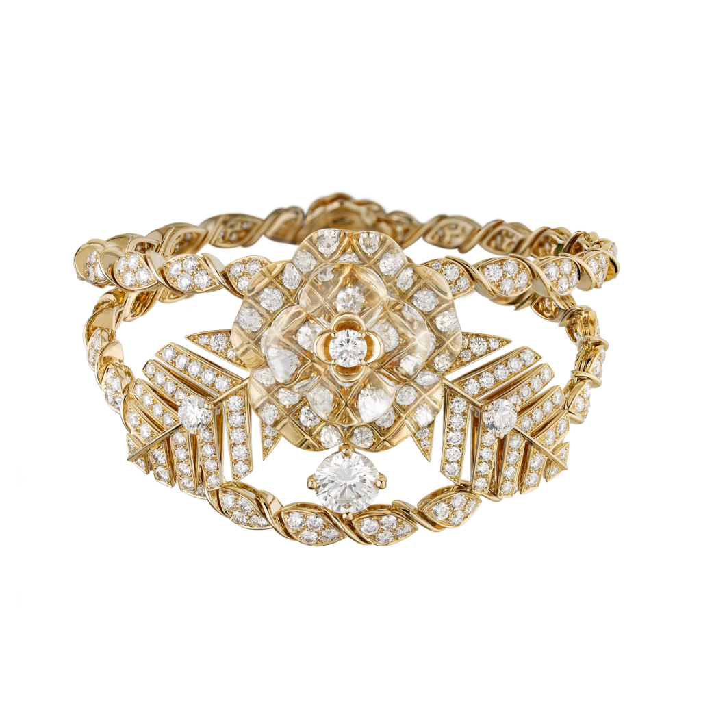 Pour Camélia Vénitien, CHANEL a traduit dans la joaillerie le travail du verre, propre à l’île de Murano, en employant du cristal de roche marié à de l’or jaune. Taillé dans cette gemme translucide, la fleur fétiche est ornée de festons, au centre d’un plastron immaculé qui rappelle les ornements des miroirs vénitiens de l’appartement de la rue Cambon. Ce collier se termine par un diamant rond de 1,5 carat. Une bague feuillage ornée d’un diamant rond, une paire de boucles d’oreilles asymétriques et une montre-bijou complètent admirablement cette parure.