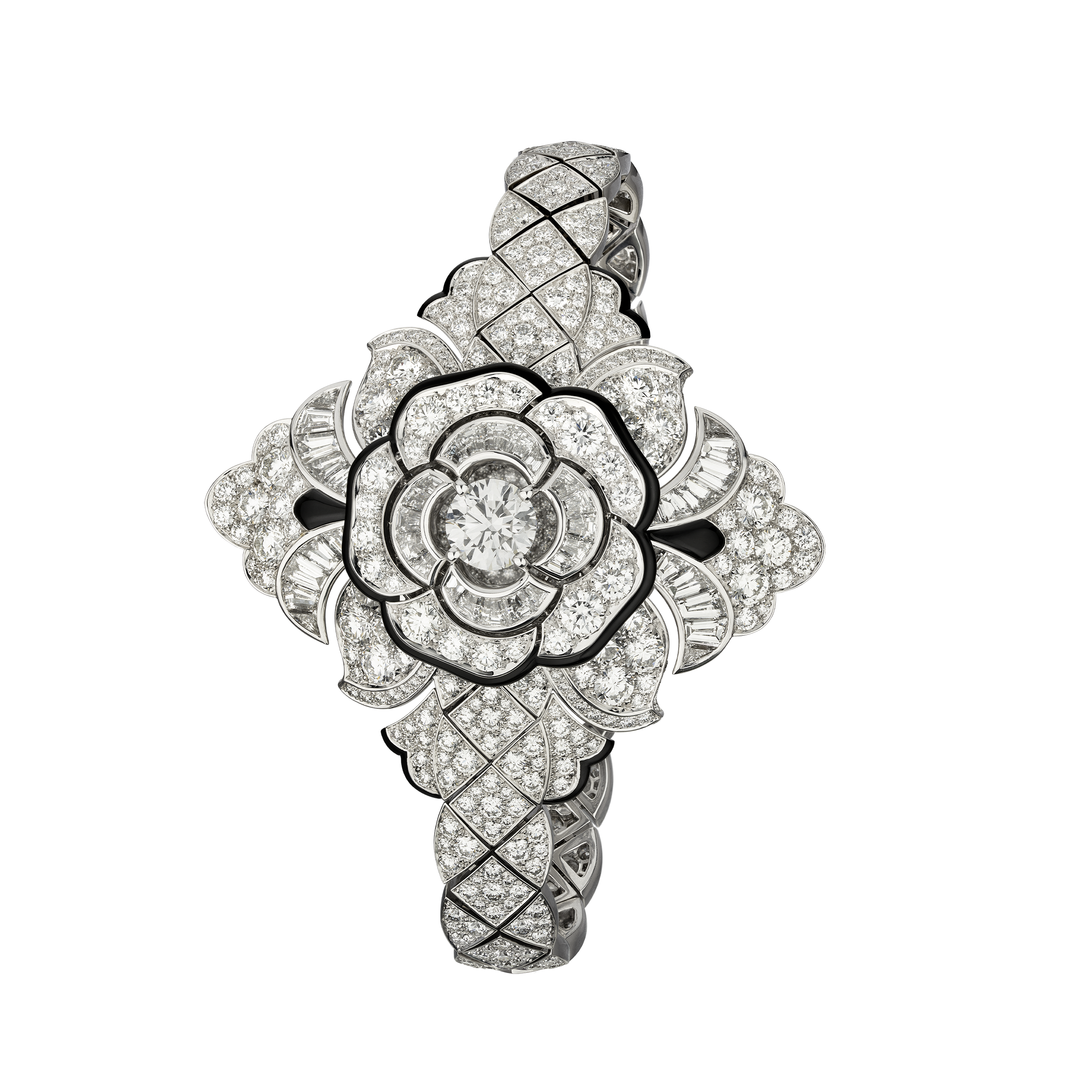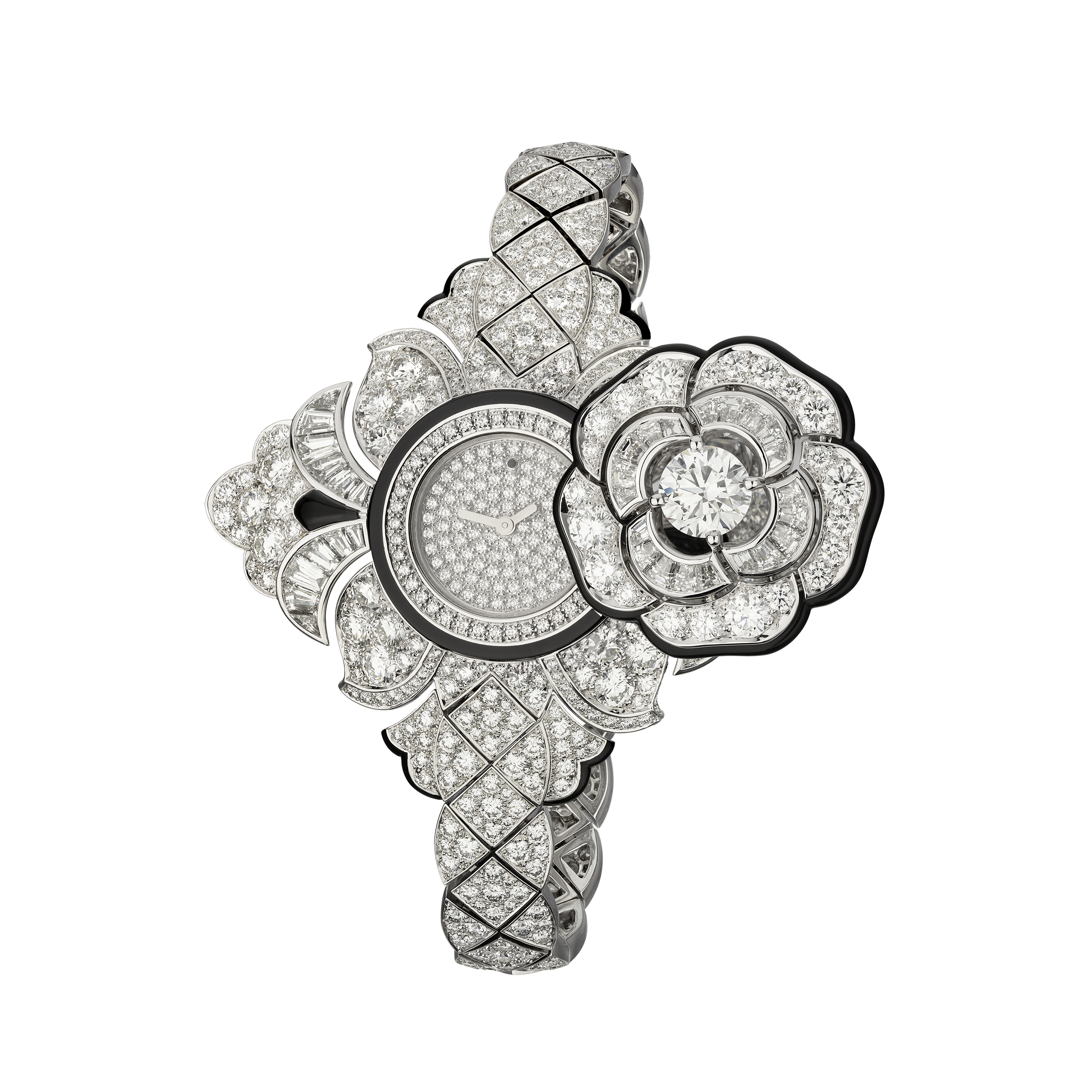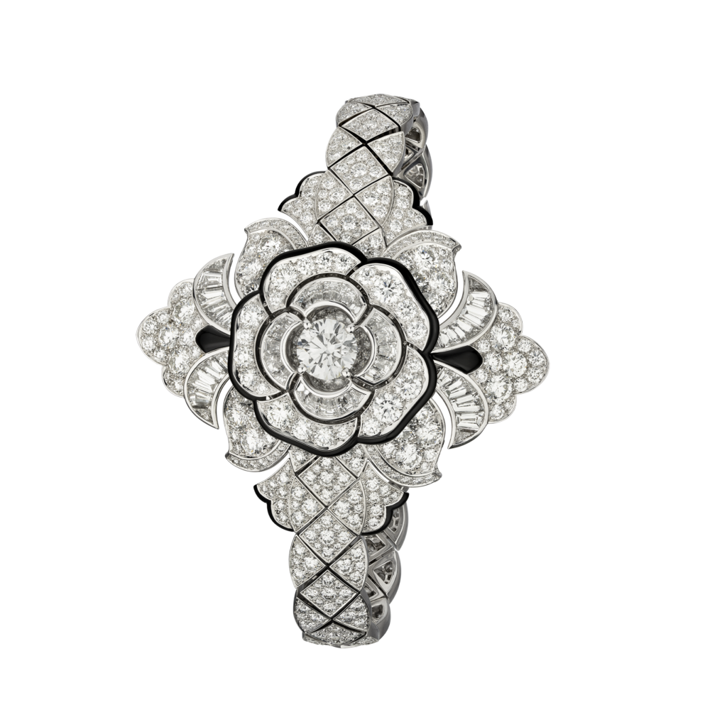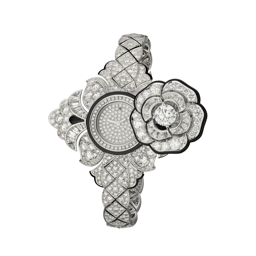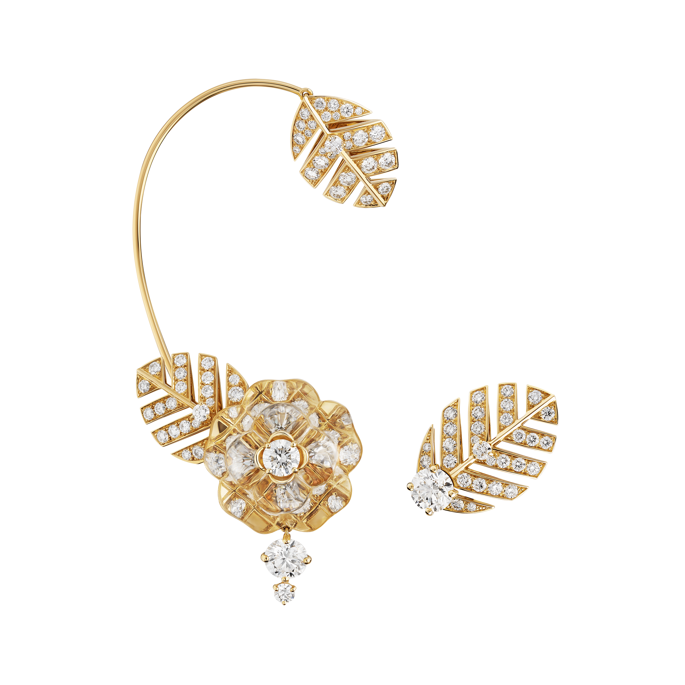 Pour Camélia Vénitien, CHANEL a traduit dans la joaillerie le travail du verre, propre à l’île de Murano, en employant du cristal de roche marié à de l’or jaune. Taillé dans cette gemme translucide, la fleur fétiche est ornée de festons, au centre d’un plastron immaculé qui rappelle les ornements des miroirs vénitiens de l’appartement de la rue Cambon. Ce collier se termine par un diamant rond de 1,5 carat. Une bague feuillage ornée d’un diamant rond, une paire de boucles d’oreilles asymétriques et une montre-bijou complètent admirablement cette parure.