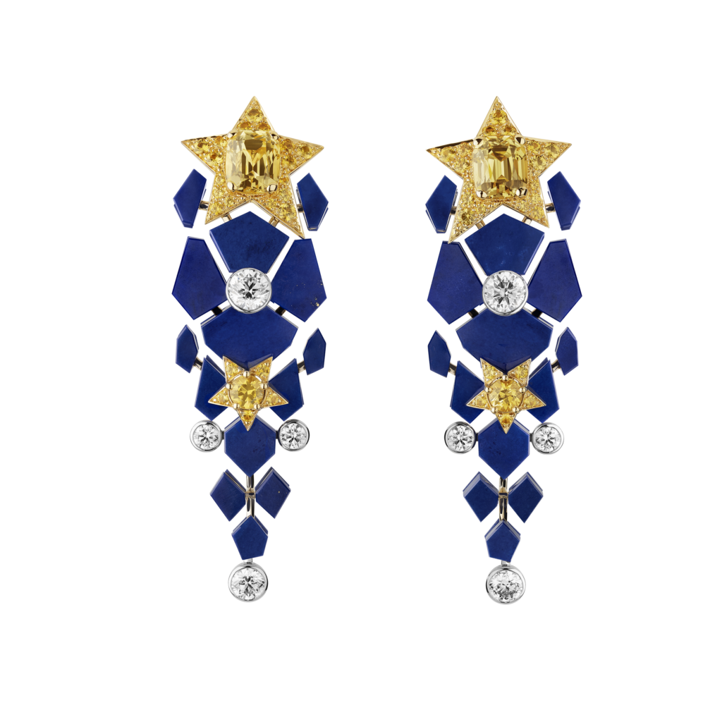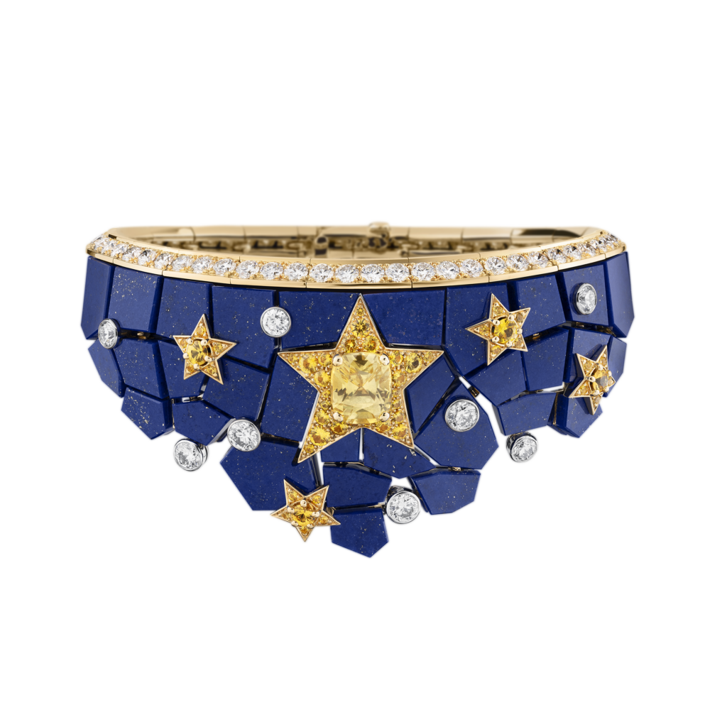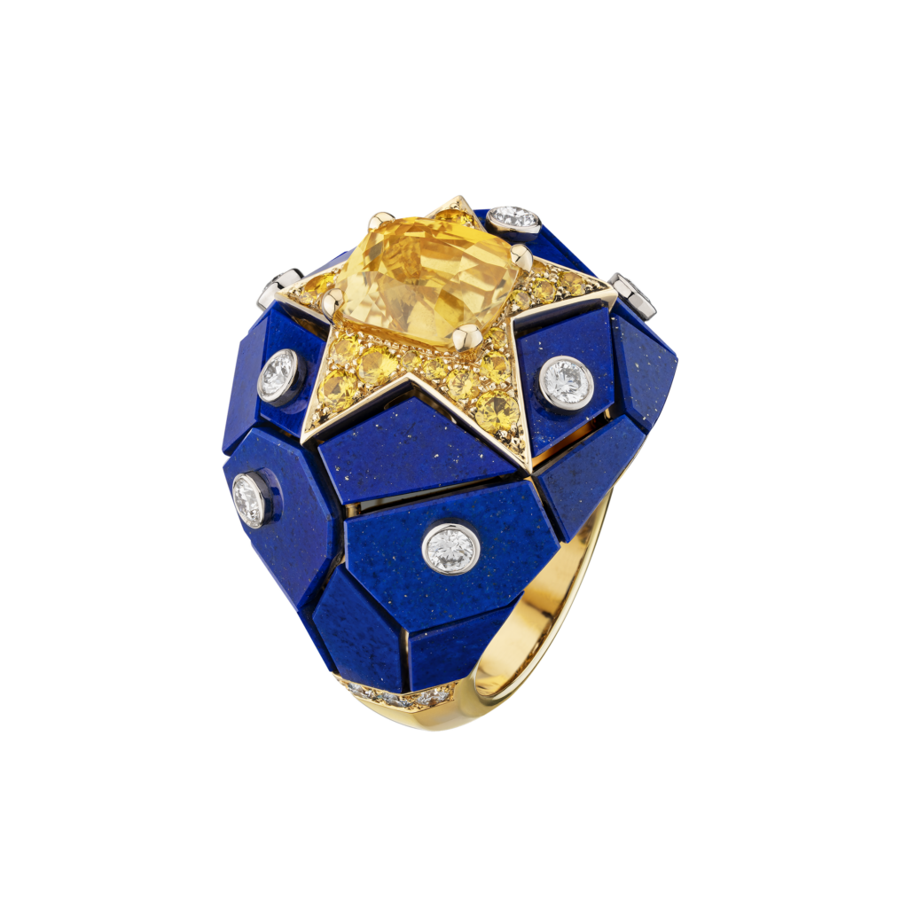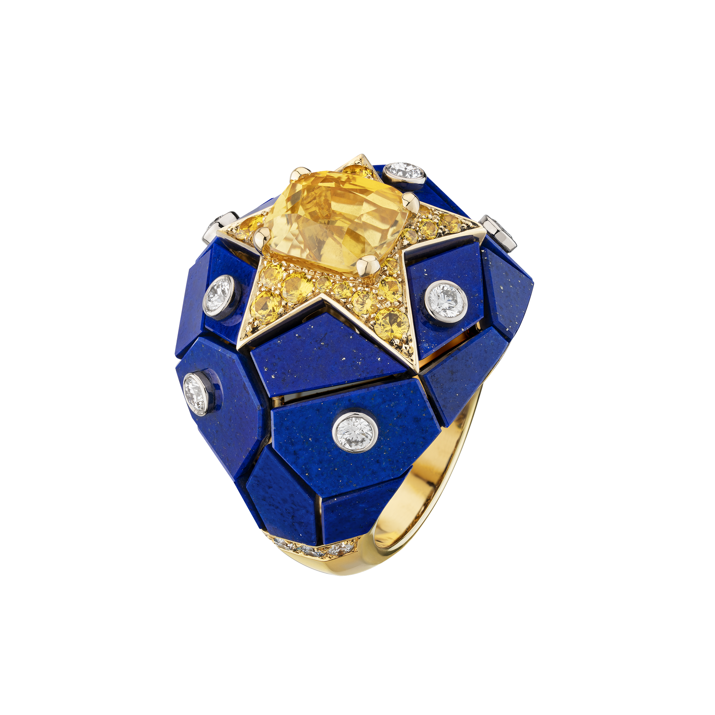 L’astre central serti d’un saphir jaune de 4,47 carats rayonne sur une nuée d’étoiles que l’on retrouve sur un bracelet et une paire de boucles d’oreilles au relief majestueux. Enfin, la gemme bleue, facettée comme un brillant, forme une bague étoilée sertie d’un saphir jaune taille coussin de 4,25 carats