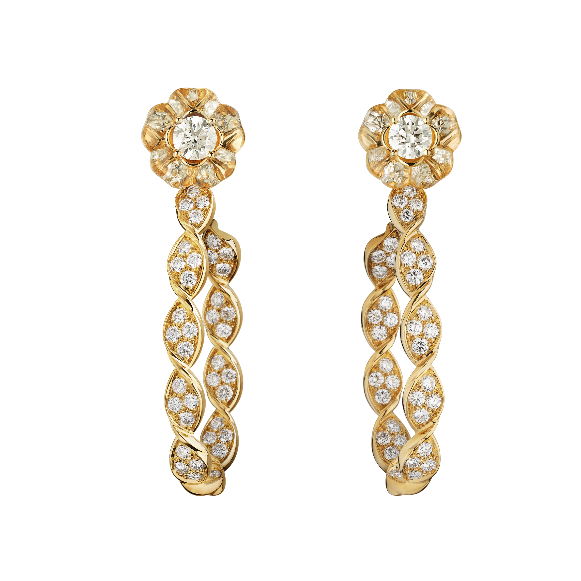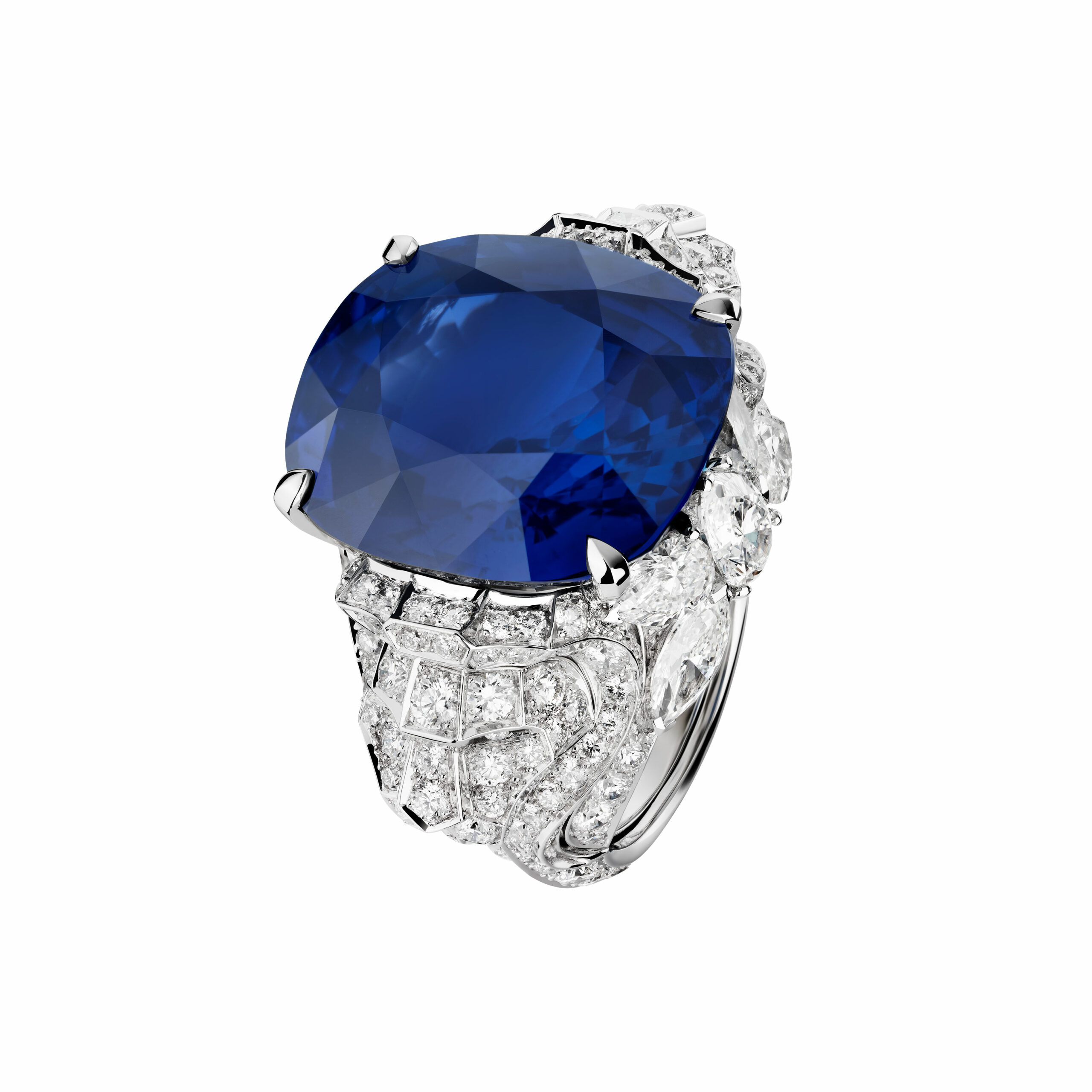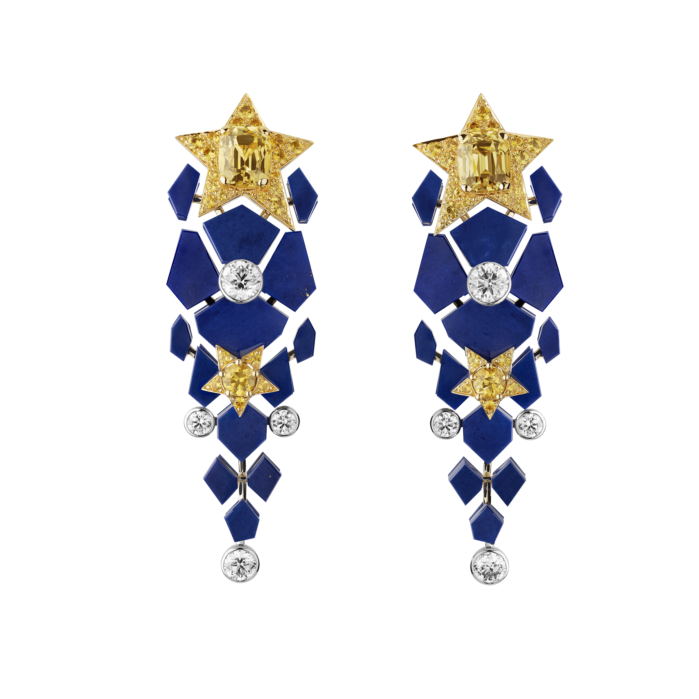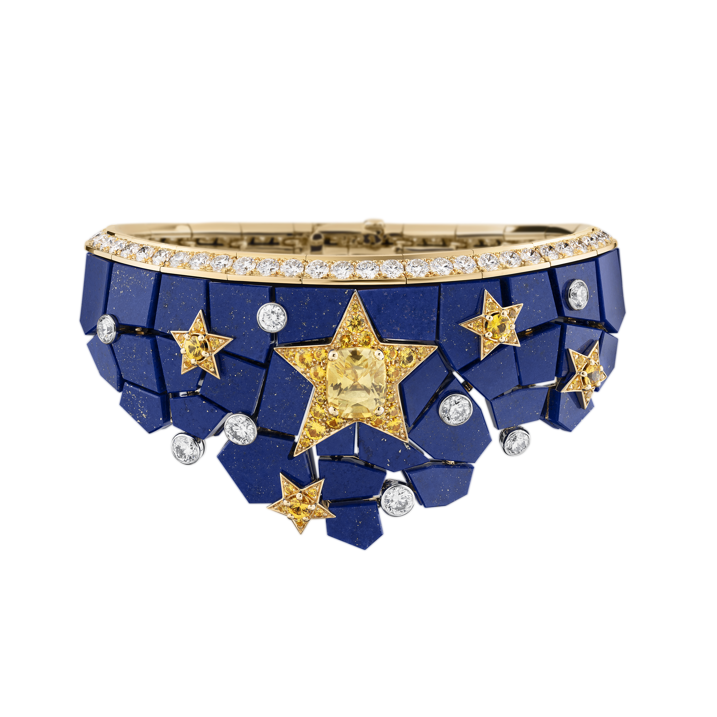 L’astre central serti d’un saphir jaune de 4,47 carats rayonne sur une nuée d’étoiles que l’on retrouve sur un bracelet et une paire de boucles d’oreilles au relief majestueux. Enfin, la gemme bleue, facettée comme un brillant, forme une bague étoilée sertie d’un saphir jaune taille coussin de 4,25 carats