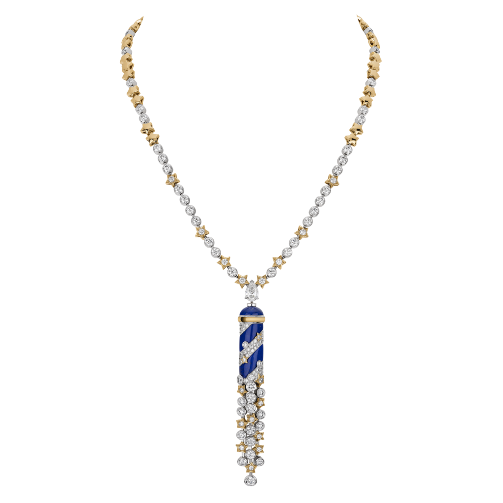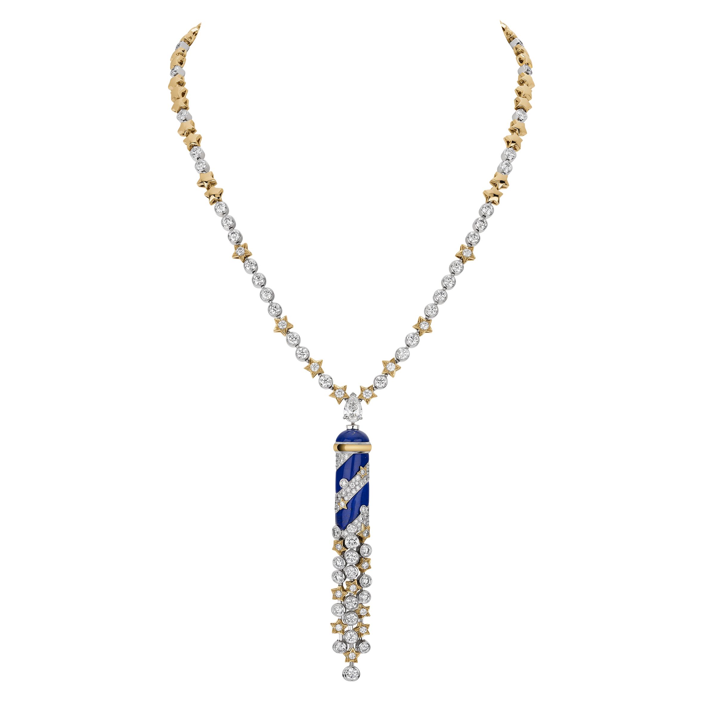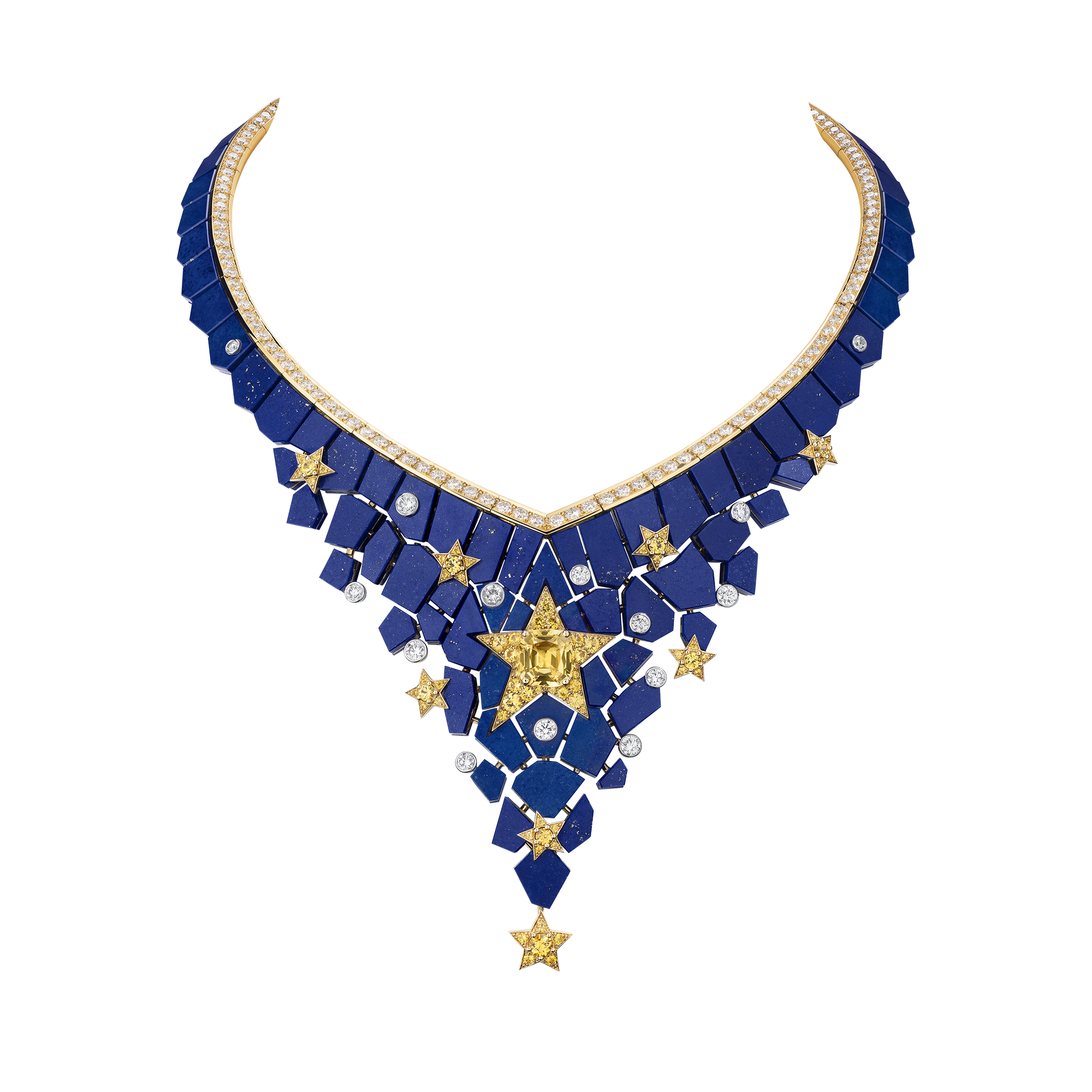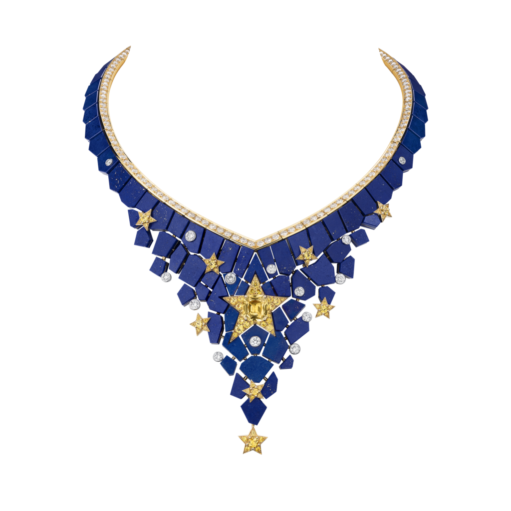 Constellation Astrale. Il en ressort un collier nocturne taillé dans une puissante mosaïque de lapis-lazuli.