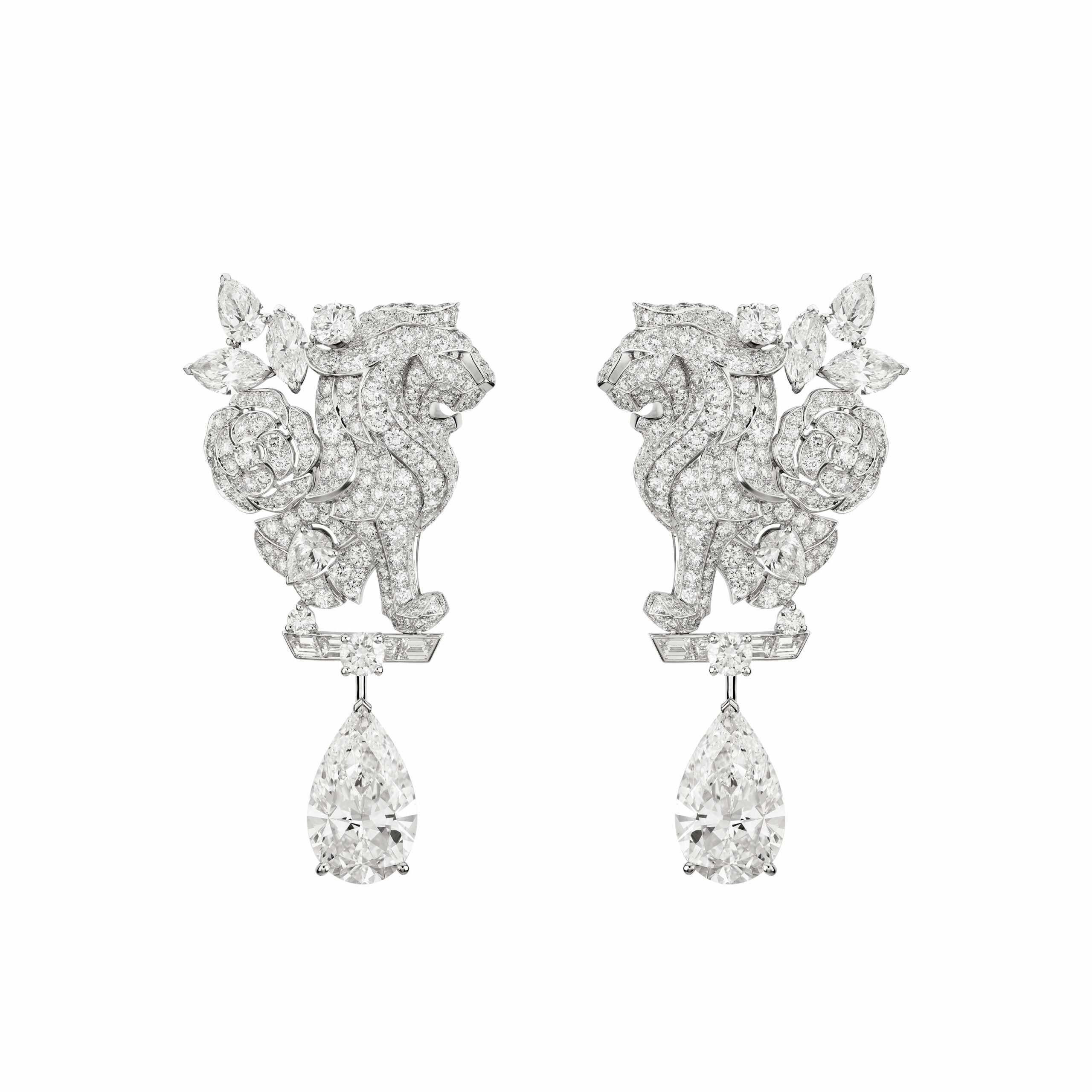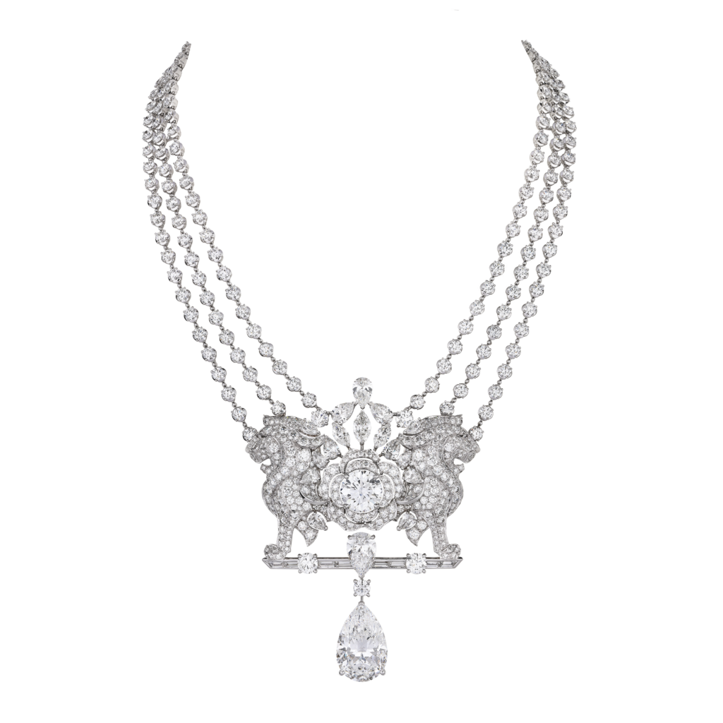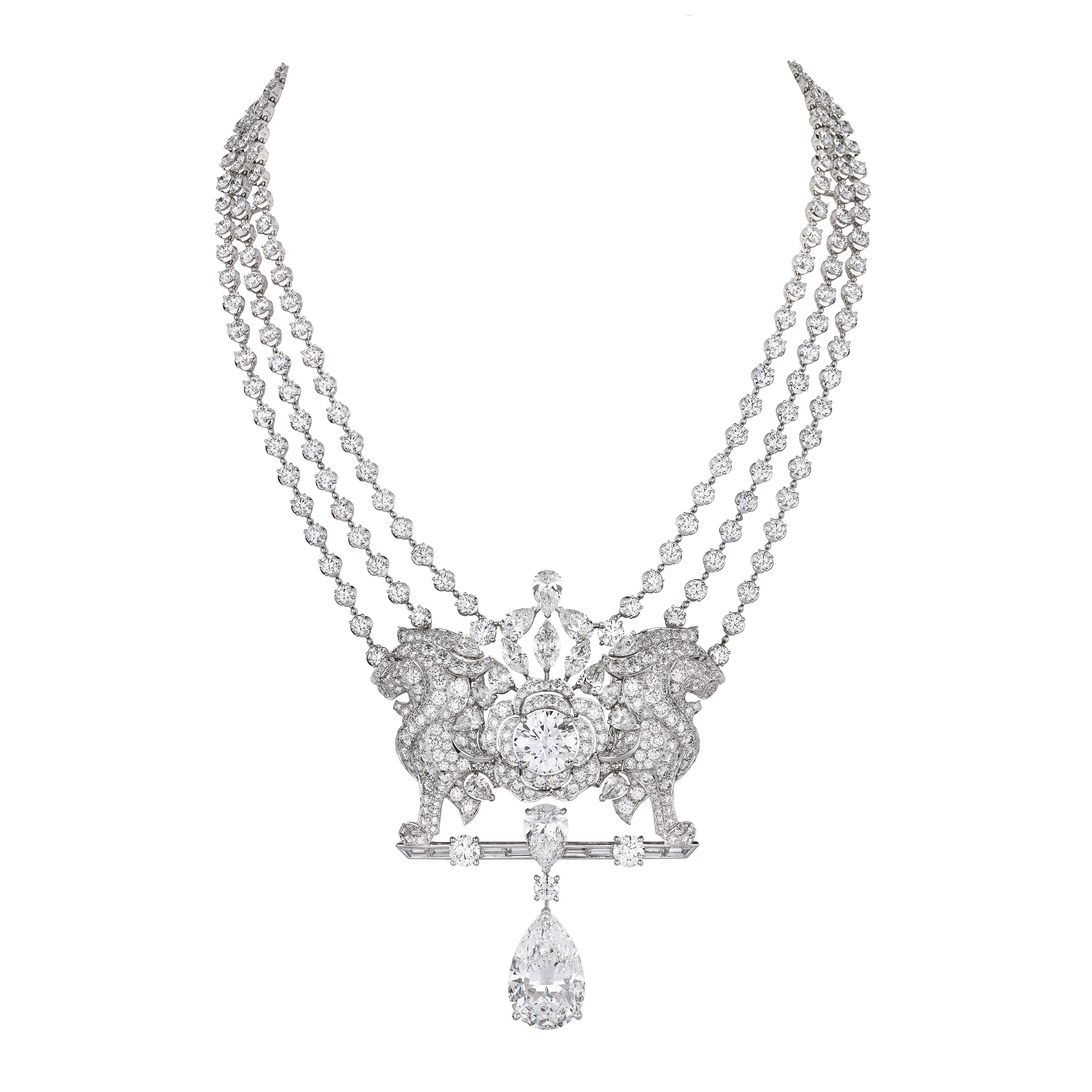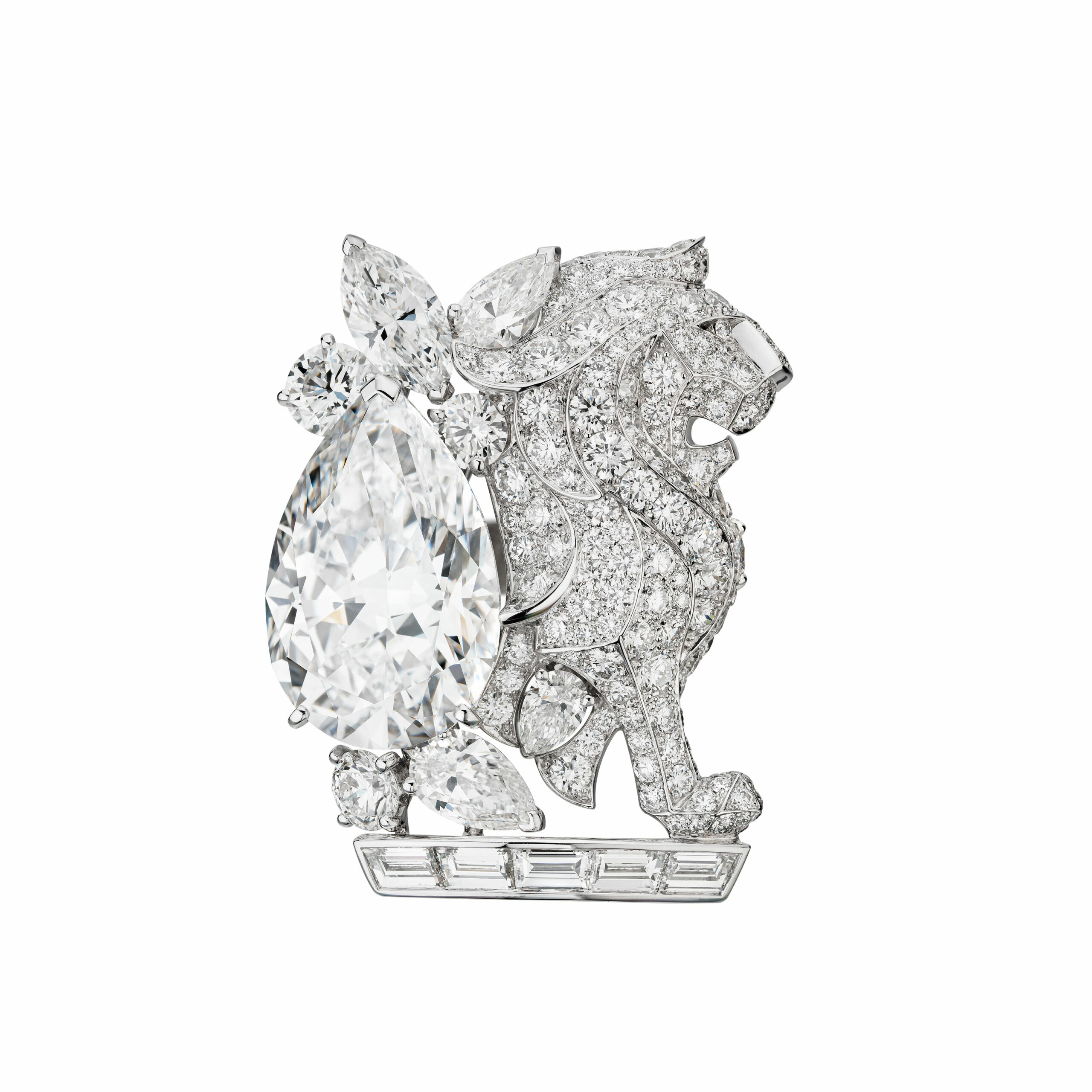 Monochrome, le collier Lion Secret montre le profil de deux fauves en or blanc sertis de diamants de taille poire et navette sur la crinière veillant sur un diamant poire de 15,55 carats. Tel un bas-relief, ce duo unique apparaît sur un bracelet souple en mailles de diamants.