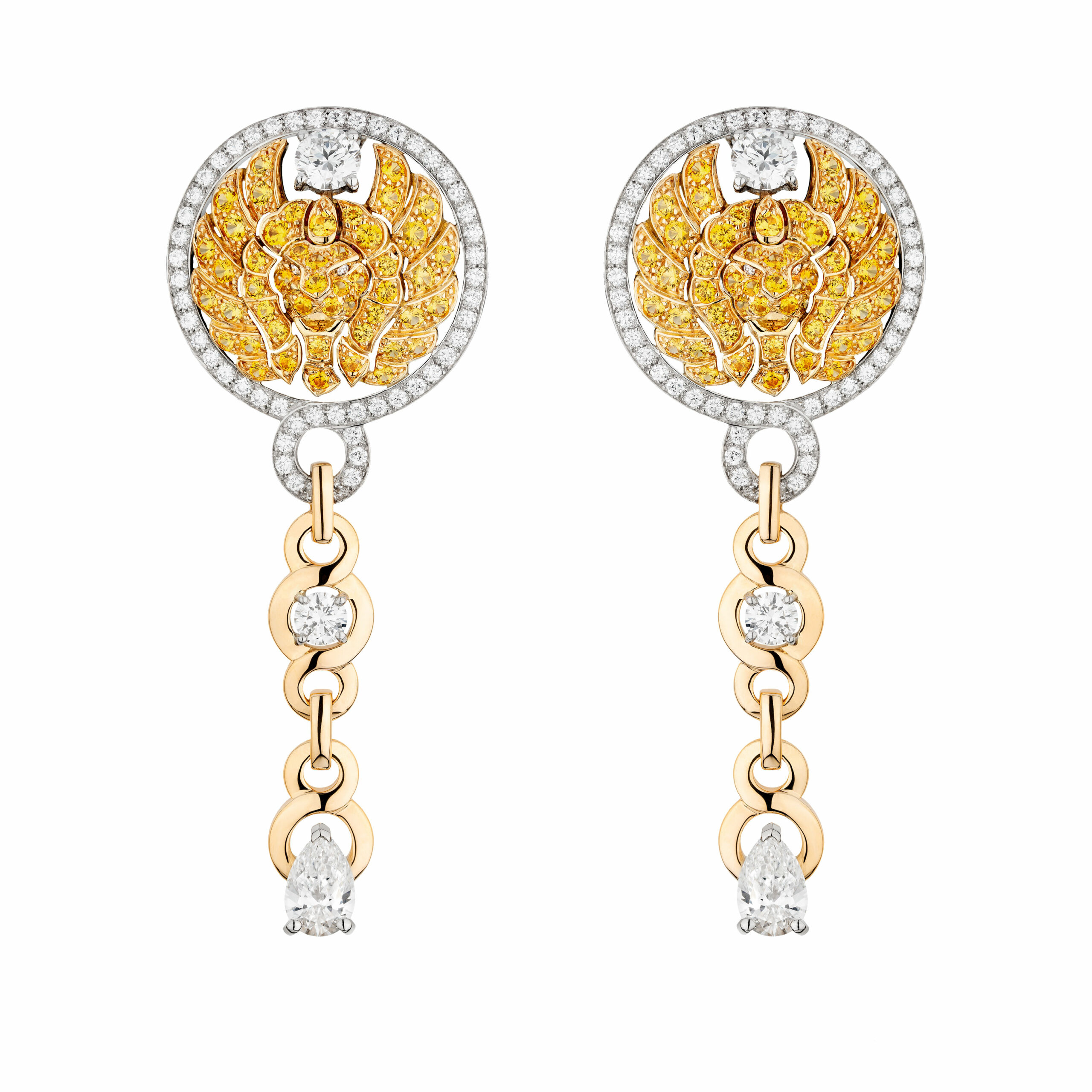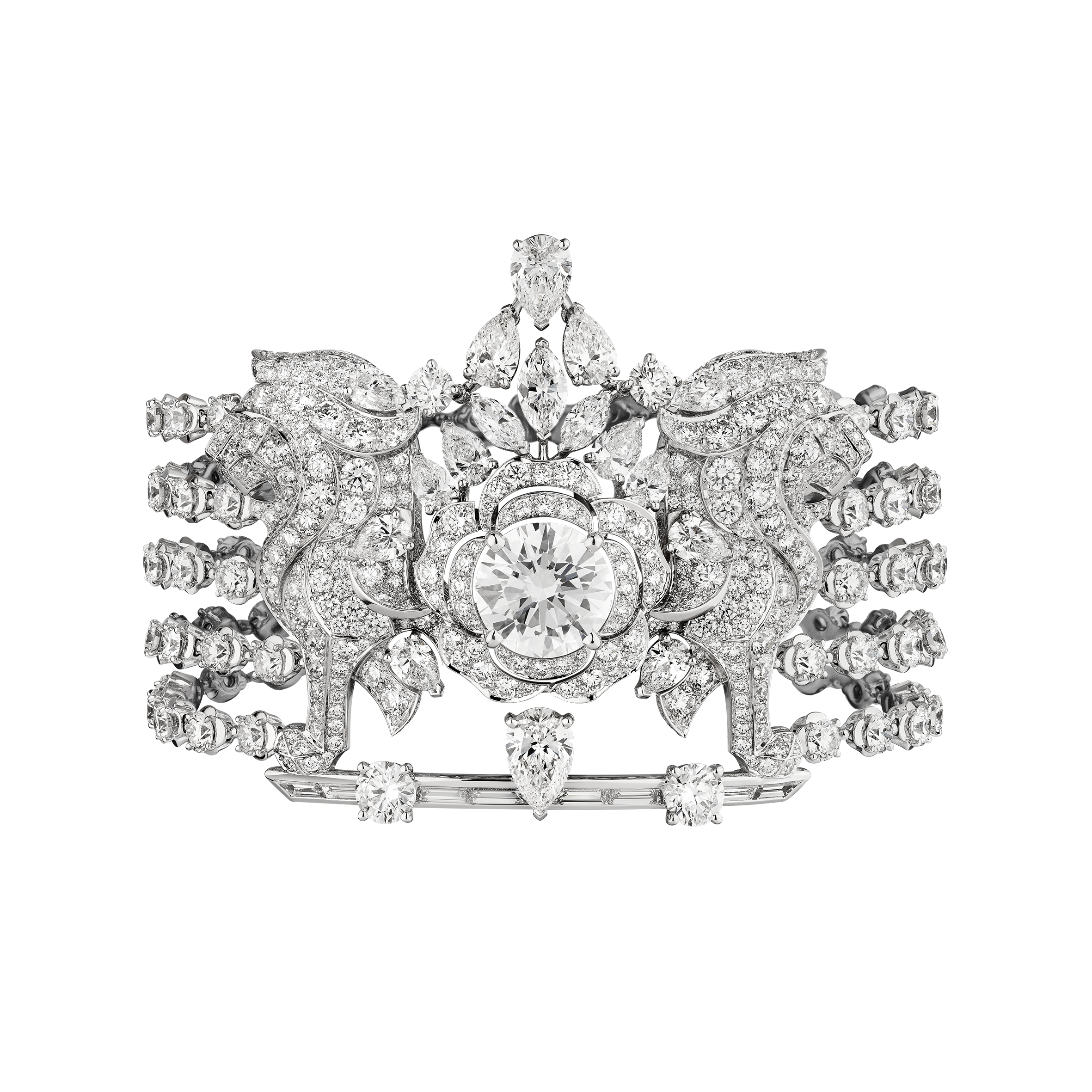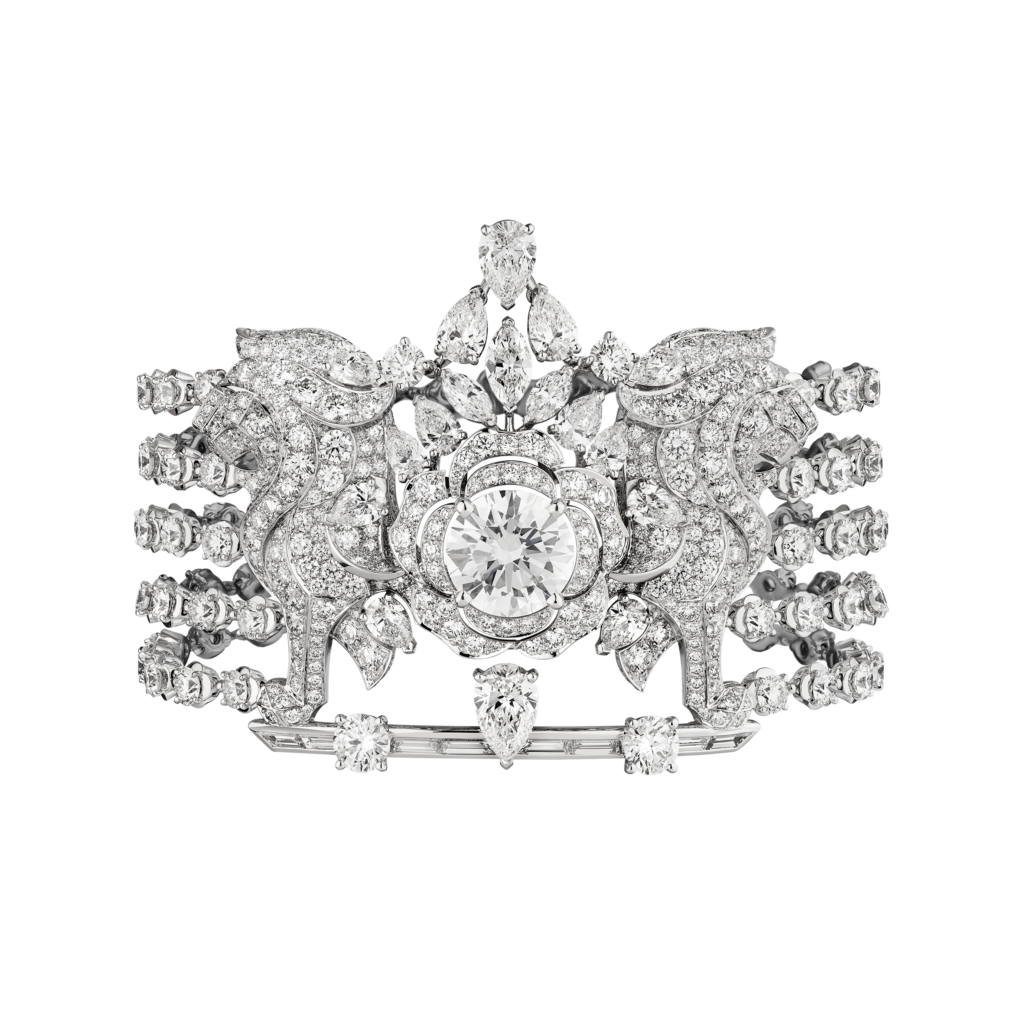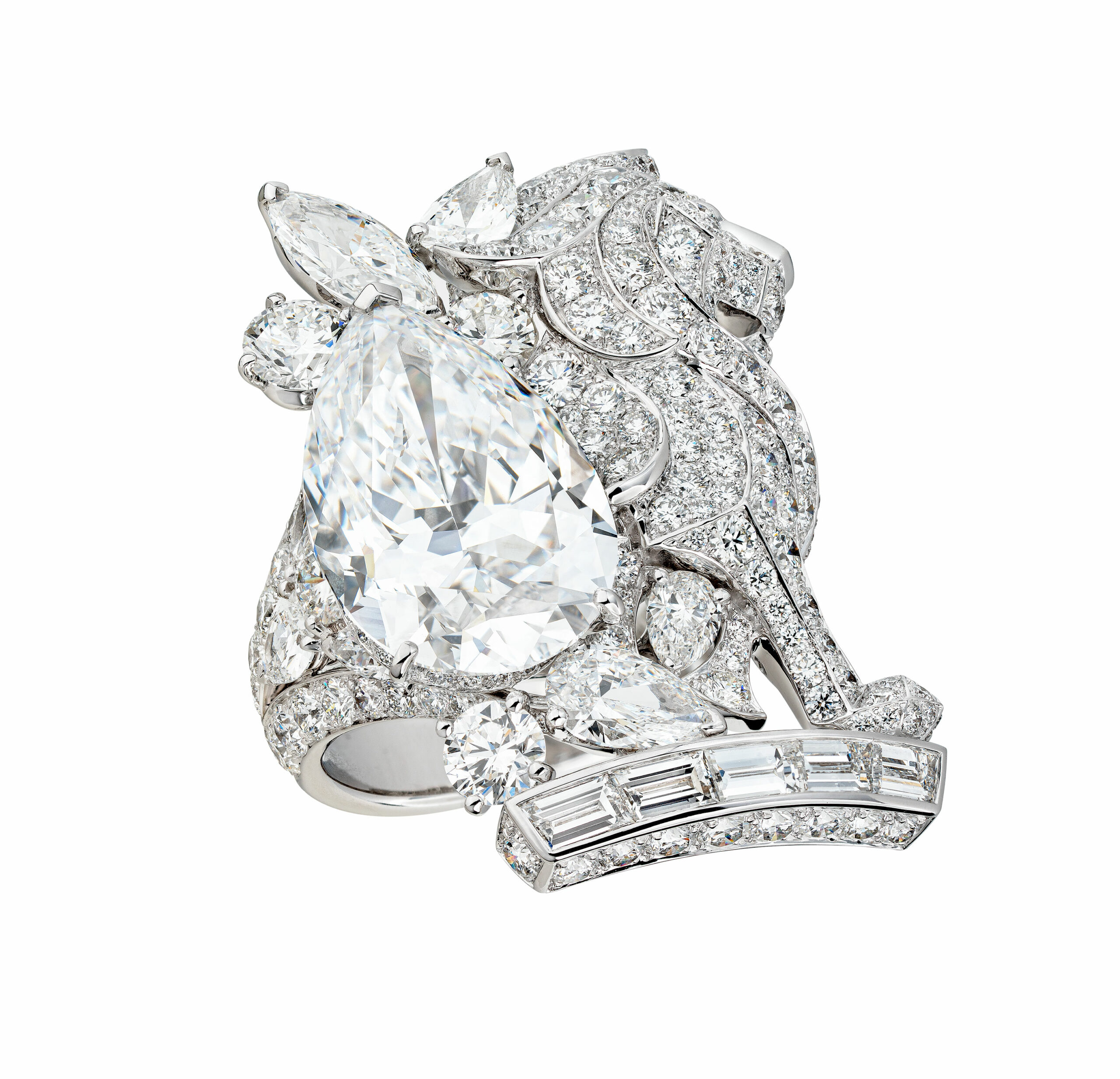 Monochrome, le collier Lion Secret montre le profil de deux fauves en or blanc sertis de diamants de taille poire et navette sur la crinière veillant sur un diamant poire de 15,55 carats. Tel un bas-relief, ce duo unique apparaît sur un bracelet souple en mailles de diamants.