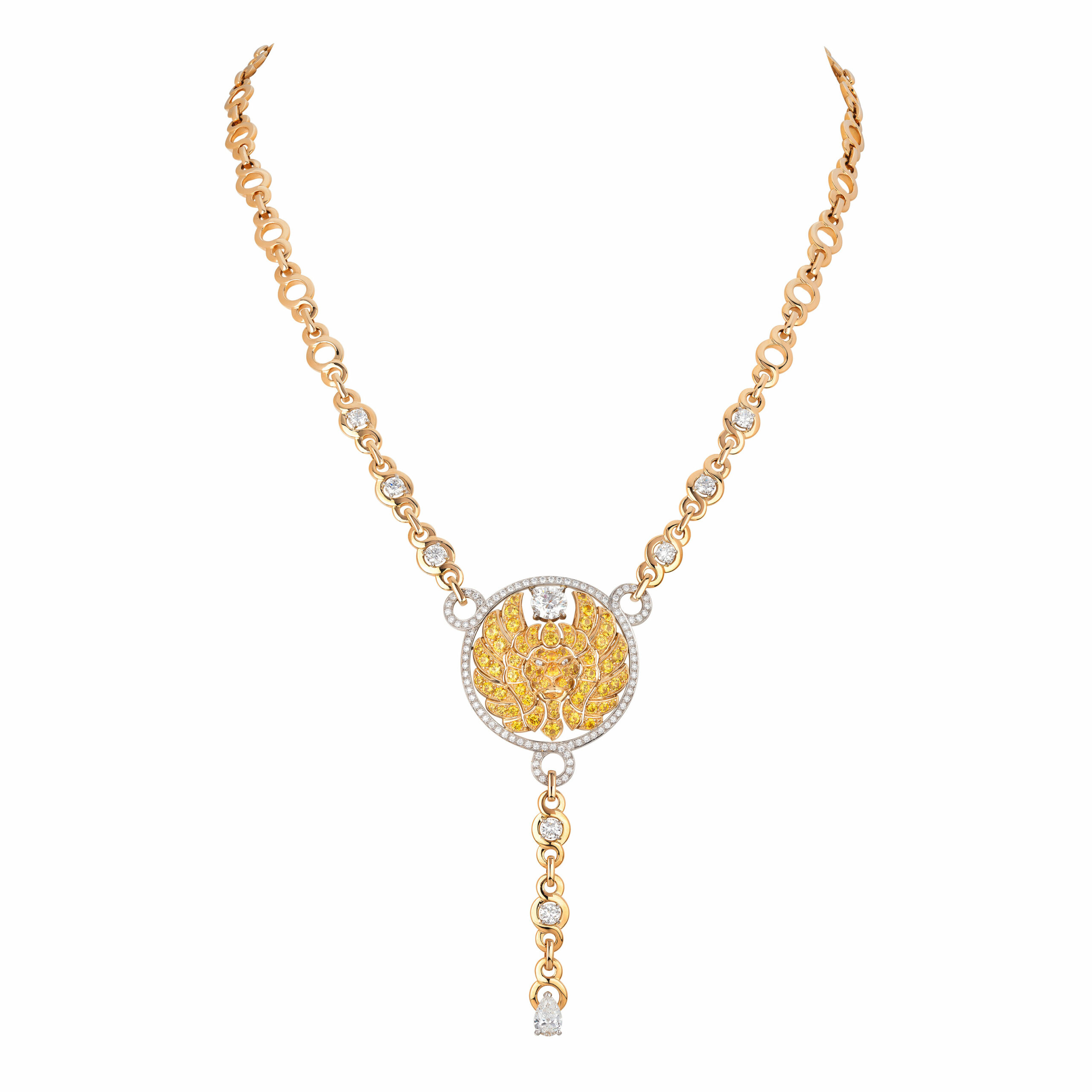 Lion Secret joue la carte de la couleur sur un sautoir à trois rangs. Il conjugue des beads de spinelles rouges et de lapis-lazuli avec deux lions souverains au pelage de saphirs jaunes.