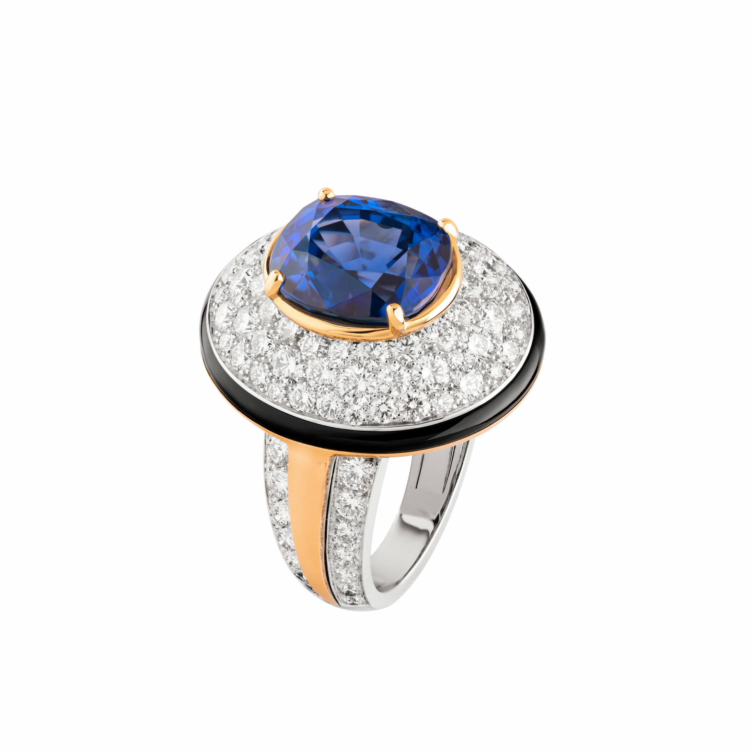 Dans un style néo-baroque, la parure Sérénissime ravive, sous un jour contemporain, l’esprit byzantin des mosaïques de la « basilique d’or ». A l’instar de ce plastron composé de carrés d’onyx et de brillants où des tesselles de saphirs roses, jaunes et orangés, des grenats spessartites réfléchissent la lumière sur un saphir jaune ovale de 27,09 carats auréolé d’une pluie de diamants. Une bague, d’architecture puissante, porte une croix d’onyx, de saphirs jaunes et orangés et de brillants où resplendit un saphir Padparadscha de 6,04 carats.