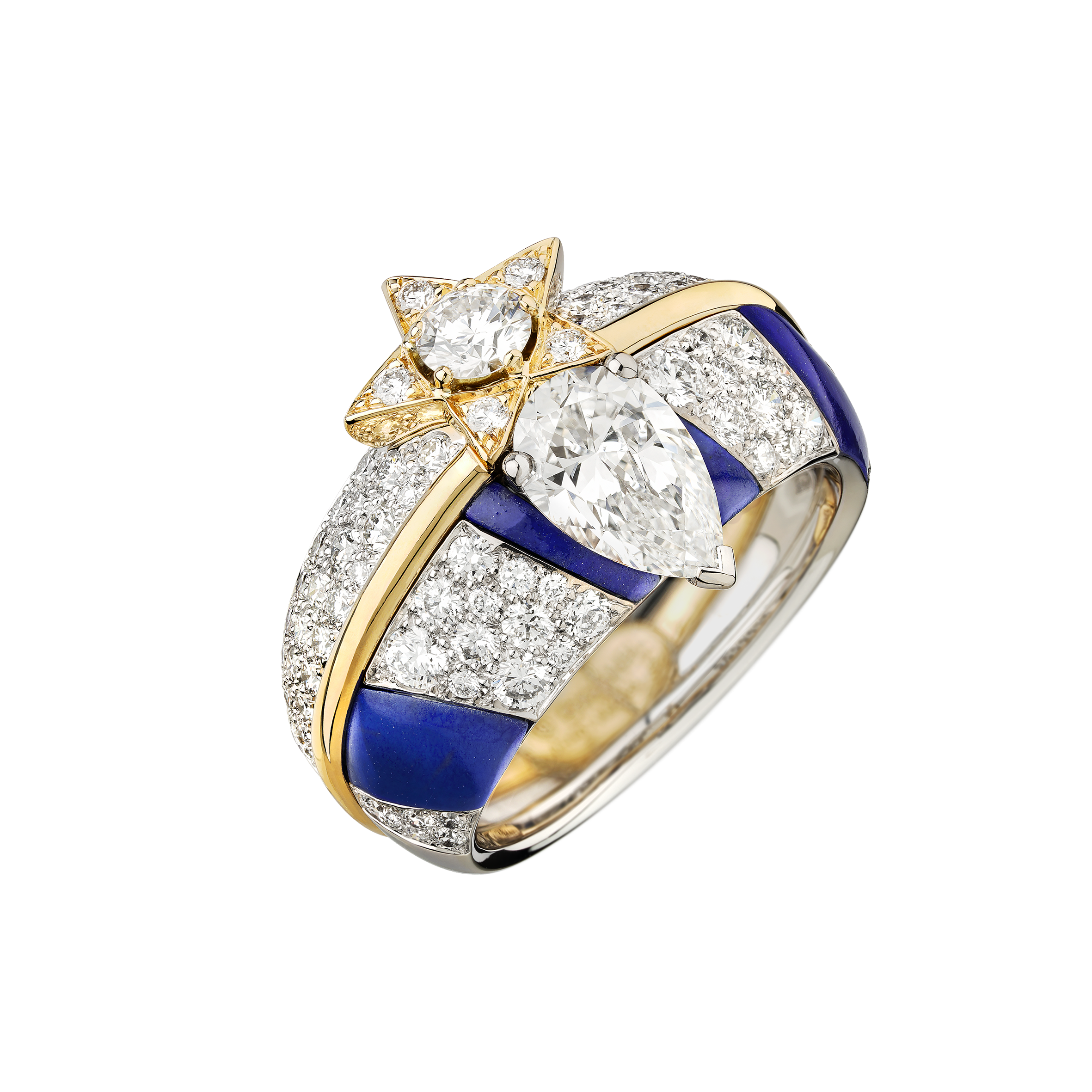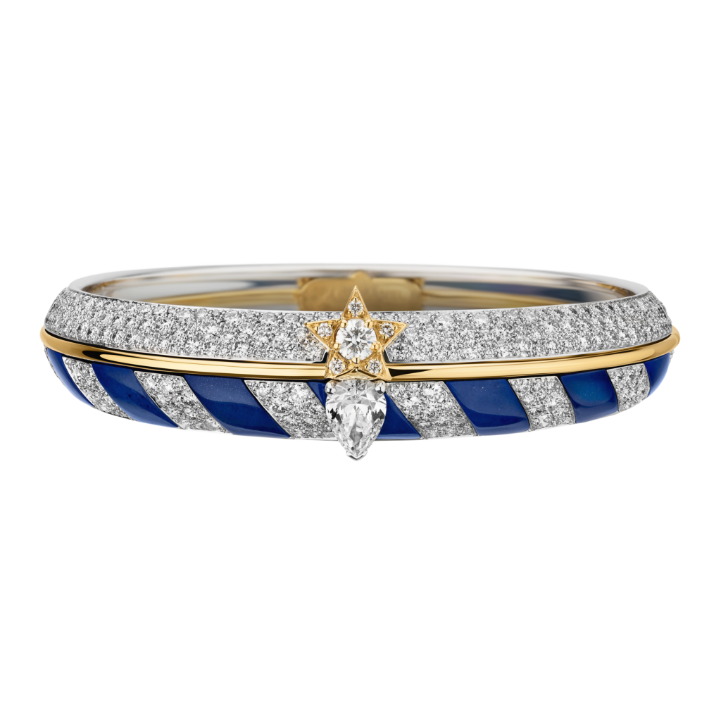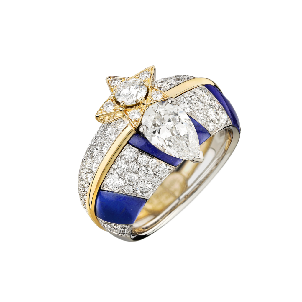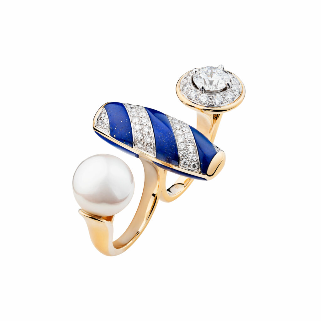 Volute Marine travaille en volume cet élément de la lagune sur un pendentif en lapis-lazuli et brillants suspendu à un rail avec une alternance d’éléments en diamants de forme étoilée et de pierres serties clos. Il s’accompagne d’une paire de boucles d’oreilles et d’un jonc au pavage asymétrique uni et rayé sur lequel repose une emblématique comète d’or jaune unie à un diamant poire de 1 carat.