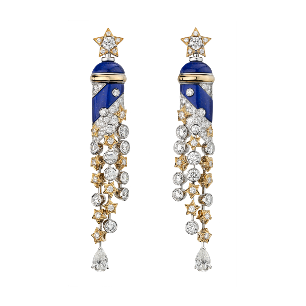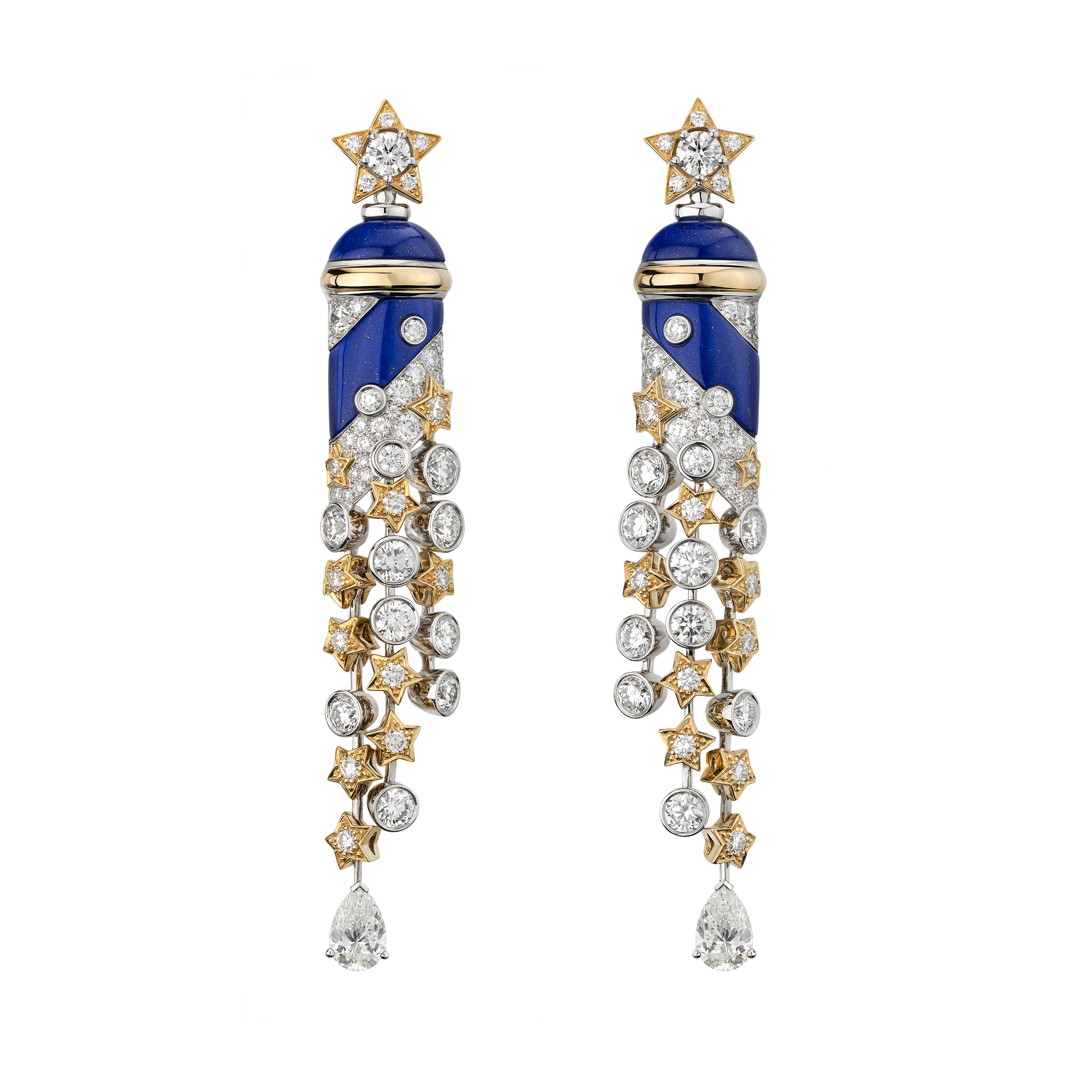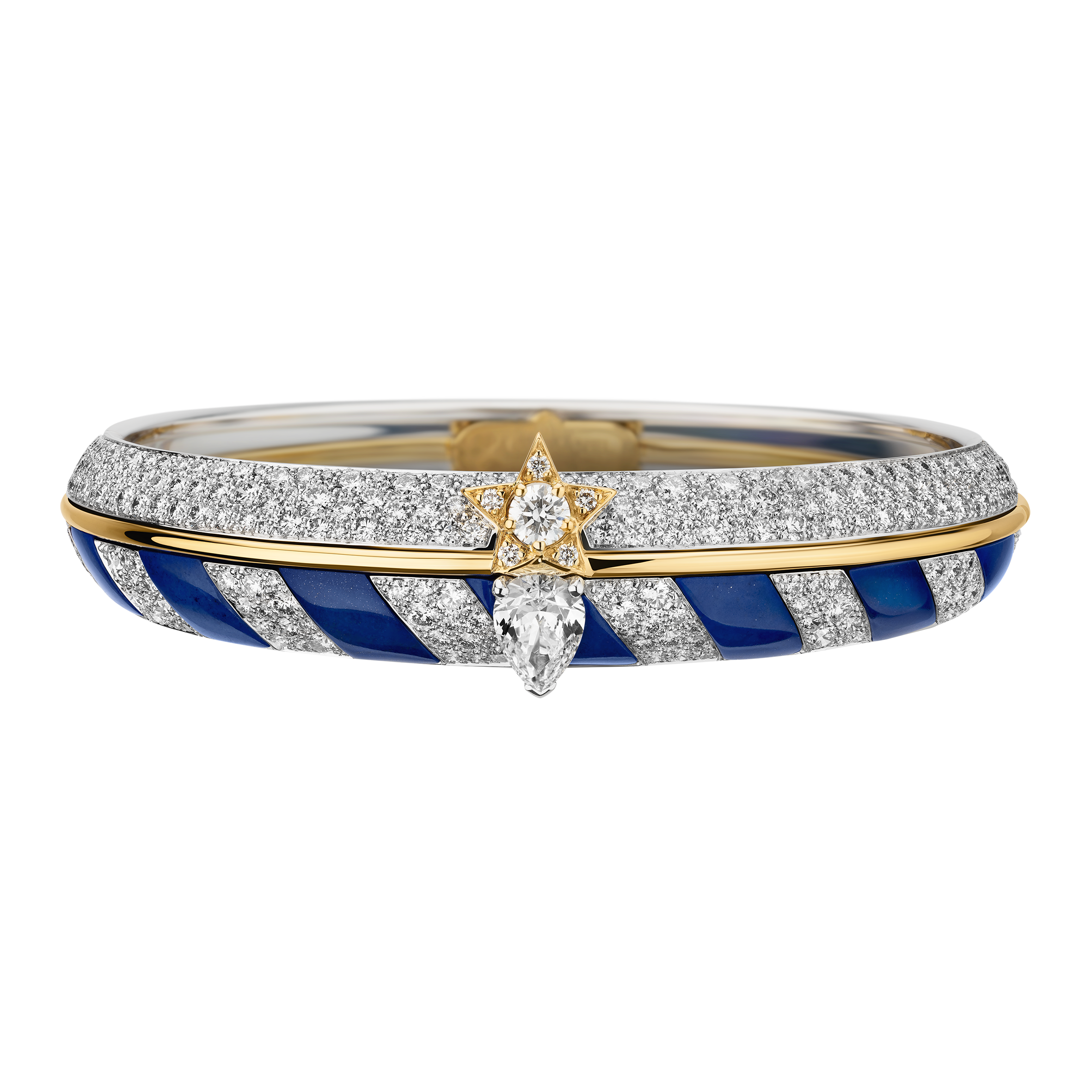 Volute Marine travaille en volume cet élément de la lagune sur un pendentif en lapis-lazuli et brillants suspendu à un rail avec une alternance d’éléments en diamants de forme étoilée et de pierres serties clos. Il s’accompagne d’une paire de boucles d’oreilles et d’un jonc au pavage asymétrique uni et rayé sur lequel repose une emblématique comète d’or jaune unie à un diamant poire de 1 carat.