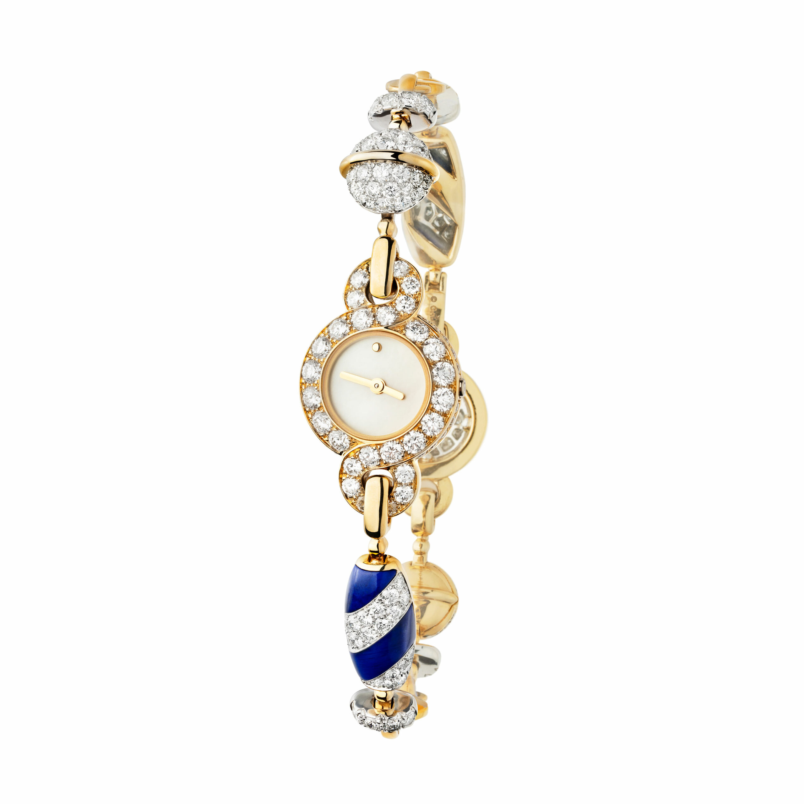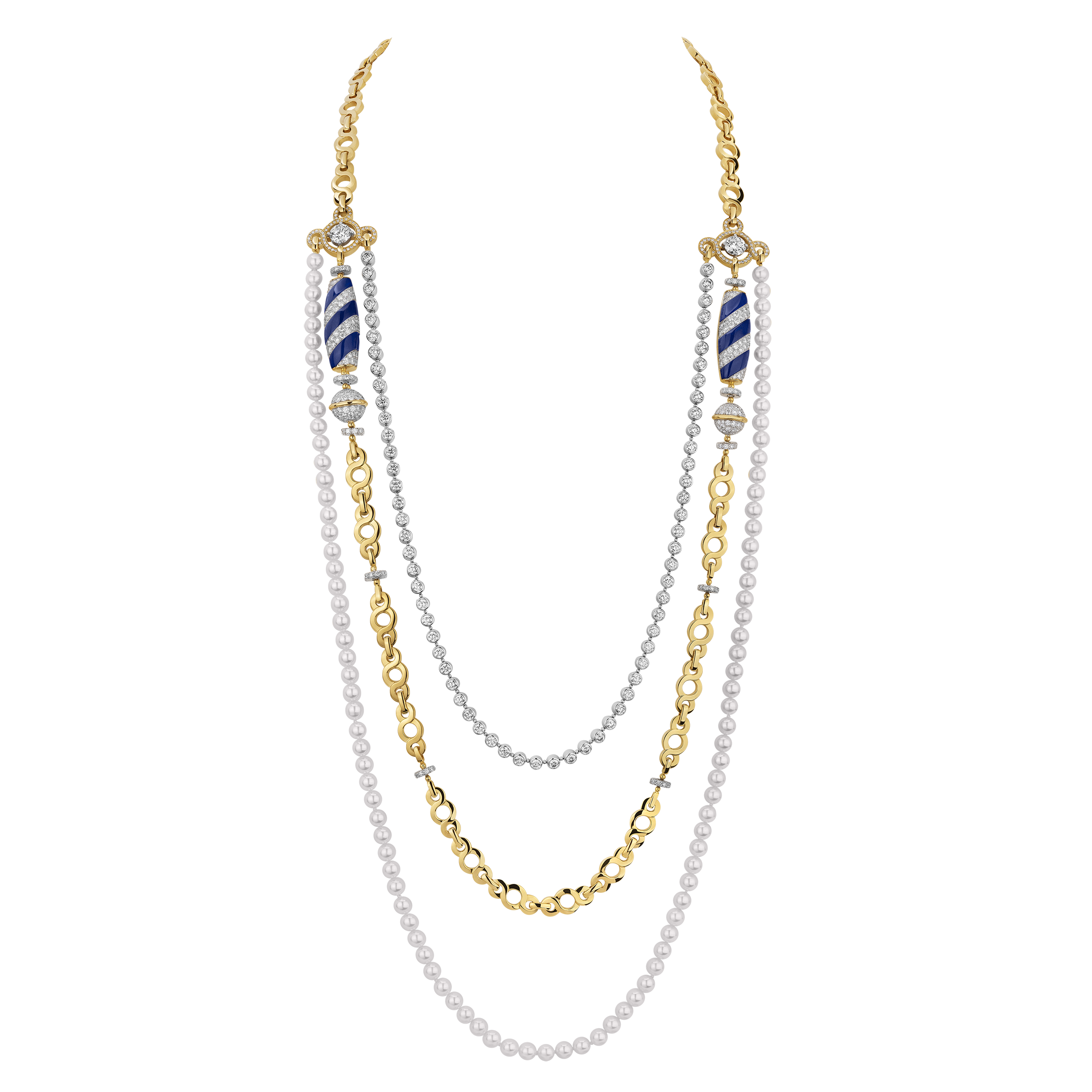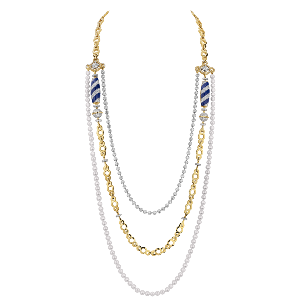 Quatre parures d’une grande fluidité traduisent l’élégance du nautique. Volute Vénitienne met en scène les palines d’amarrage blanches et bleues des gondoles. Elles apparaissent ici en lapis-lazuli et diamants, rythmant un grand sautoir à trois rangs en perles et maillons d’or jaune. Dans le même accord chromatique,