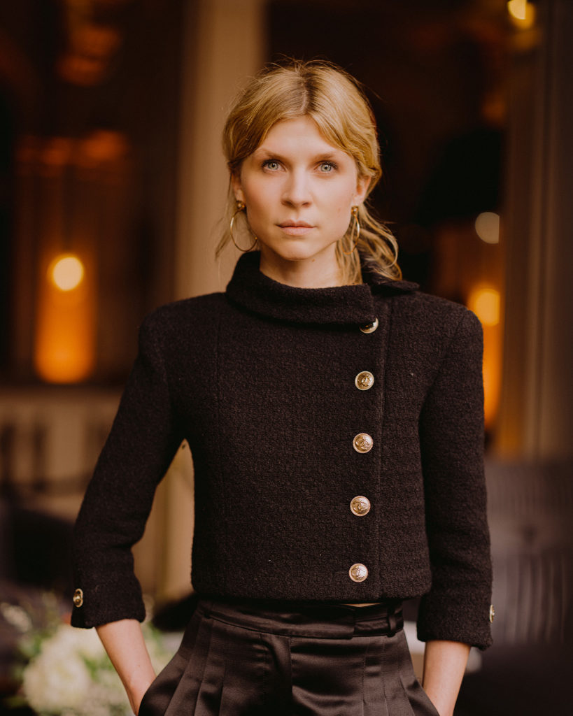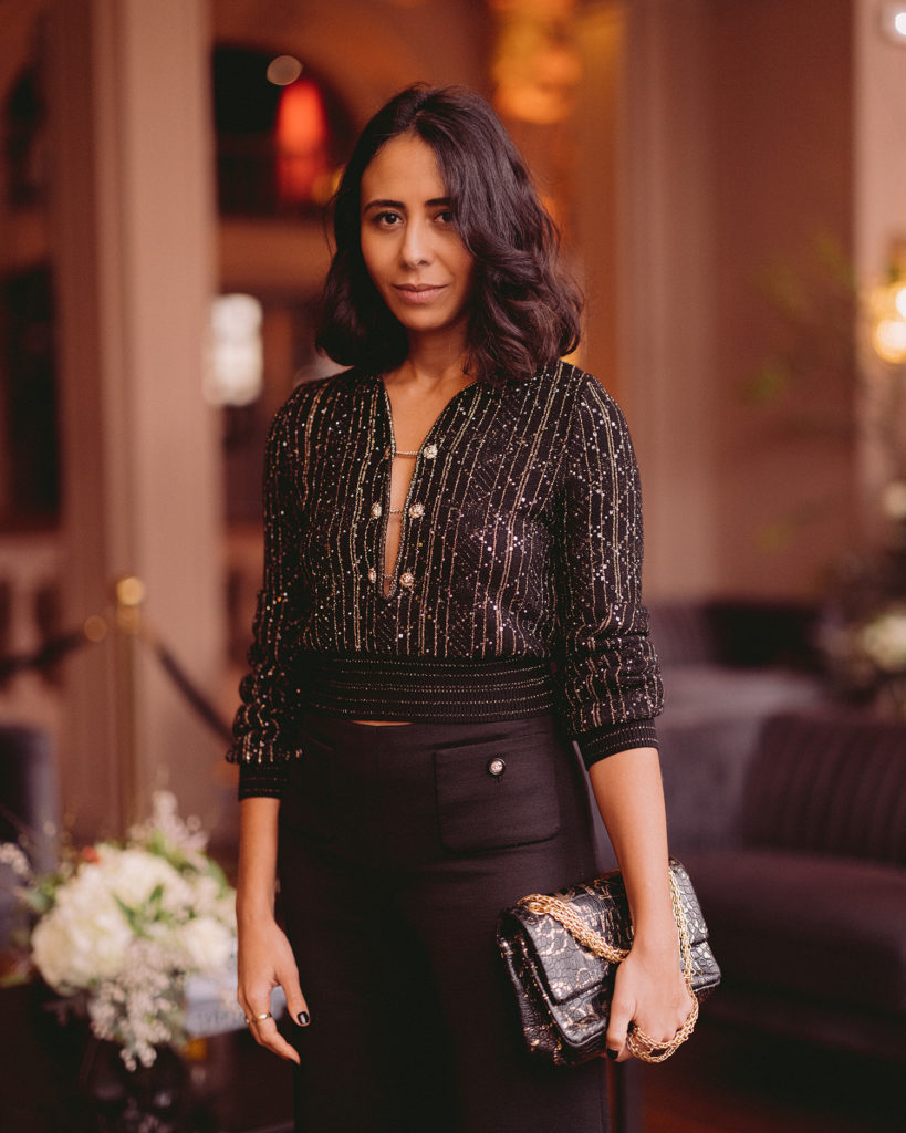 Elle portait une veste en laine noire, look 42 de la collection Métiers d’art Paris – 31, rue Cambon 2019/20, avec un pantalon de soie noir, look 6 de la collection Prêt-à-porter Automne-Hiver 2018/19. Souliers CHANEL.