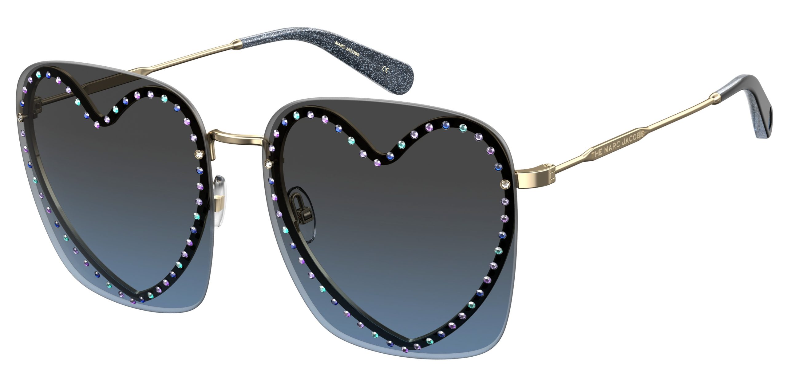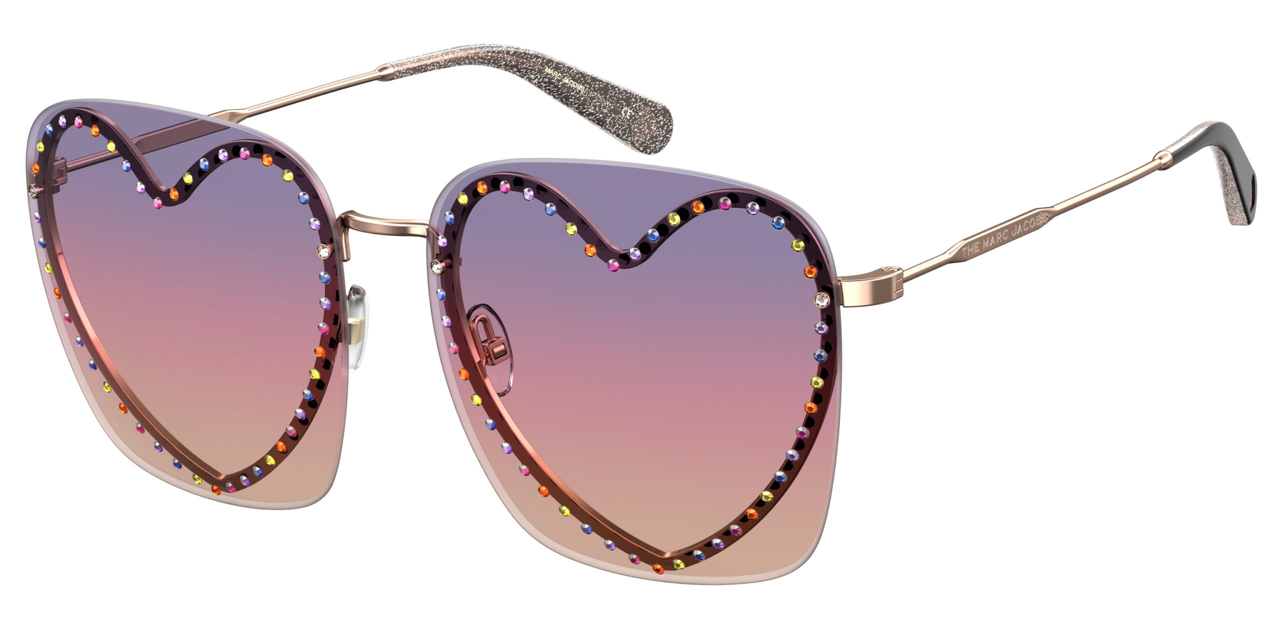 les lunettes de soleil carrées marc 493/s sont disponibles en or avec cristaux multicolores et verres gris/violet, or avec verres gris, azur avec verres dégradés azur, or avec verres gris et clous dorés et pêche avec verres roses.
