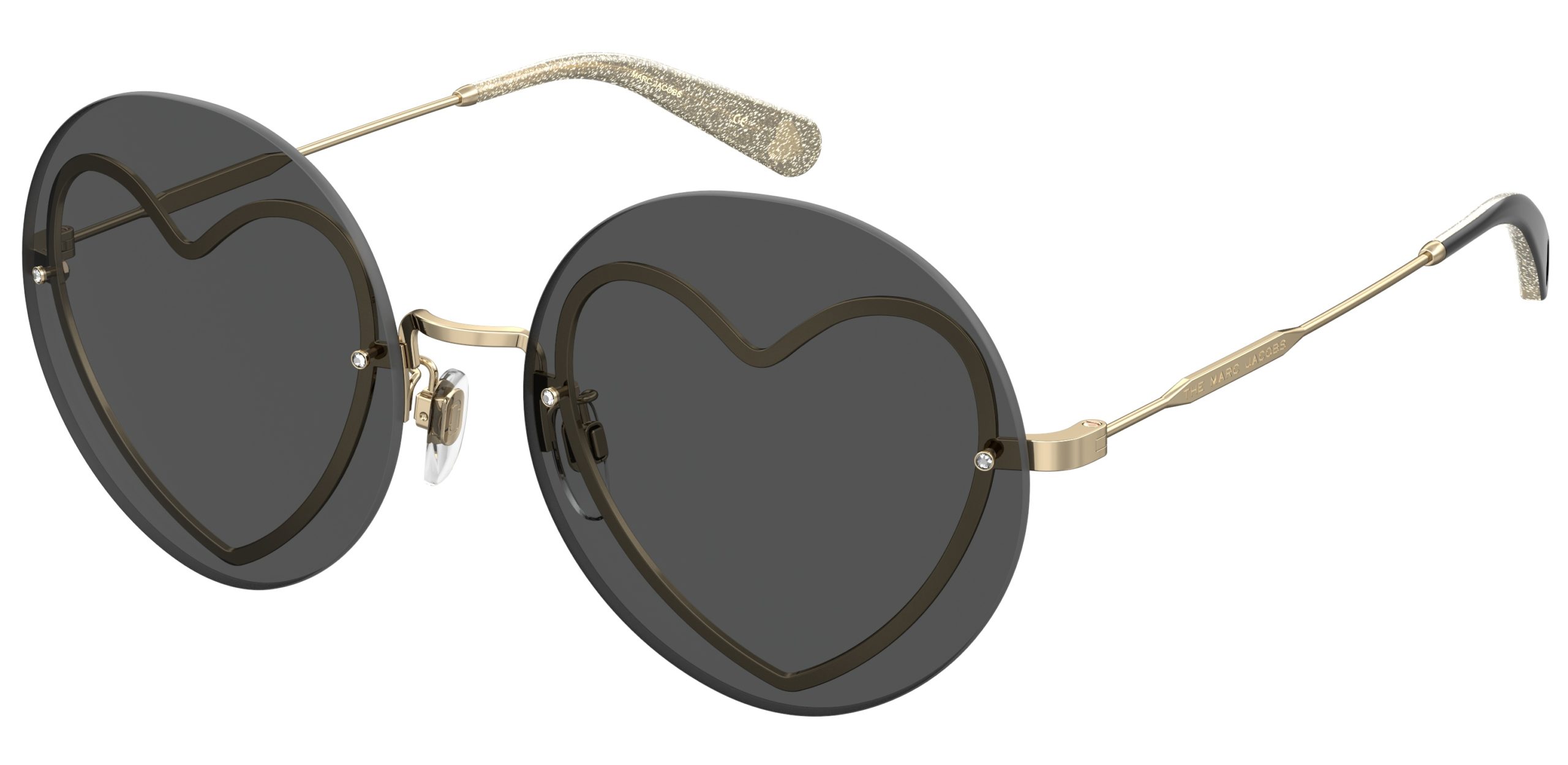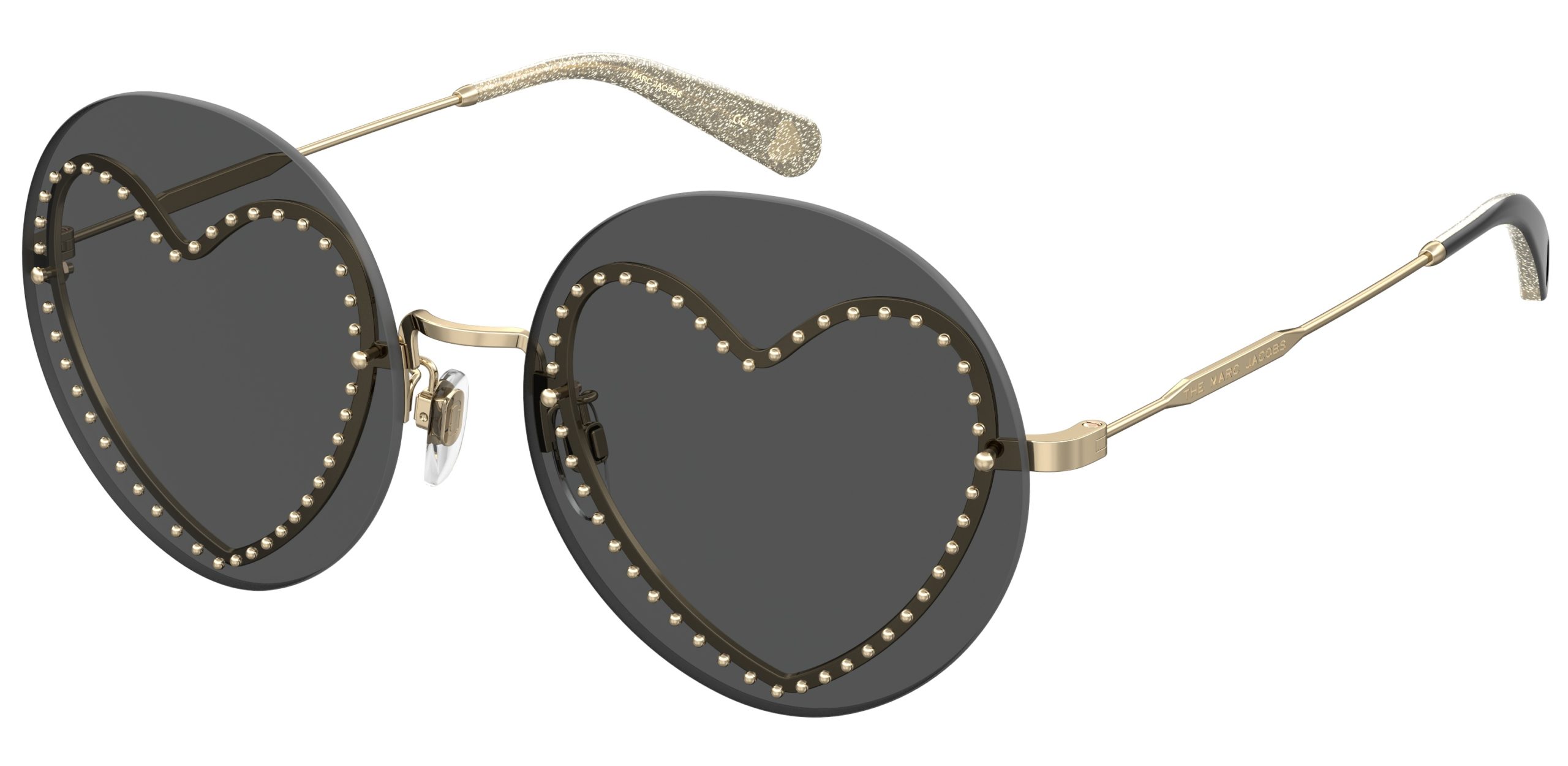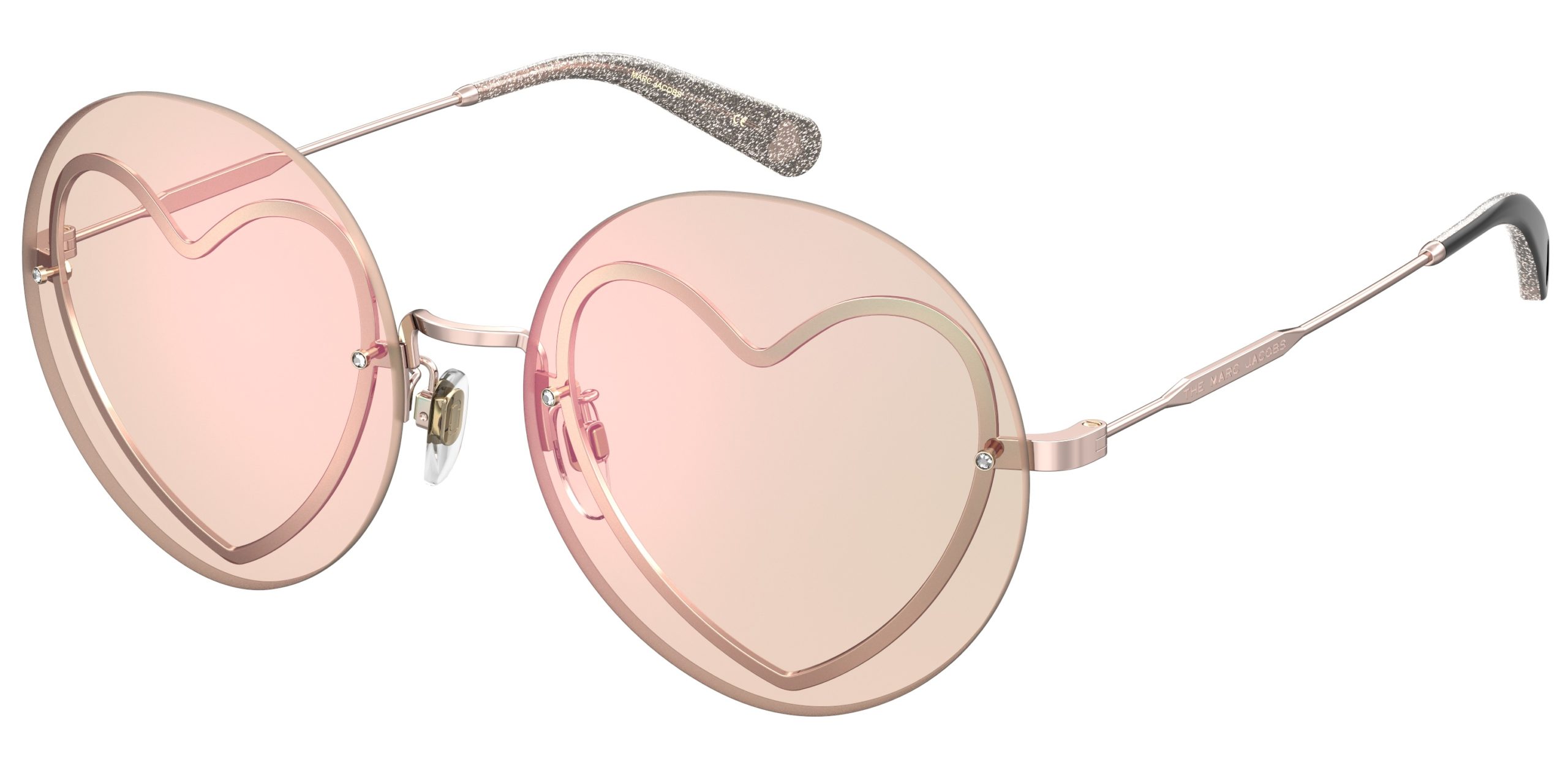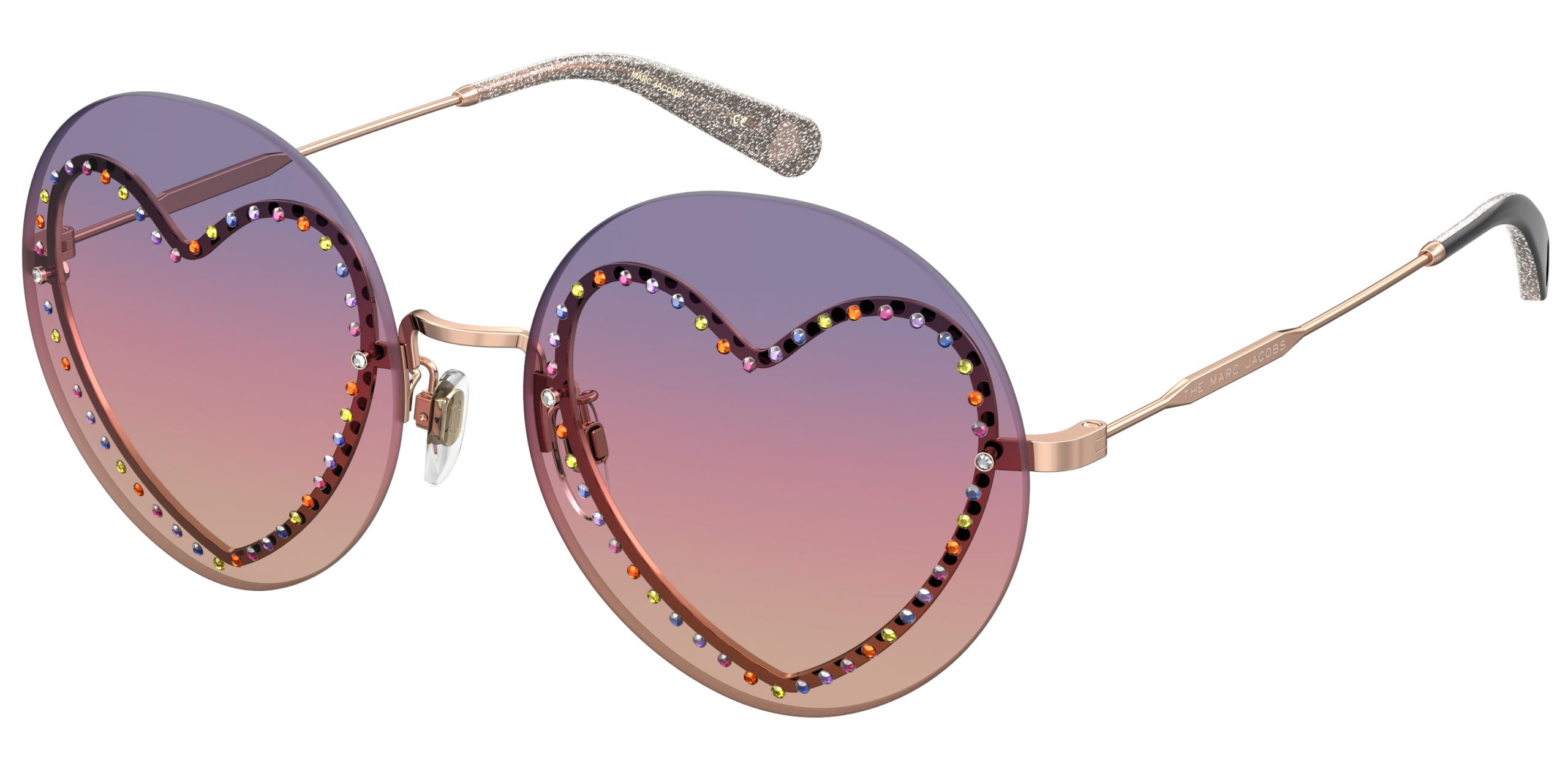 Les lunettes de soleil rondes marc 494/g/s sont disponibles en or avec cristaux multicolores et verres gris/violet, or avec verres gris, or avec verres gris et clous dorés et pêche avec verres roses.