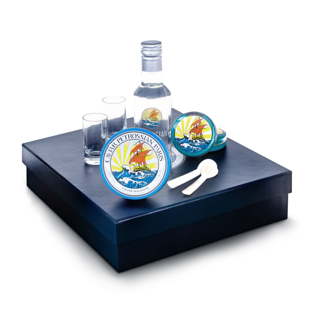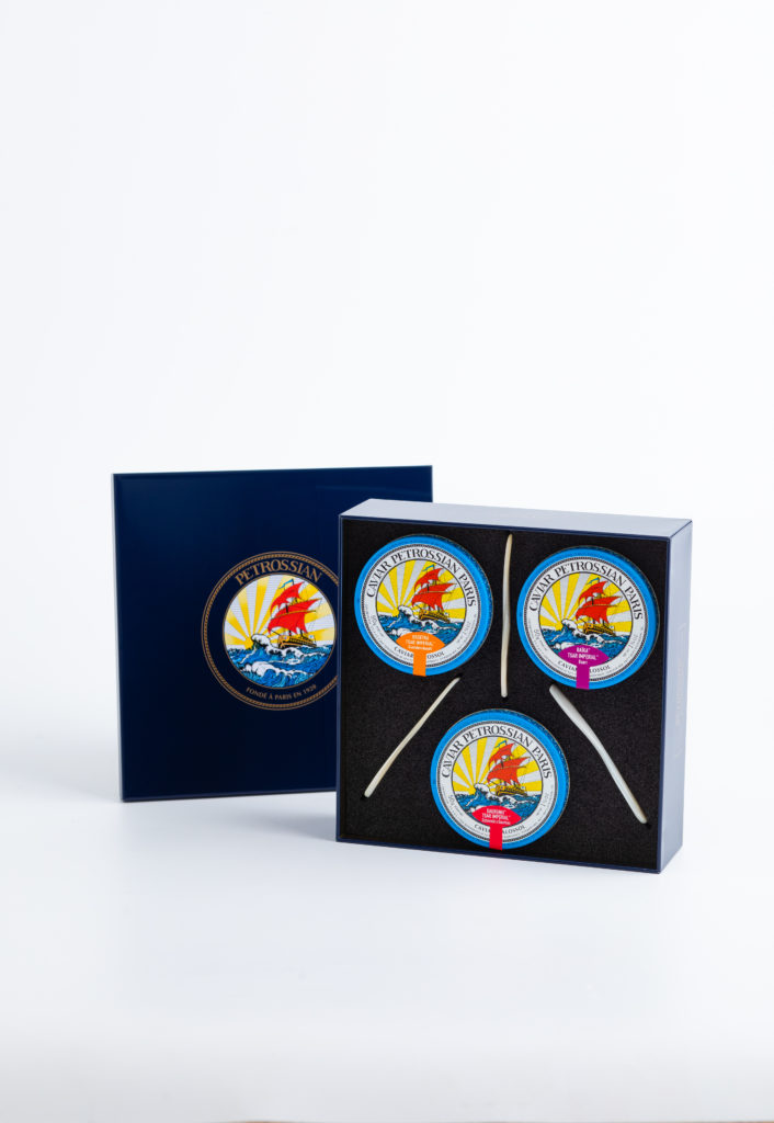 Le coffret La Trilogie des Caviars est l’occasion de découvrir, avec sa moitié, les emblématiques caviars de la Maison. Les trois caviars Ossetra, Baïka® et Daurenki® sont présentés avec leurs trois palettes en nacre dans une élégante boîte métallique lithographiée Petrossian. Un coffret idéal pour une initiation en duo