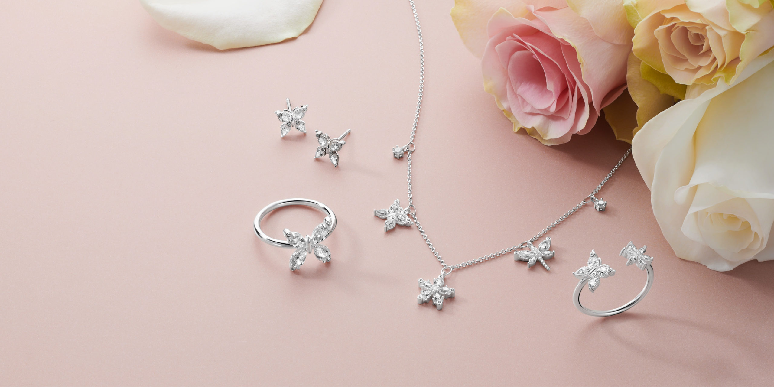 Les multiples créations de la collection Charming sont à l’honneur et se déclinent en ravissants colliers, bagues, manchettes et boucles d’oreilles en argent sterling 925, à motif de papillon stylisé dans des tons délicats. Des gemmes scintillantes ornent les bijoux très mode qui s’empilent et se combinent, dans le sillage de la tendance phare du stacking et du layering, s’adaptant ainsi au style personnel de la personne aimée.