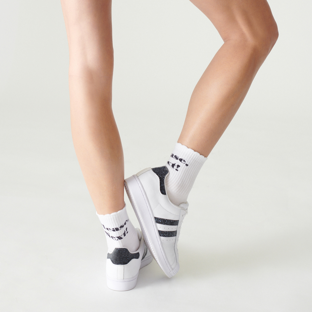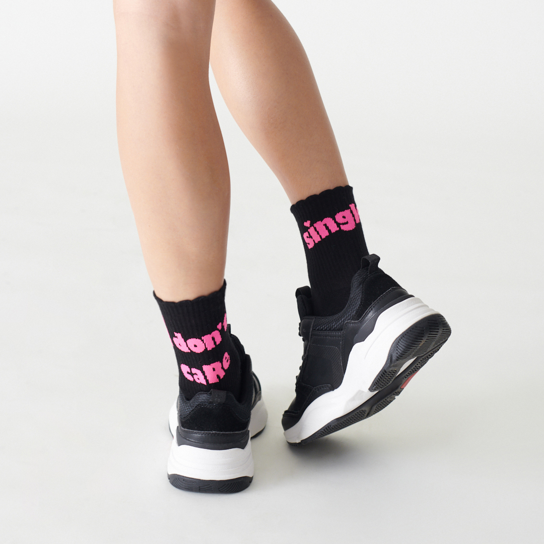 Raffinées et gracieuses, les chaussettes avec imprimés mini cœurs sont complétées d’un ourlet ondulé et romantique. Calzedonia a même pensé à préparer quelque chose pour celles qui n’ont pas encore rencontré l’amour : deux propositions amusantes qui se moquent du fait d’être célibataires. Les lettres «SINGLE, I Don’t Care» et «PLEASE, NEXT!» sont le moyen idéal pour célébrer les femmes fortes et confiantes.