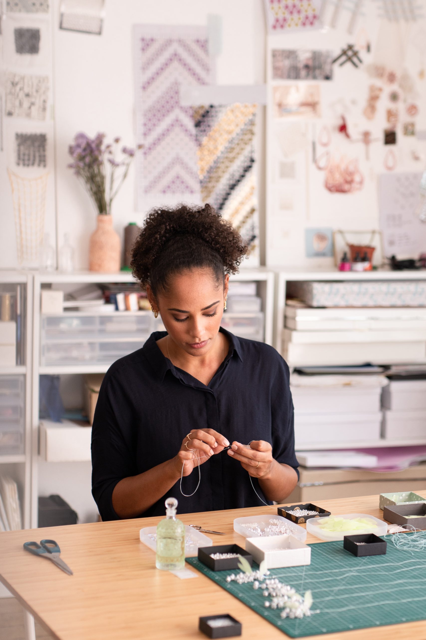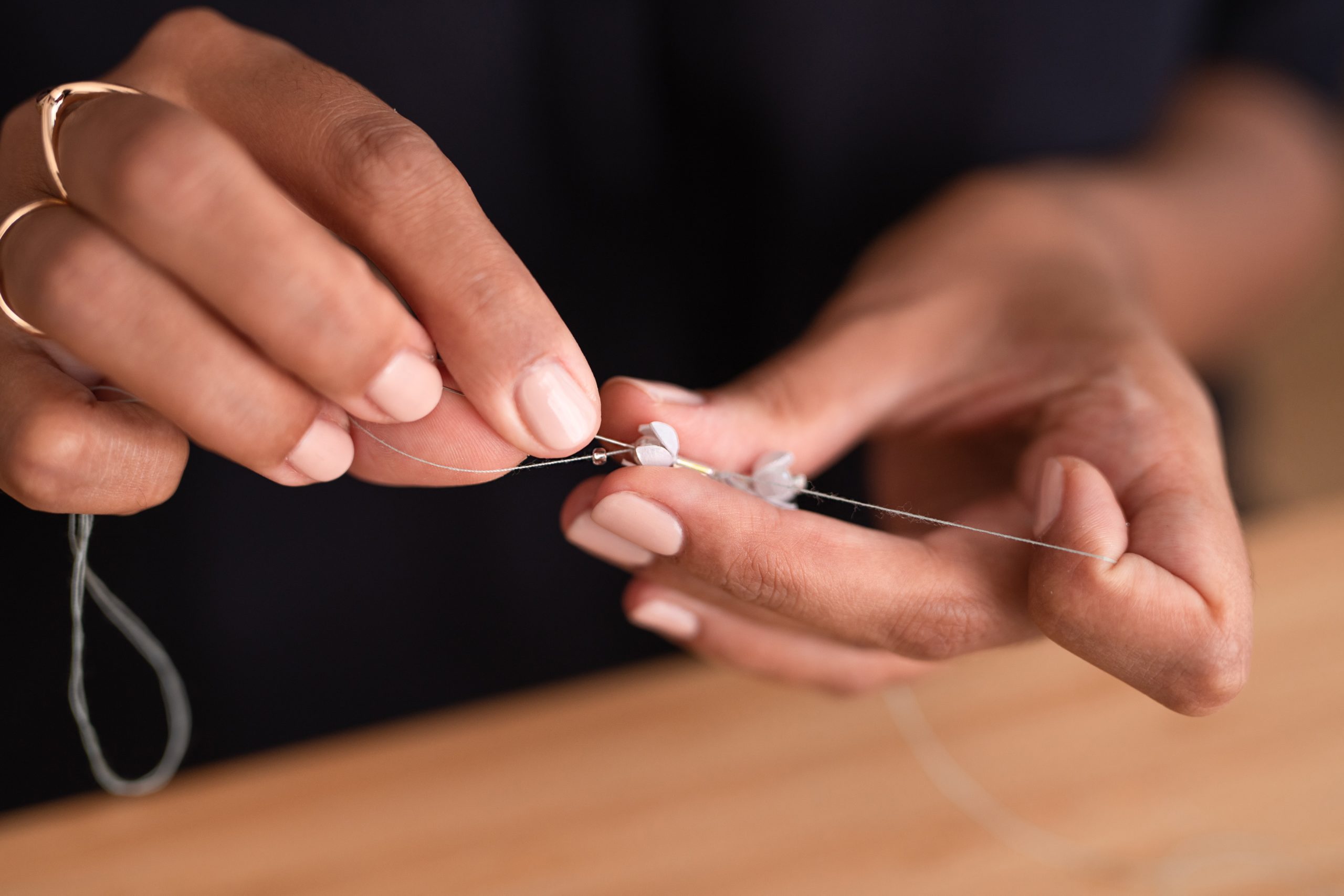 Afin de créer ces délicats brins de muguet, ce sont plusieurs savoir-faire issus des métiers du luxe qui sont appliqués par Lucie Touré. Premier temps de la création: les fleurs de muguet sont dessinées à l’aide d’un logiciel. Ces petites corolles passent ensuite du virtuel à la réalité, découpées dans un précieux papier blanc, ou doré à la feuille d’aluminium. C’est au cours de l’étape suivante que la magie opère. Haute précision et extrême délicatesse s’allient lorsque l’artiste met en forme chacune des minuscules clochettes. Tel un bijou, une perle nacrée brille doucement au cœur de chaque fleur.