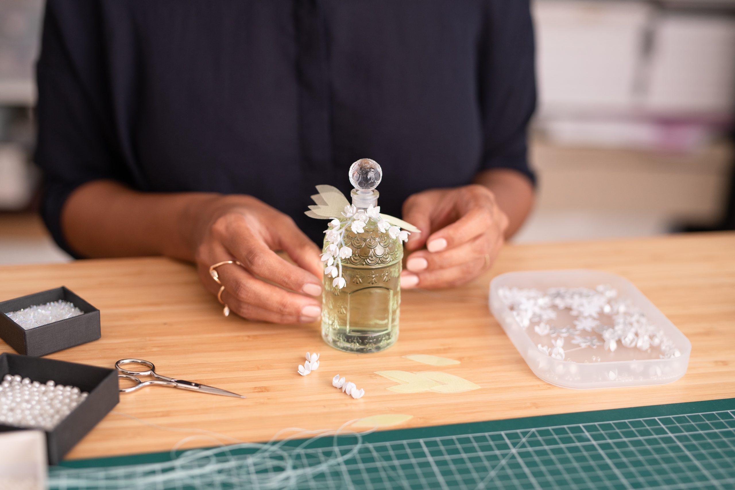 Diplômée en broderie et en design textile, Lucie Touré se forme durant six années au sein d’ateliers de broderie et d’impression textile parisiens, collaborant avec les plus prestigieuses maisons de prêt-à-porter et de Haute-Couture. Elle crée son atelier en 2018 et l’installe durant deux années de résidence au sein des Ateliers de Paris. En associant le papier aux techniques d’ennoblissement du textile et de la bijouterie, elle sublime ce matériau éphémère par la découpe, le tissage ou la broderie. Pour cette édition, elle imagine une parure moderne sur-mesure en 3D, représentation stylisée de brins de muguets aux clochettes épanouies, qui retombent délicatement sur le dôme du Flacon aux Abeilles, entièrement réalisée à la main à Paris.