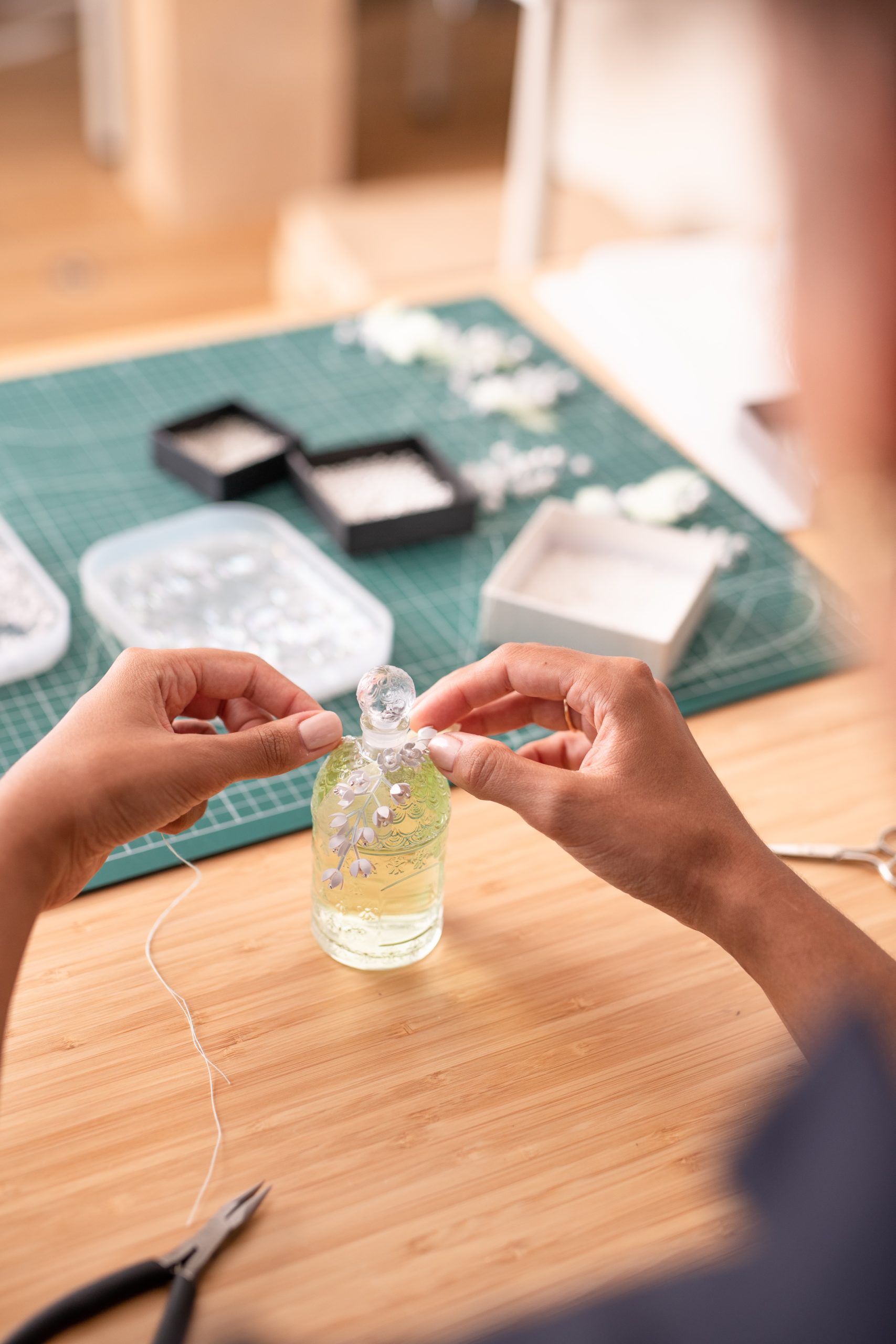 Dernière étape de cette parure printanière, l’artiste monte les fleurs et les feuilles d’un seul tenant, au fil et à l’aiguille, d’un geste virtuose emprunté à la broderie main. Les fleurs précieuses ornent ainsi le col et les courbes gracieuses du Flacon aux Abeilles.