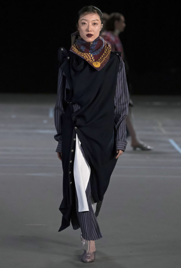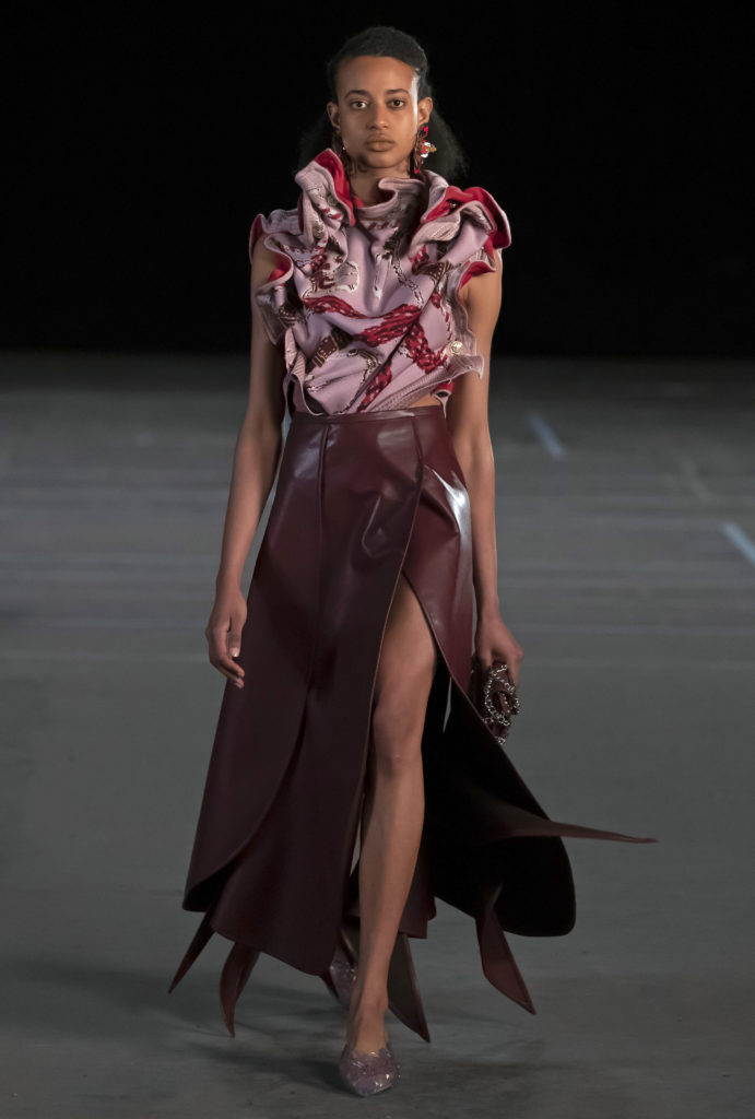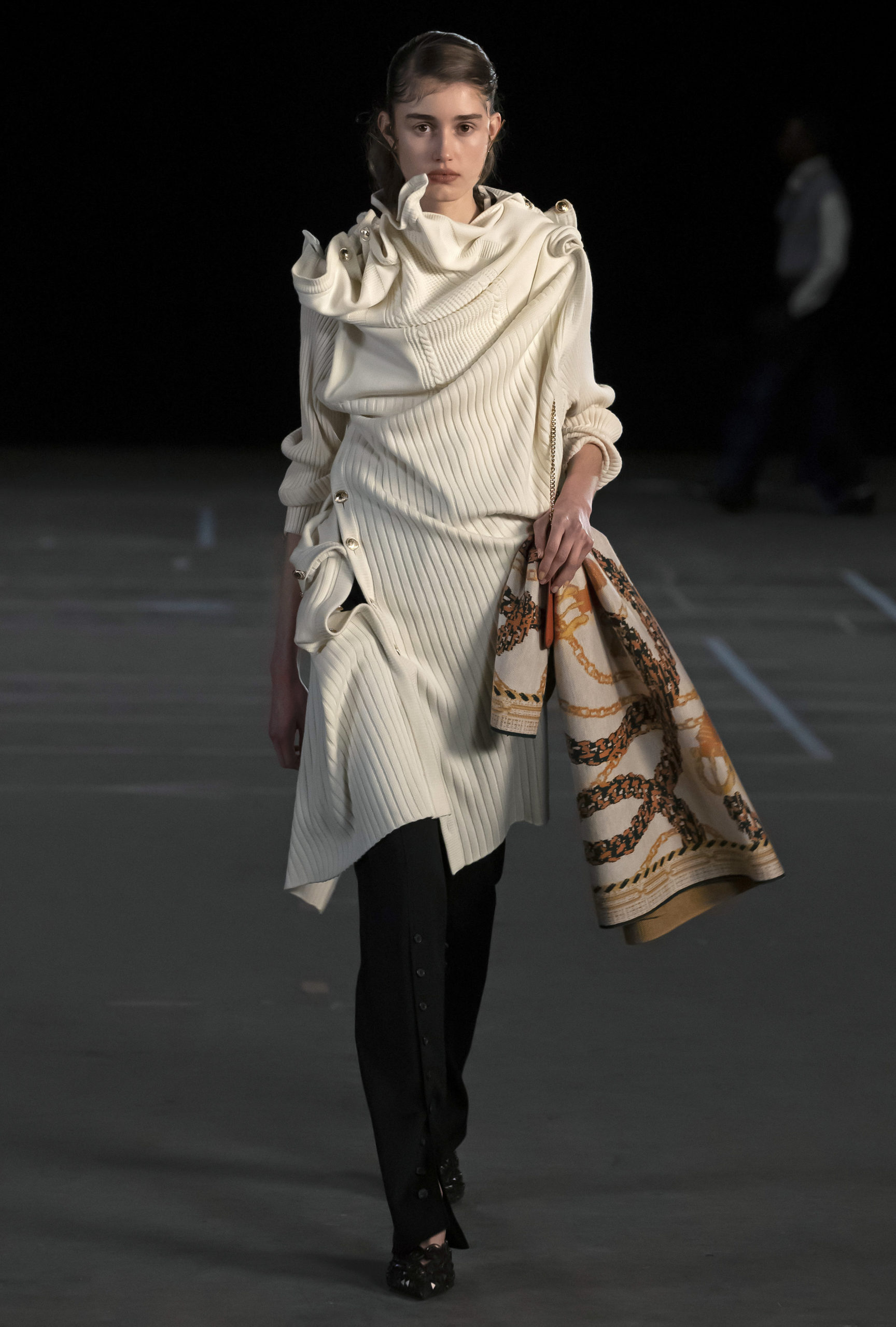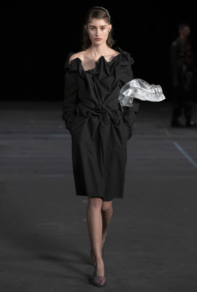 Les silhouettes se déforment et s’enroulent, créant des courbes sinueuses qui semblent figées dans le temps. Un fil métallique intégré directement dans le tissu, un concept innovant d’abord exploré lors de la collection AH17, transforme les pantalons, les jupes, les robes ou les vestes en un jeu permettant la versatilité. Des mailles au motif hippique très bourgeois se rebellent lorsque les fils métalliques qu’elles contiennent se distordent et se métamorphosent en formes abstraites. Ce nouvel exemple de l’esthétique disruptive de Y/PROJECT, signature de Glenn Martens, se prolonge en une nouvelle ligne de sacs
