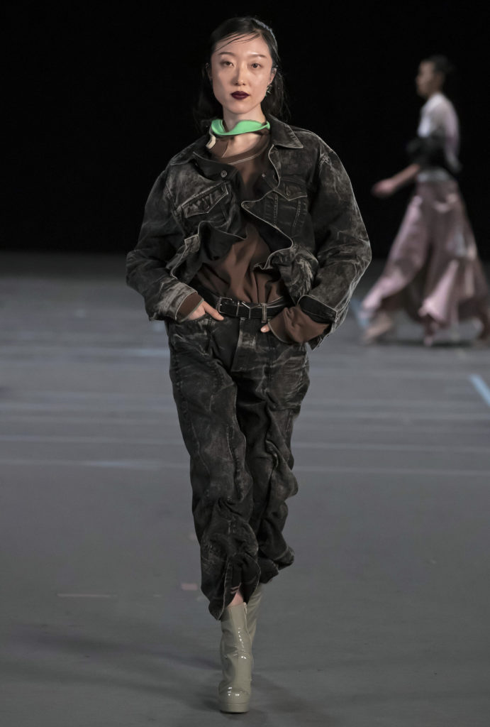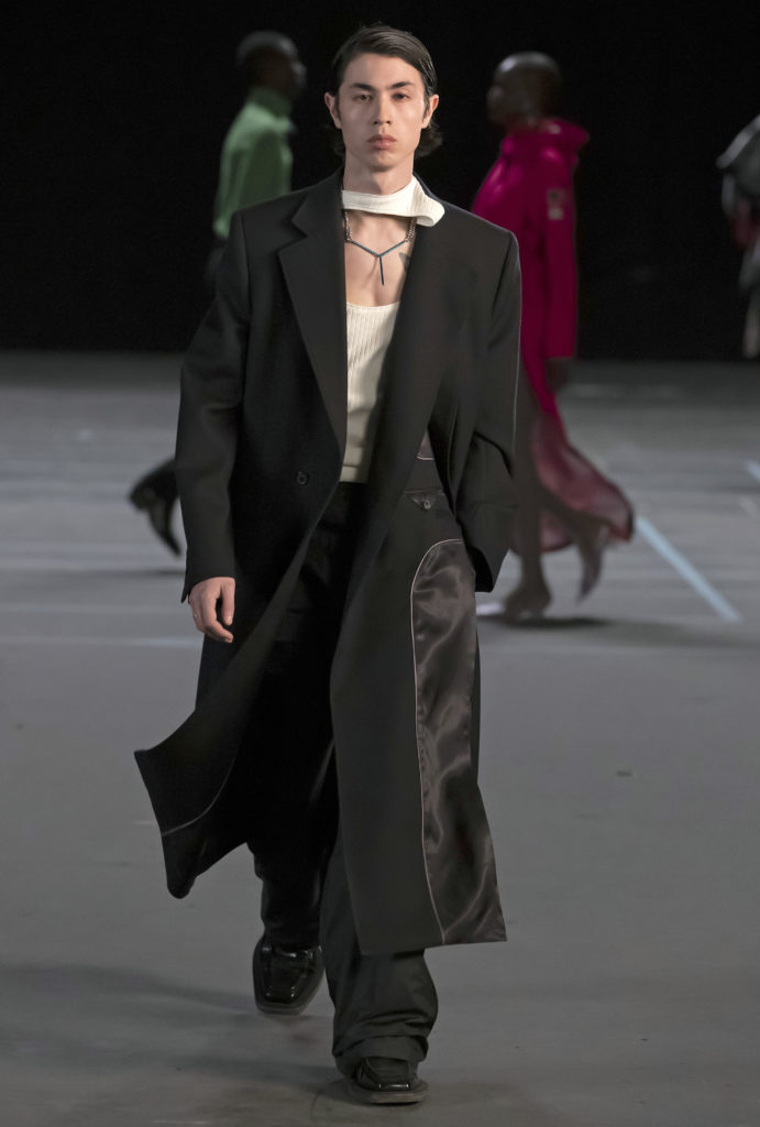 Les styles signatures de Y/PROJECT – les pantalons en tulle superposé, les manteaux, les pulls et les pantalons à panneaux – ponctuent toujours la collection, et sont rejoints par de nouvelles pièces qui ne passent pas inaperçues, telles que des jambières trompe-l’oeil en denim d’inspiration western. Les boucles d’oreilles en forme de rose de la collection PE21