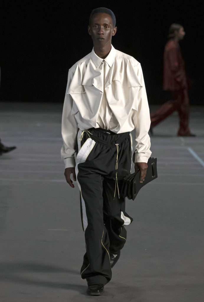 Certaines pièces se dédoublent, nouvel exemple d’un design qui perturbe la perception : des chemises et des robe-chemises sont doublées d’une strate supplémentaire de tissu, qui peut être boutonnée ou déboutonnée à l’envie pour un look déconstruit ou plus formel, permettant une expression individuelle sans limite.