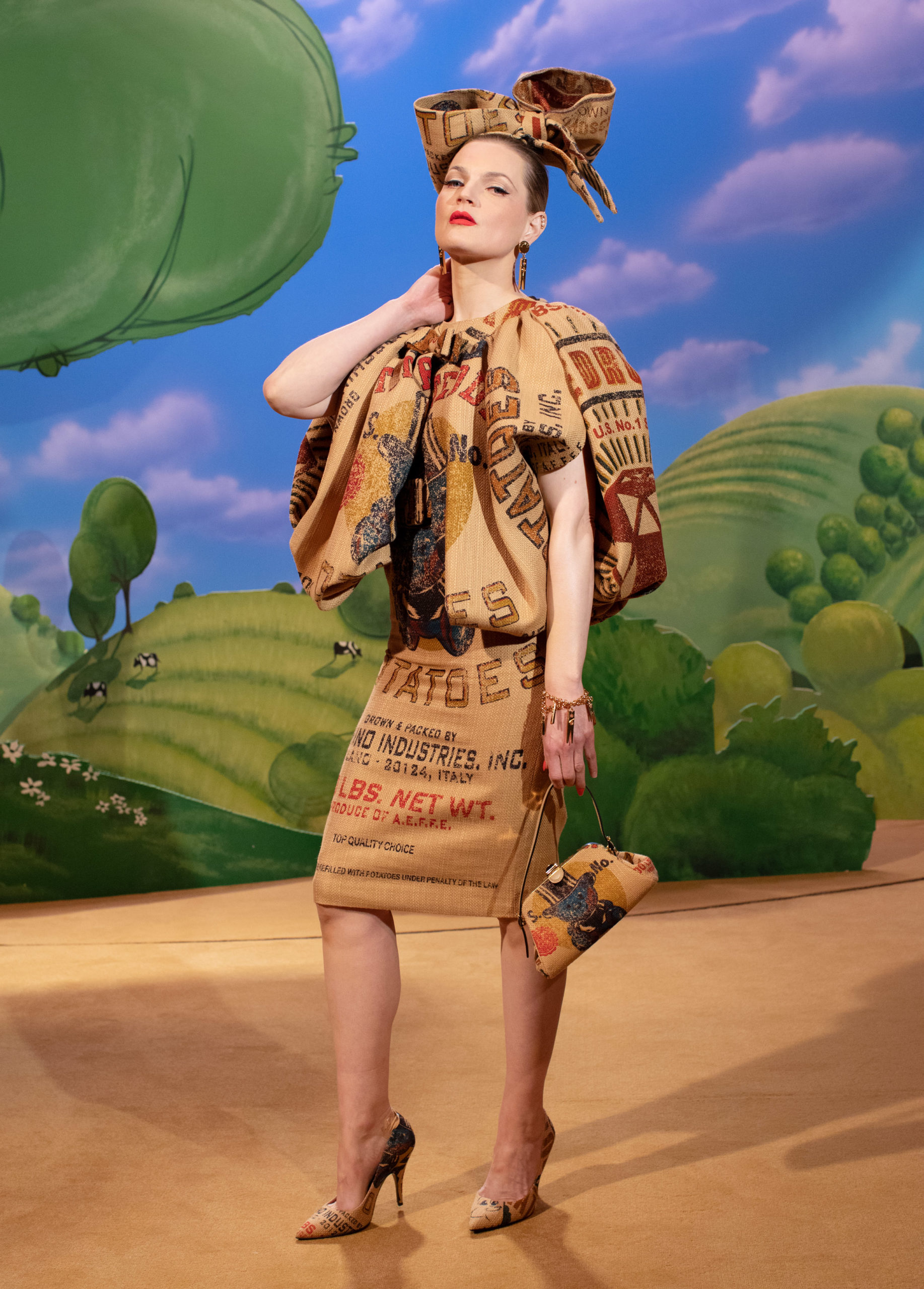 Presented through a short film named for that same varnish hue, Fall hosts a panoply of items and ideas, ranging from reworked pinstripe suiting to an iconic-ironic prairie dress all-over printed with physical cows on the prairie. Scott also takes such mundanities as potato sacks and cuts them into bell-sleeves, poufs and bows, imbuing irreverence and confidence into something otherwise deemed largely ignorable.