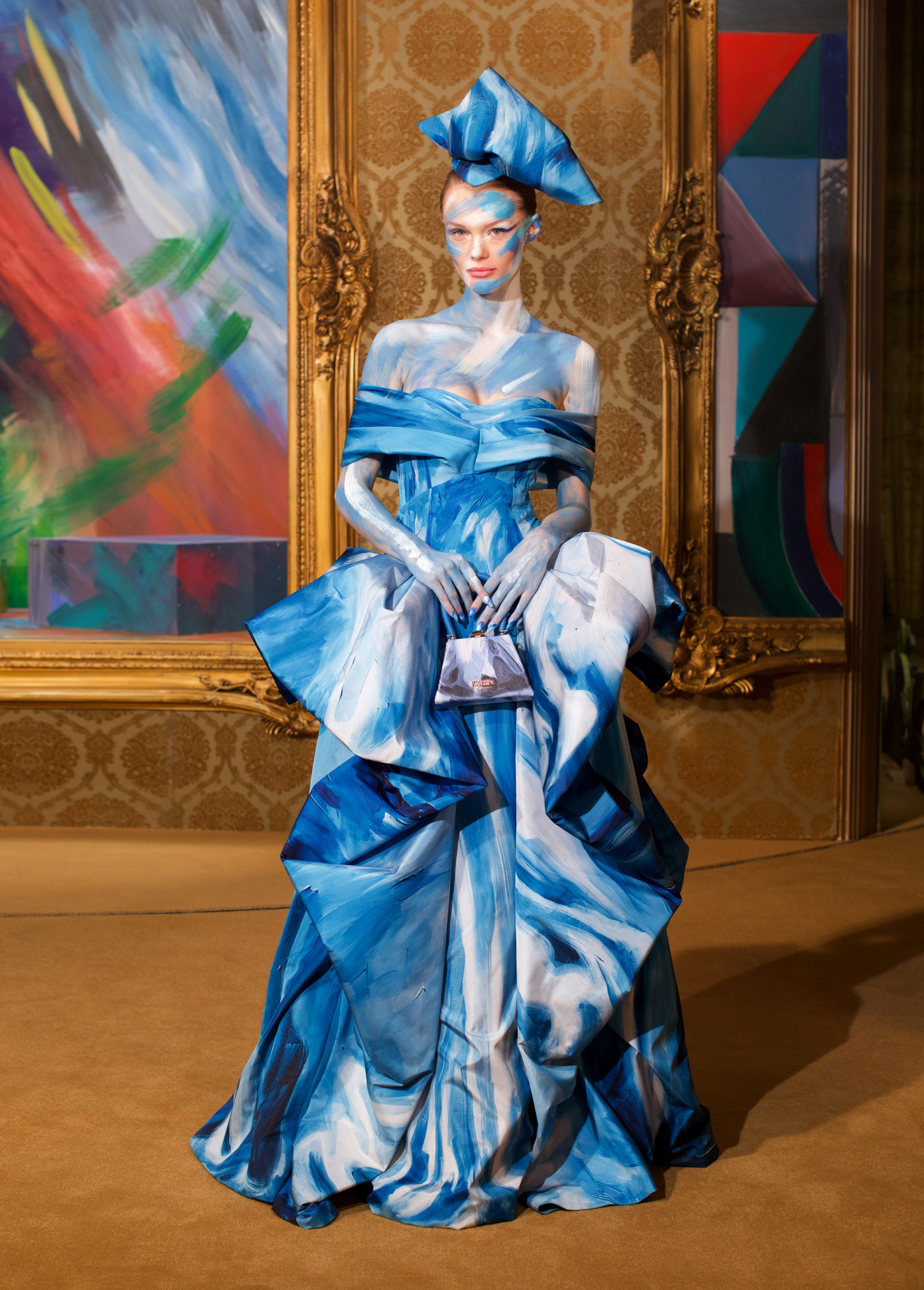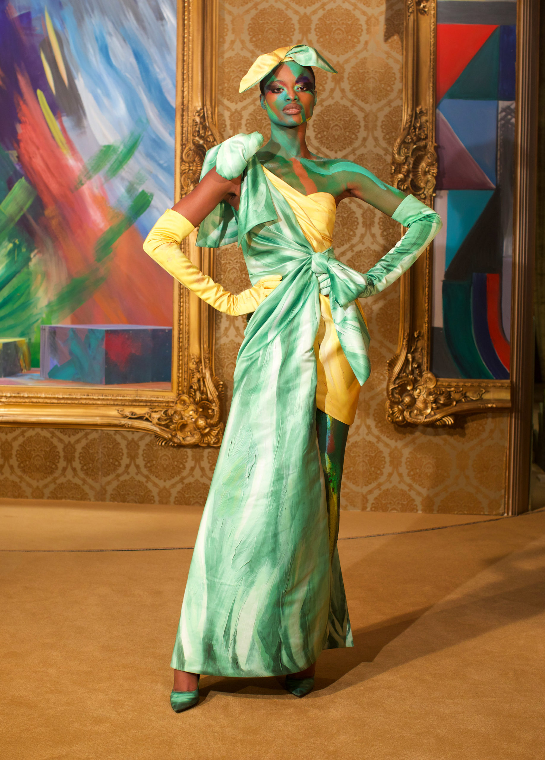 As we progress, the collection begins to boast ball gowns in voluminous silhouettes, appearing to be hand painted in post-Impressionist brushstrokes. At the conclusion, Scott enters the realm of 1940’s evening, with pale pink, fuchsia, black and gold-charmed dresses that seem as if they’re reincarnated off of a midcentury red carpet at Los Angeles’s Biltmore Hotel.
