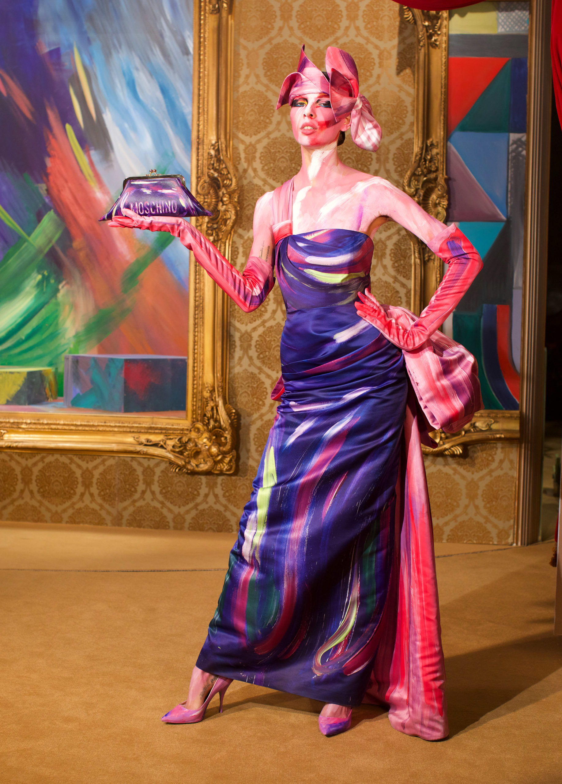 From there, the trip continues: an outdoor series features full skirts, puff sleeves and a belted trench, along with an on-the-go kit holding everything you’d find on a lady’s vanity table. Brushes for blush, hair combs, tweezers and even a compact shaped in Moschino’s signature teddy bear, all included!