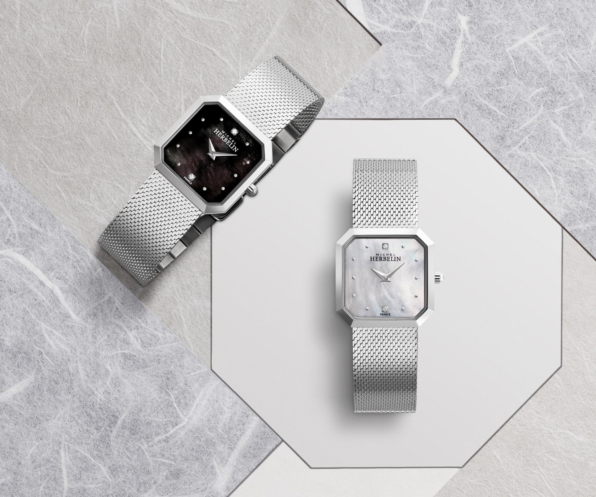 Lié au boîtier comme un complice inséparable, le bracelet tissé d’une maille fine et serrée en acier se drape, tout en souplesse, autour du poignet. Héritant d’un savoir-faire horloger français depuis 1947, Octogône est conçue comme un joyau contemporain. Rythmée par un mouvement de facture suisse, gage de qualité et de précision, cette montre aux lignes architecturales pétille par son charme graphique.