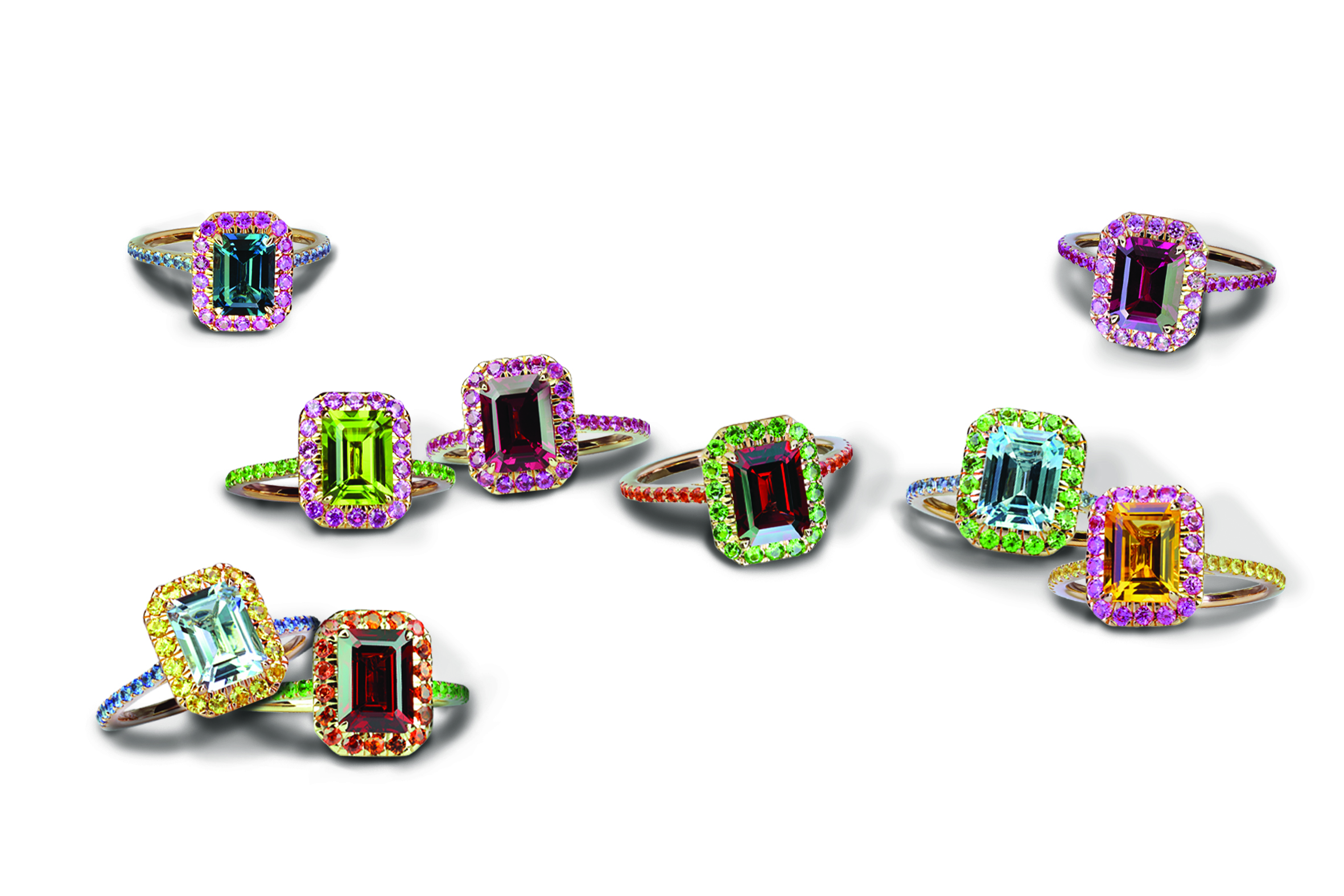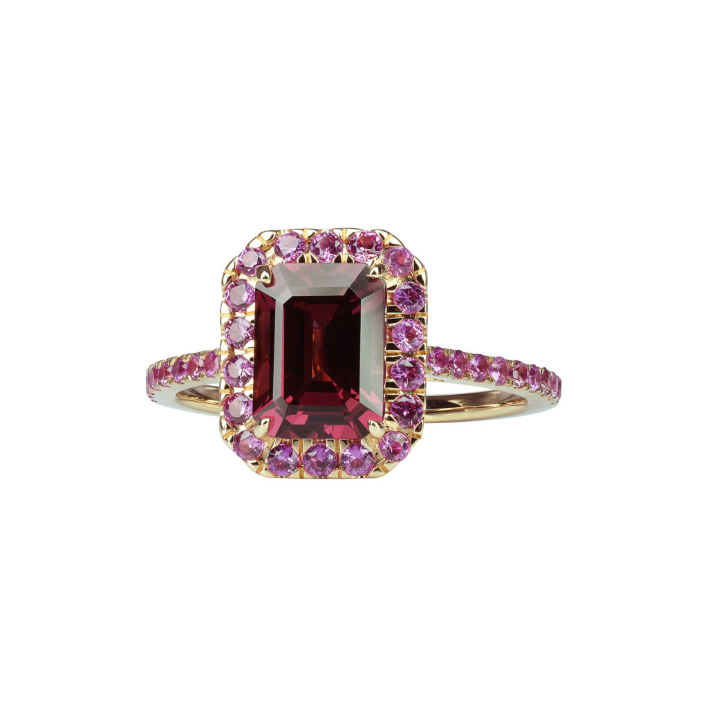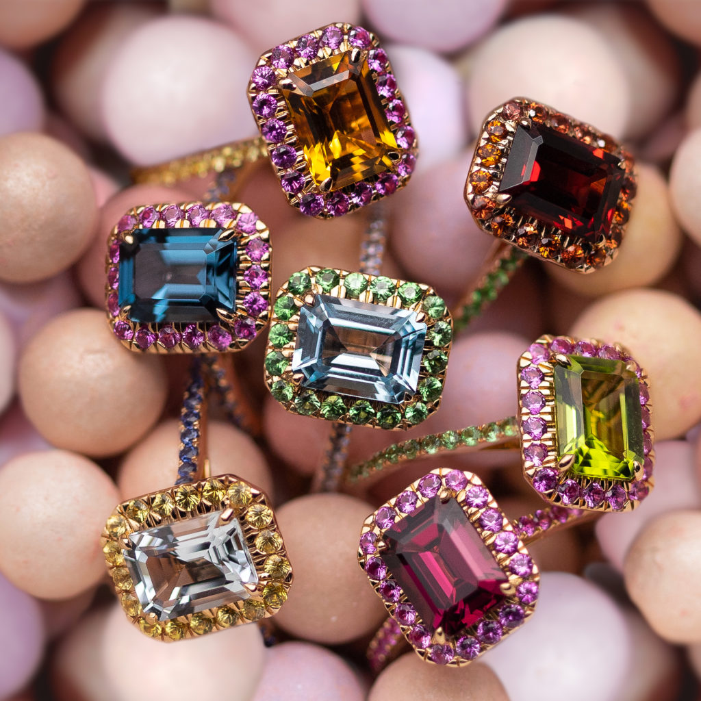 Isabelle Langlois, revisite les codes ultra-classiques de la bague « Pompadour », appelée également « Marguerite ». Prenant le contrepied du traditionnel saphir rond ou ovale cerclé d’une couronne de diamants, ces nouveautés présentent une pierre de forme rectangulaire, proposée dans un large éventail de couleurs. Se portant seule ou à plusieurs, elles pétillent de gaieté.