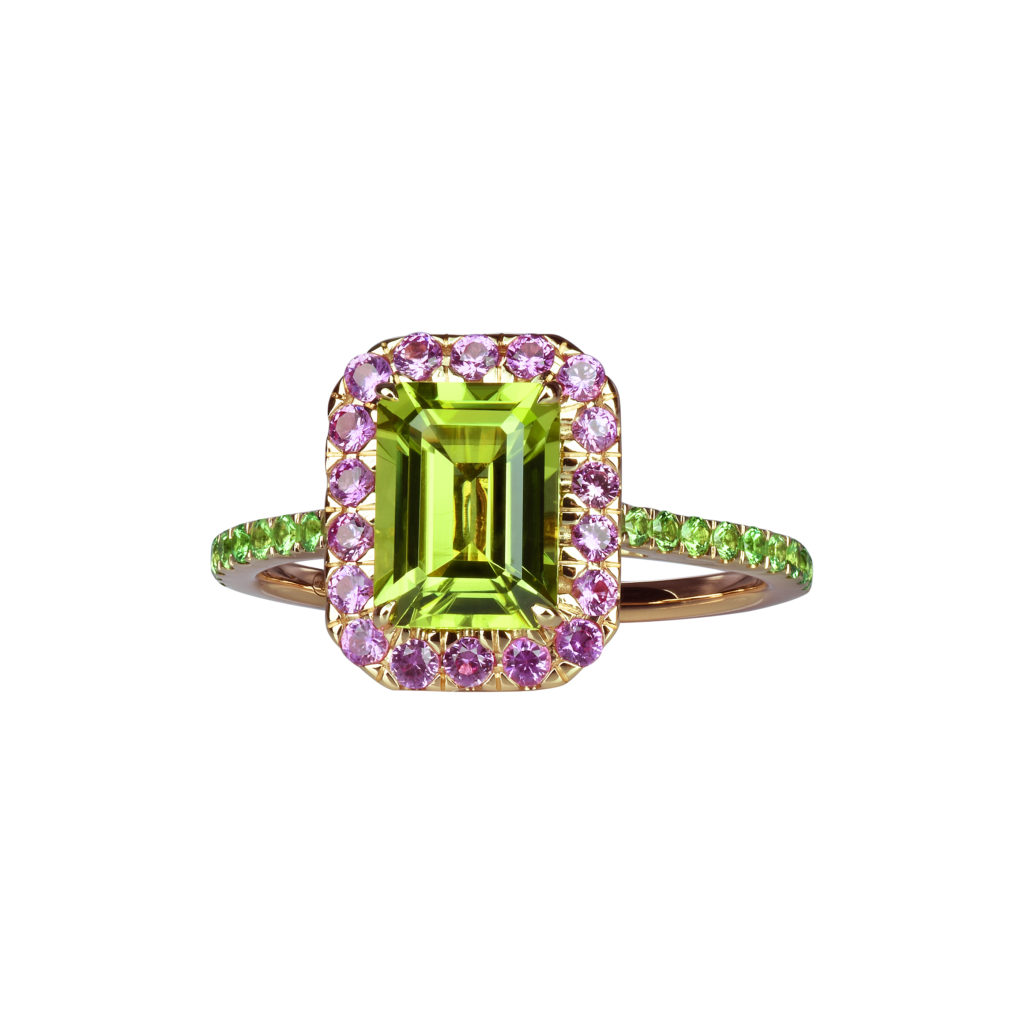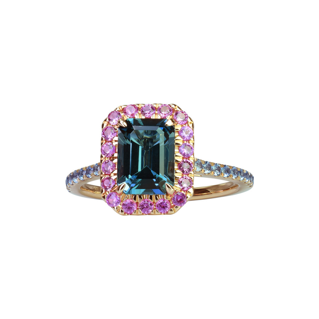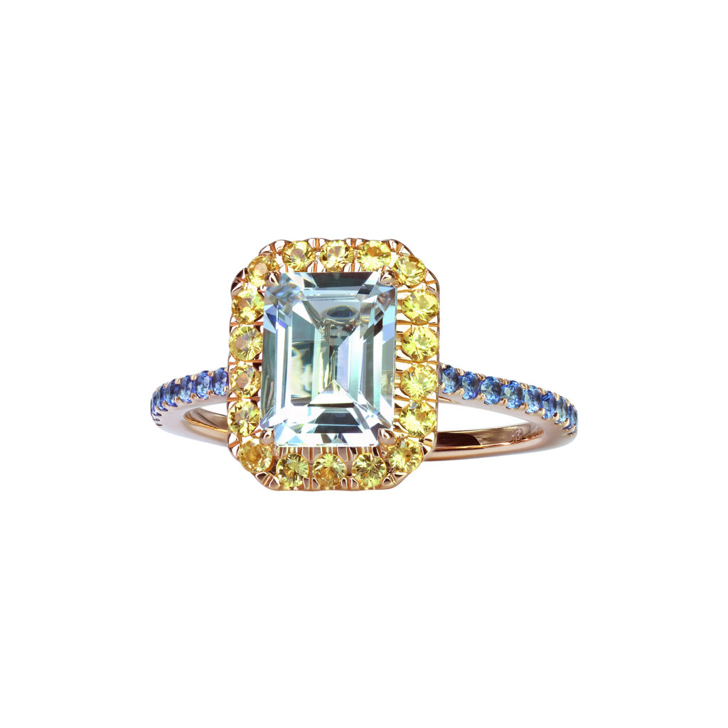 Une belle pierre de centre, éblouissante par ses reflets étincelants, est mise en majesté par un ruban de saphirs de couleur ou de tsavorites. Son allure géométrique, minutieusement taillée pans coupés à degré, confère à l’ensemble une touche de modernité. Déclinée en aigue-marine, citrine, grenat, péridot, rhodolite, topaze bleue ou topaze Blue London, elle repose sur un anneau d’or rose finement serti de saphirs de couleur ou de tsavorites.
