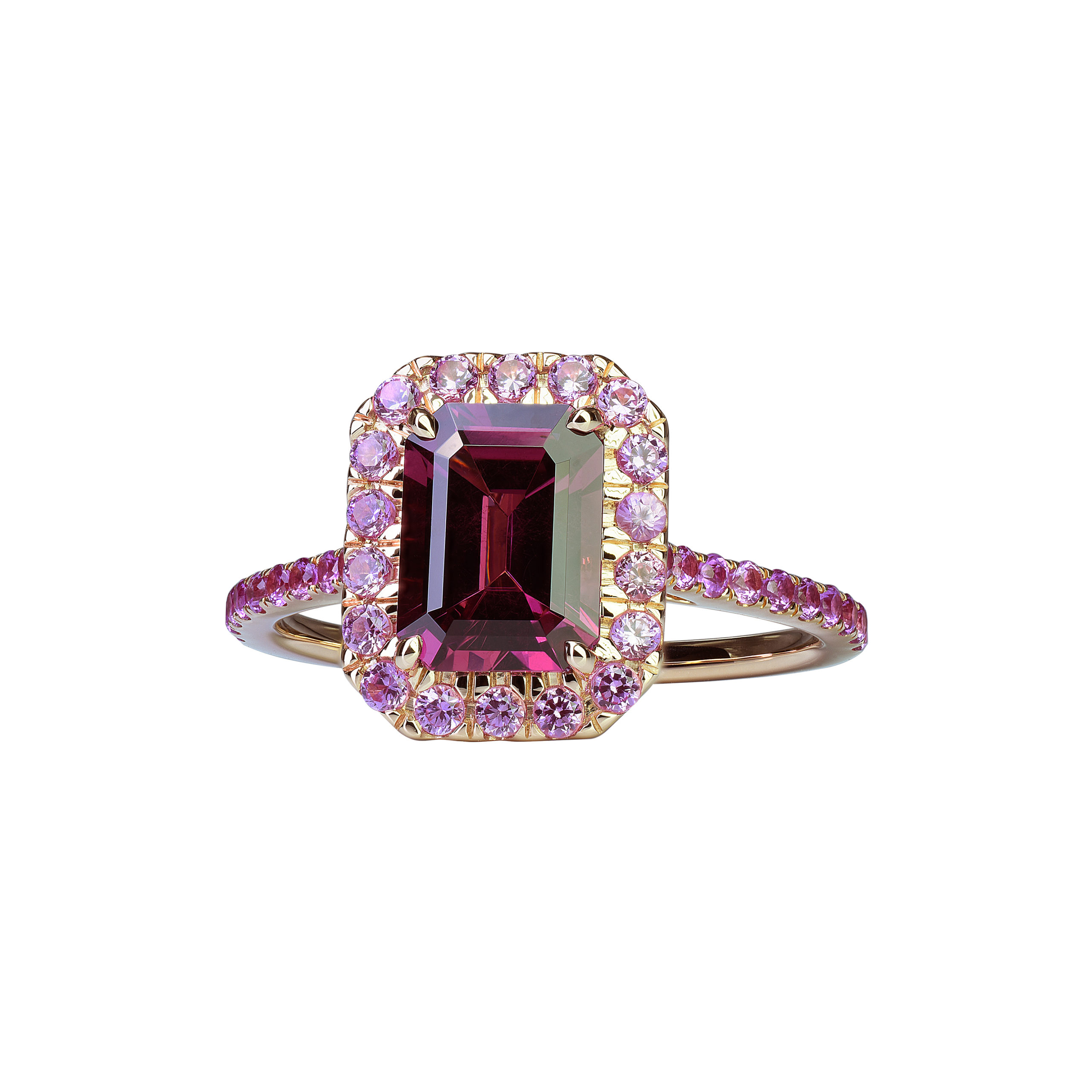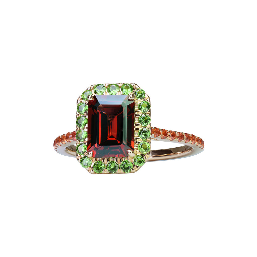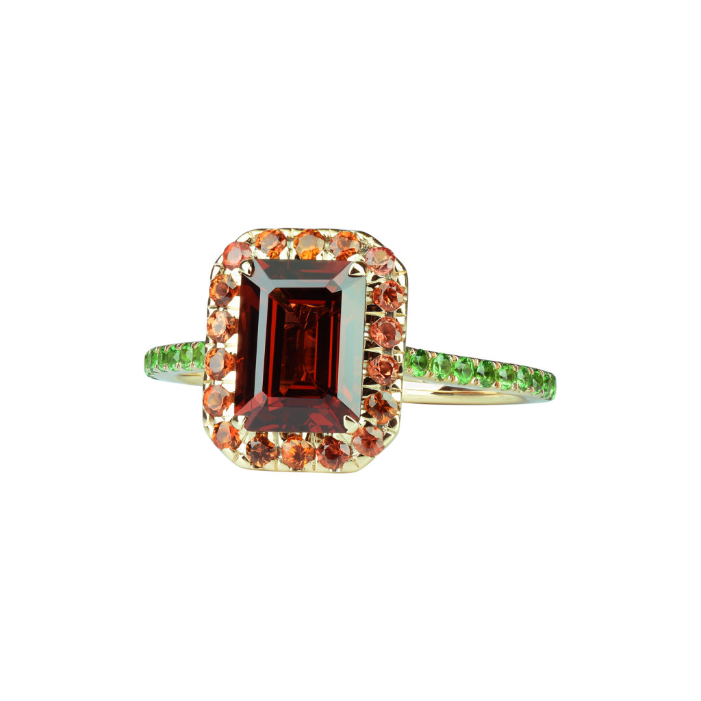 Une belle pierre de centre, éblouissante par ses reflets étincelants, est mise en majesté par un ruban de saphirs de couleur ou de tsavorites. Son allure géométrique, minutieusement taillée pans coupés à degré, confère à l’ensemble une touche de modernité. Déclinée en aigue-marine, citrine, grenat, péridot, rhodolite, topaze bleue ou topaze Blue London, elle repose sur un anneau d’or rose finement serti de saphirs de couleur ou de tsavorites.