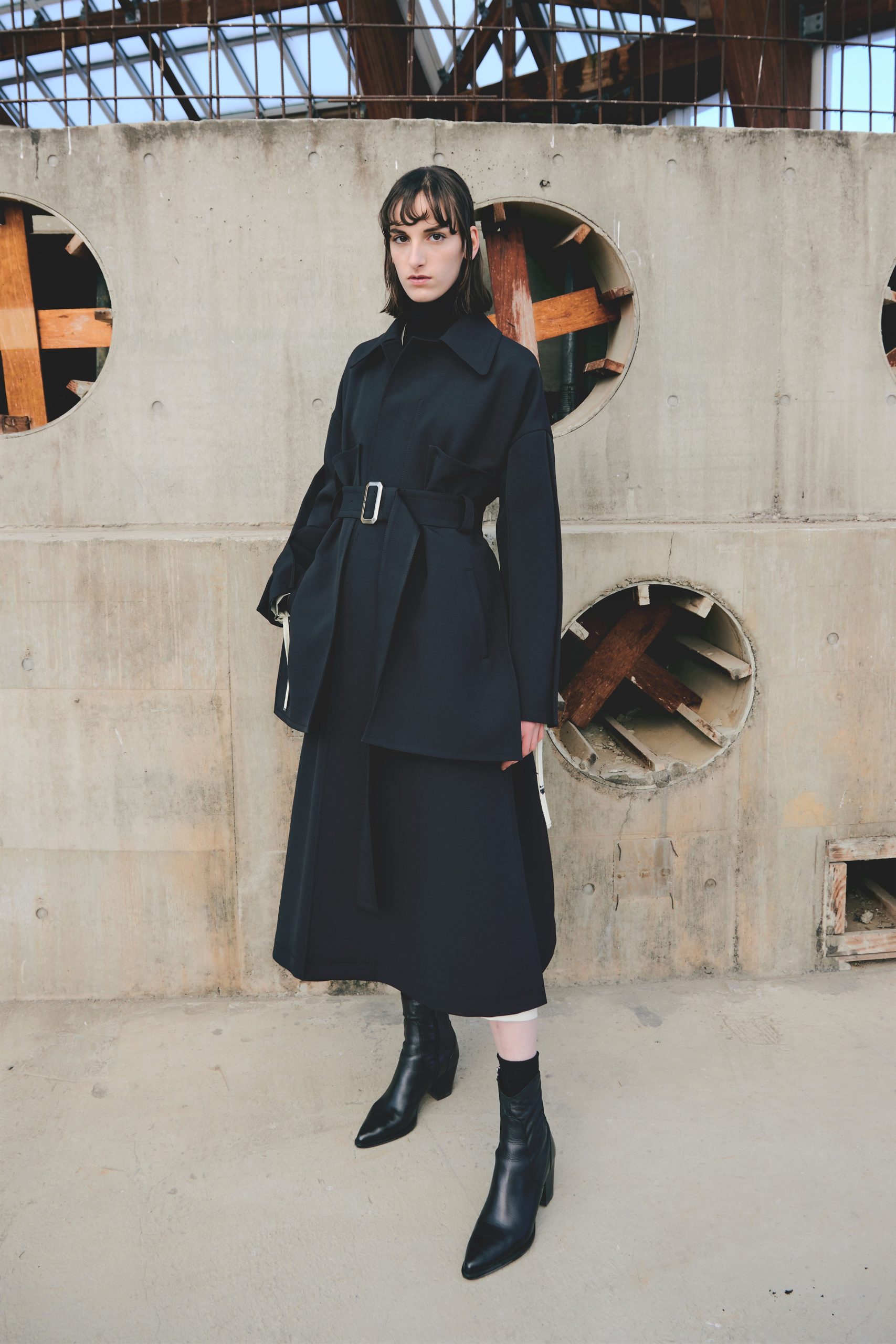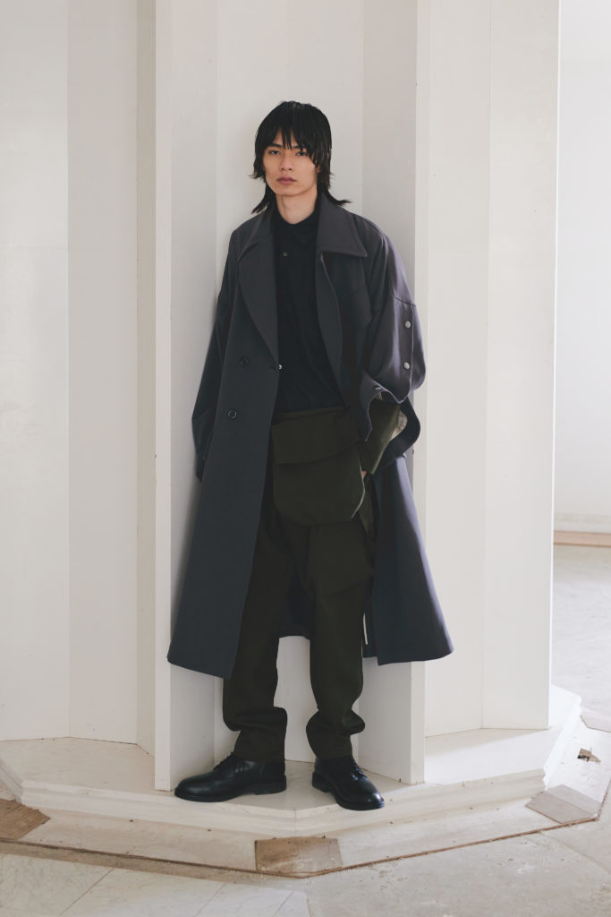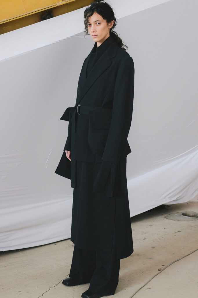 Parmi les matériaux distinctifs, nous retrouvons une maille de haute qualité en polyester recyclé, une gabardine de triacétate/coton biologique une gabardine de laine papier ainsi qu’un sergé cabaret.