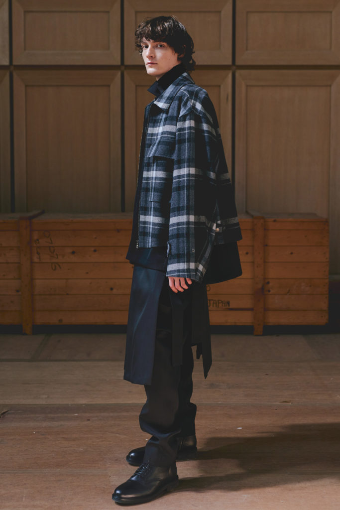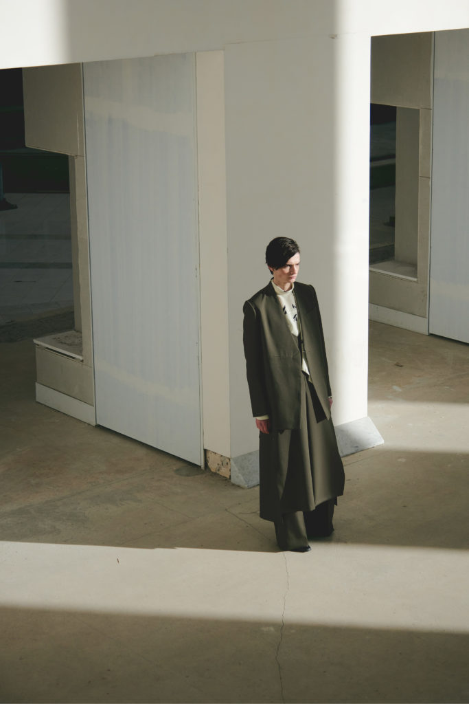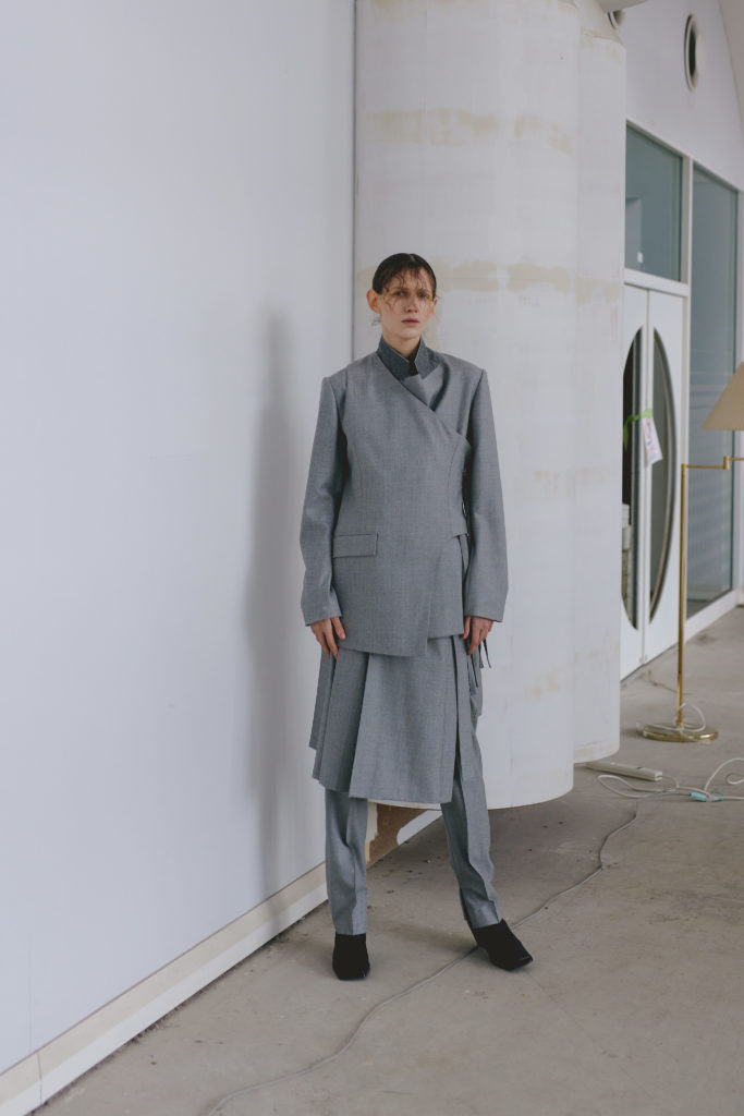 Au-dessus de l’emblématique veste à fines rayures UJOH, un gilet asymétrique imaginé dans le même tissu.