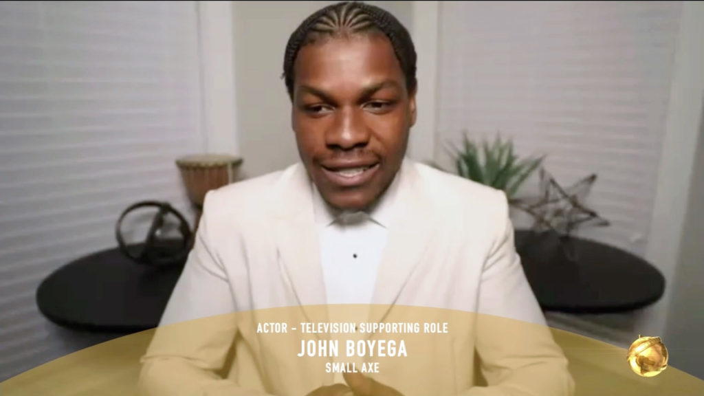 UNSPECIFIED: 78th Annual GOLDEN GLOBE AWARDS — Pictured in this screengrab released on February 28, John Boyega accepts the Best Supporting Actor – Television award for ‘Small Axe’ during the 78th Annual Golden Globe Awards broadcast on February 28, 2021. — (Photo by NBC/NBCU Photo Bank via Getty Images)