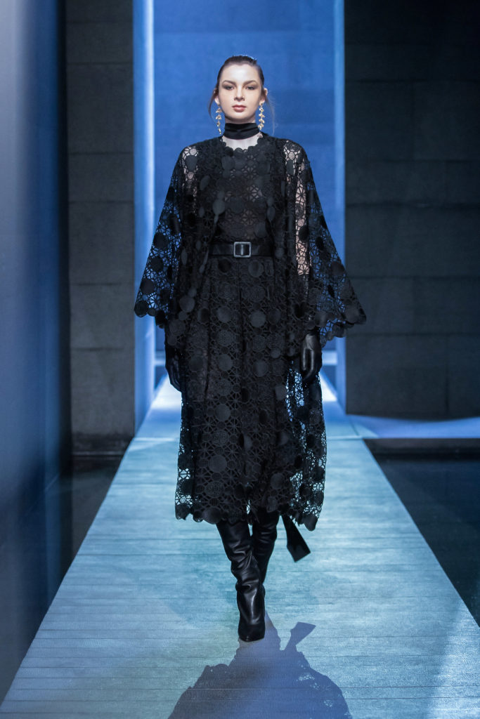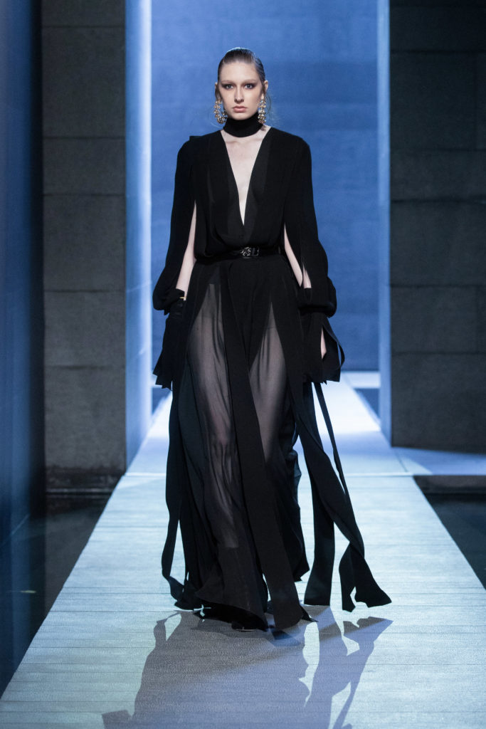 Séduisante et sans remords, elle se pare de pièces féminines d’un noir profond, sa couleur de prédilection. Elle s’amuse de la transparence, jouant de son charme dans de longues couches à volants en tulle et dentelle, dans des costumes en macramé ou des superpositions à pois transparentes et aériennes. Parfois, elle se veut plus discrète notamment dans un manteau démesuré à franges, une robe avec une cape plissée et une ceinture monogrammée ou encore, dans un tailleur pantalon large accompagné d’une veste brodée de paillettes dans le dos.