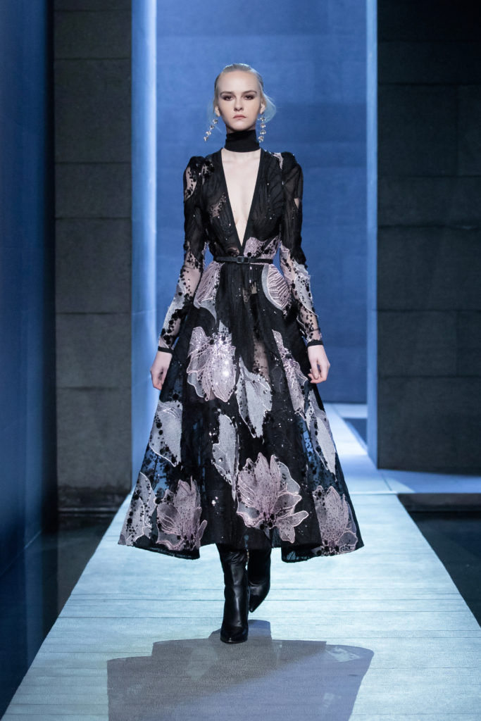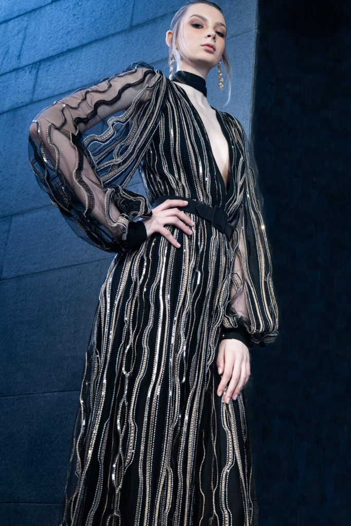 Son récit est ponctué entre broderies de couleur argent métallique et or qui s’entremêlent aux imprimés floraux et aux inspirations art déco. Certains motifs peuvent prendre le dessus, soit en recouvrant sa silhouette dans un mouvement géométrique, soit en mettant en valeur ses courbes. Des plumes roses embellissent les revers des lignes tandis qu’une explosion de soie vert acidulé et de paillettes vert profond renforcent, au fur et à mesure des passages, sa fraicheur et sa féminité.