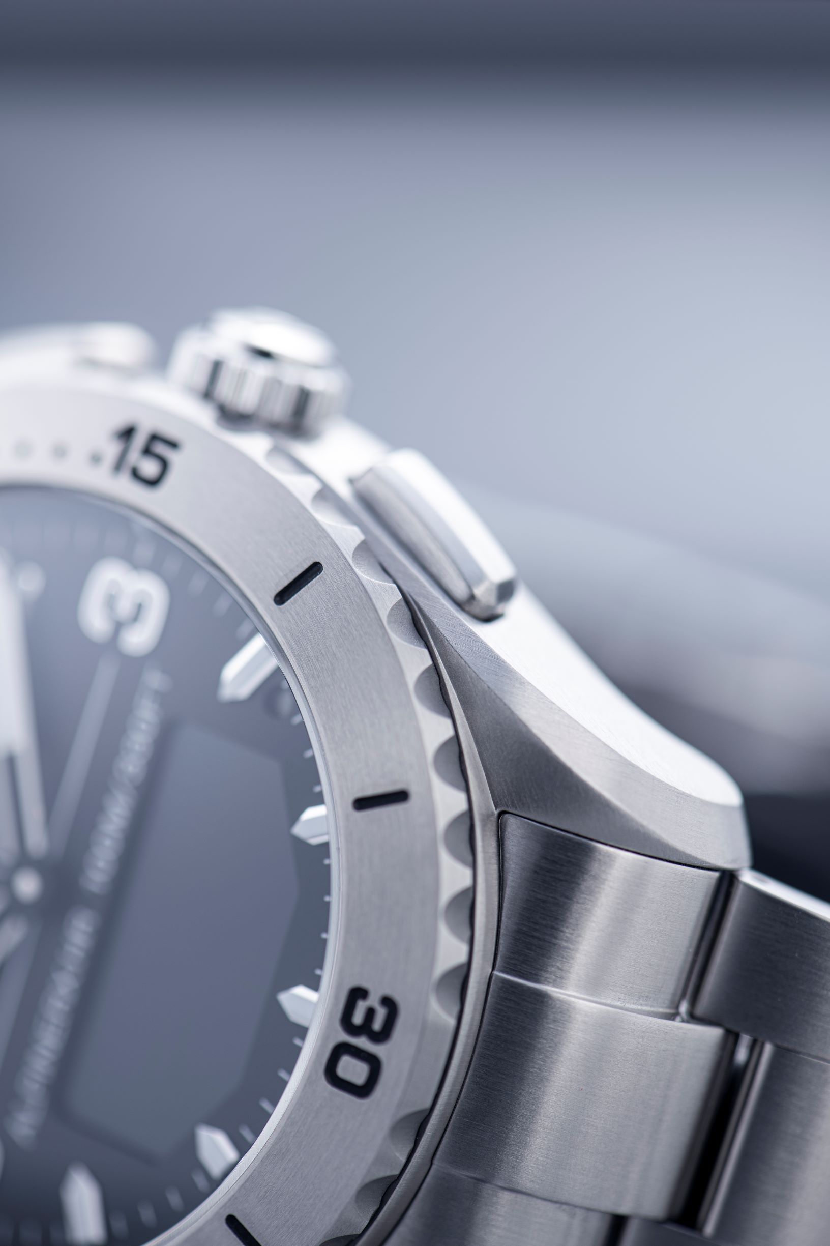 Le troisième, quant à lui, affiche son appel du large avec un cadran bleu nuit. Il s’agit de la seule montre dont le boîtier en titane est habillé d’un bracelet en caoutchouc. Également bleu, celui-ci renforce l’orientation sport de la pièce.